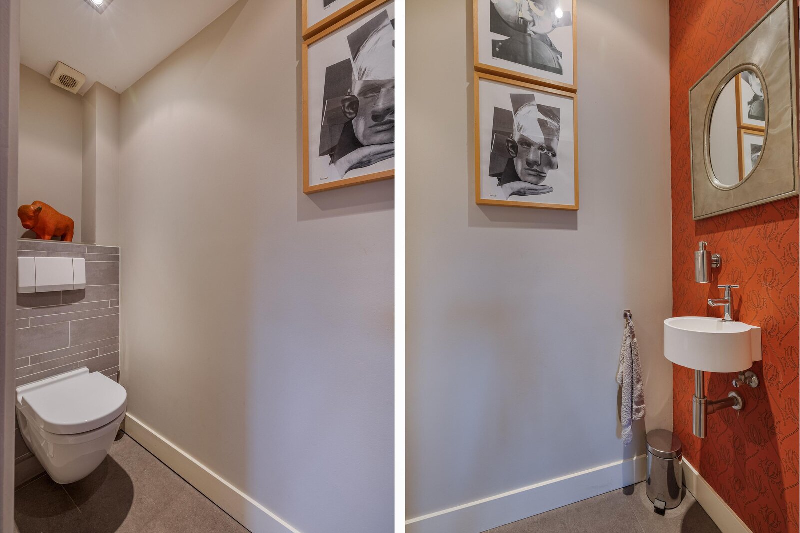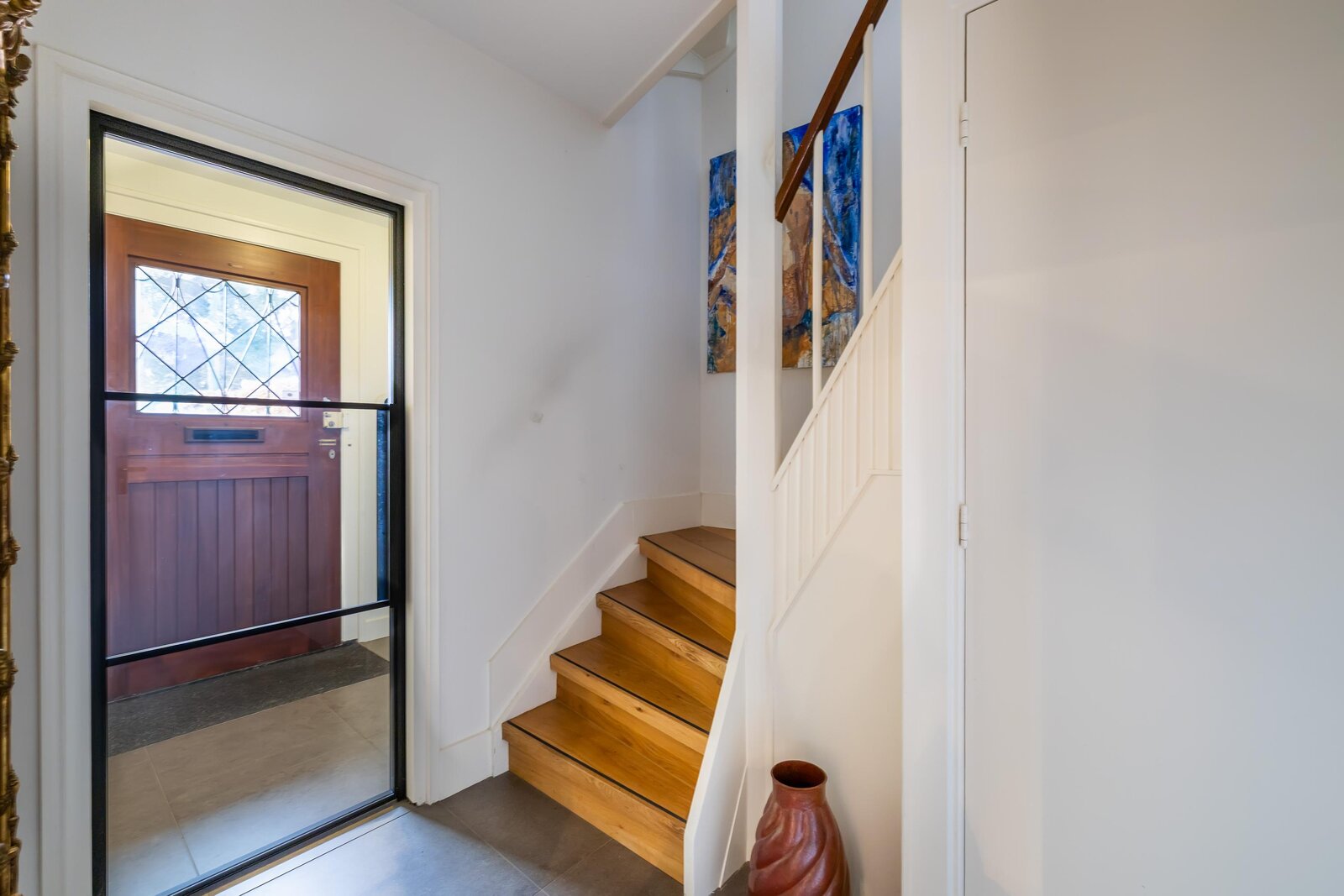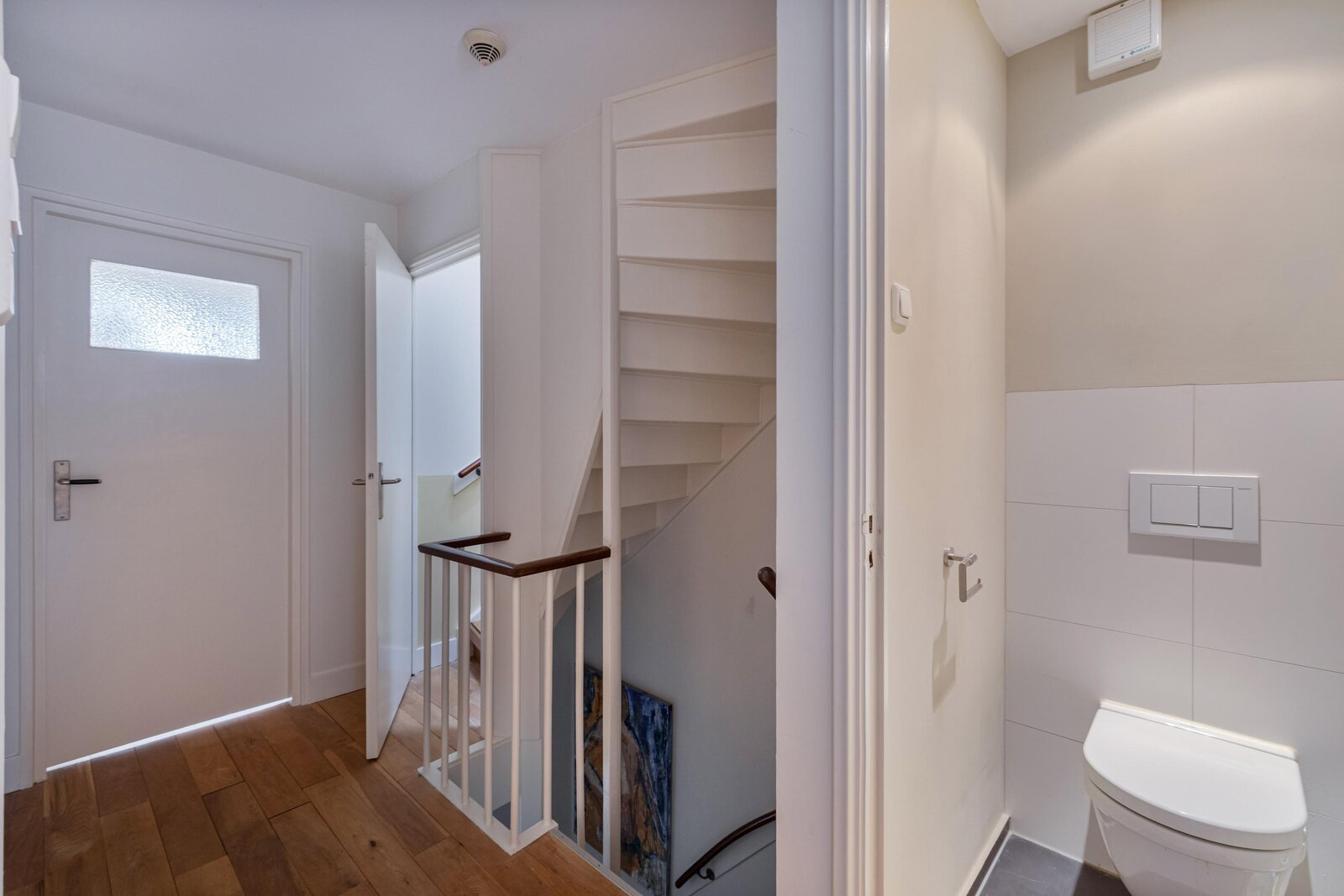 Entree, hal, trap naar de kelder, modern royaal toilet met fontein, deur naar de woonkamer.