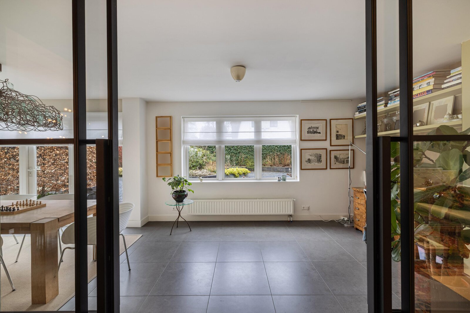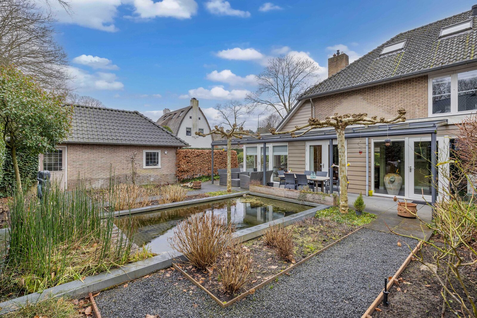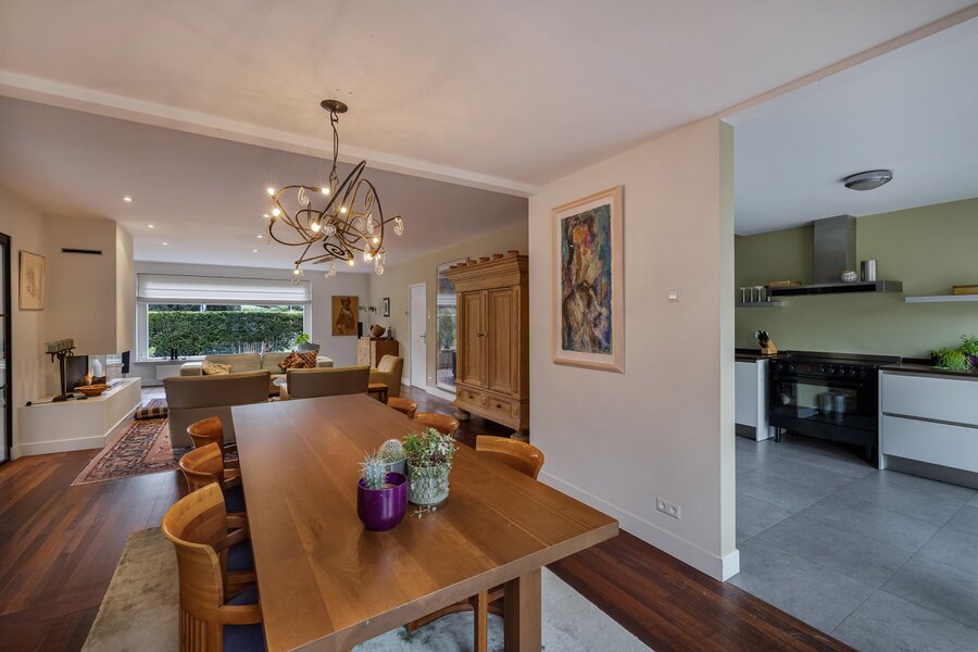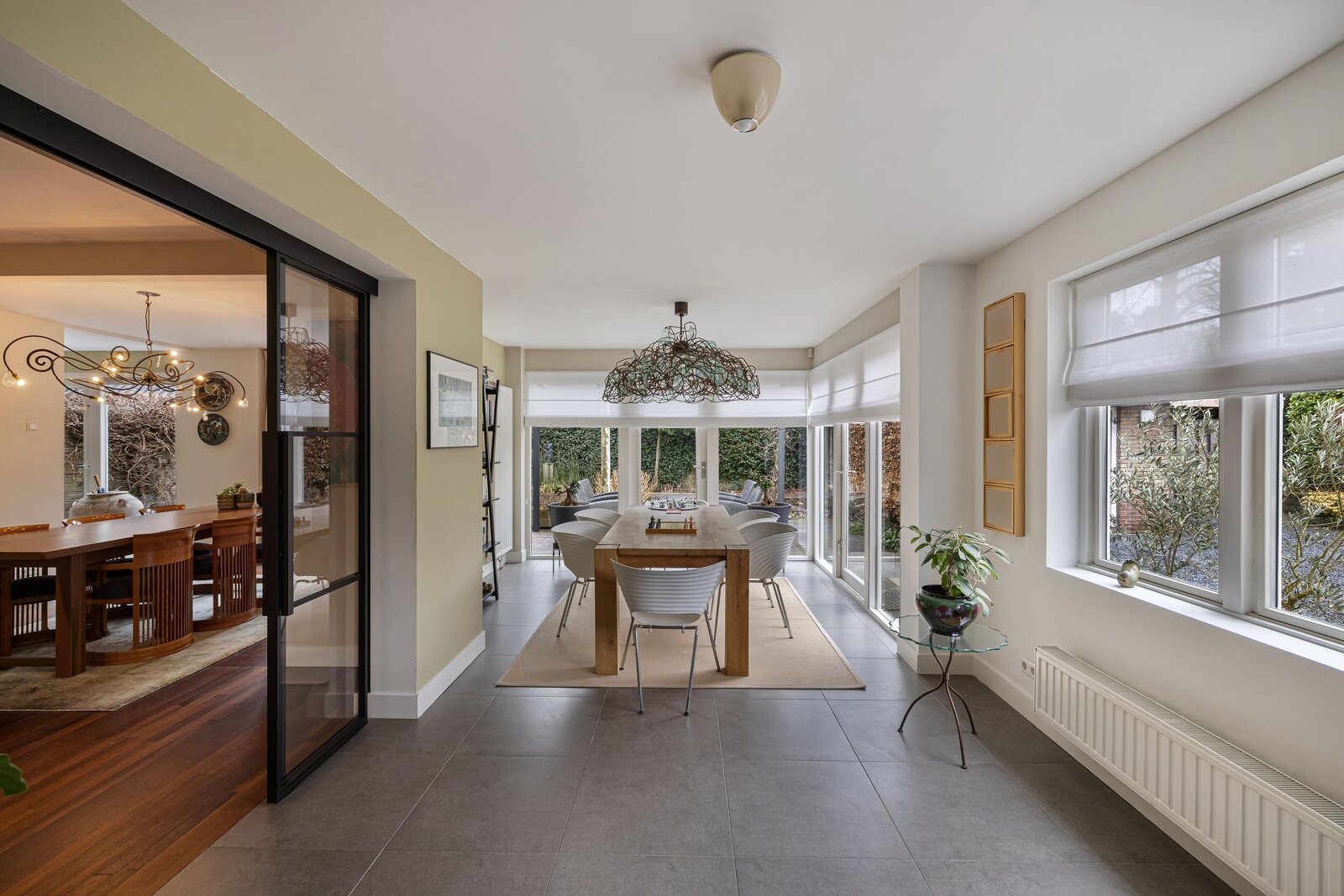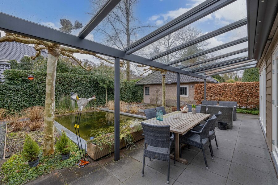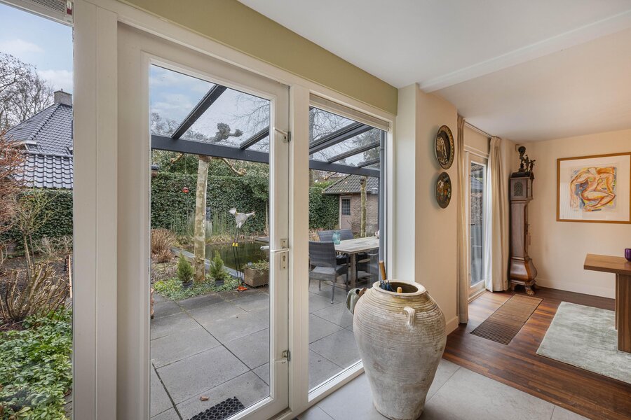 Vanuit de woonkamer is de gemoderniseerde aangebouwde 2de eetkamer te betreden. Deze ruimte heeft een prachtige uitstraling, is zeer licht door zijn vele glas en heeft deuren naar de zij- en achtertuin