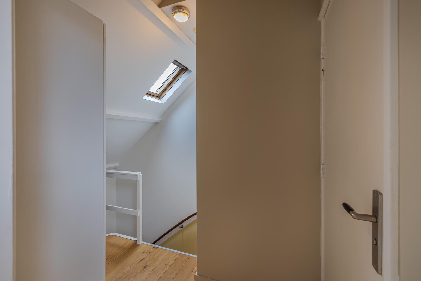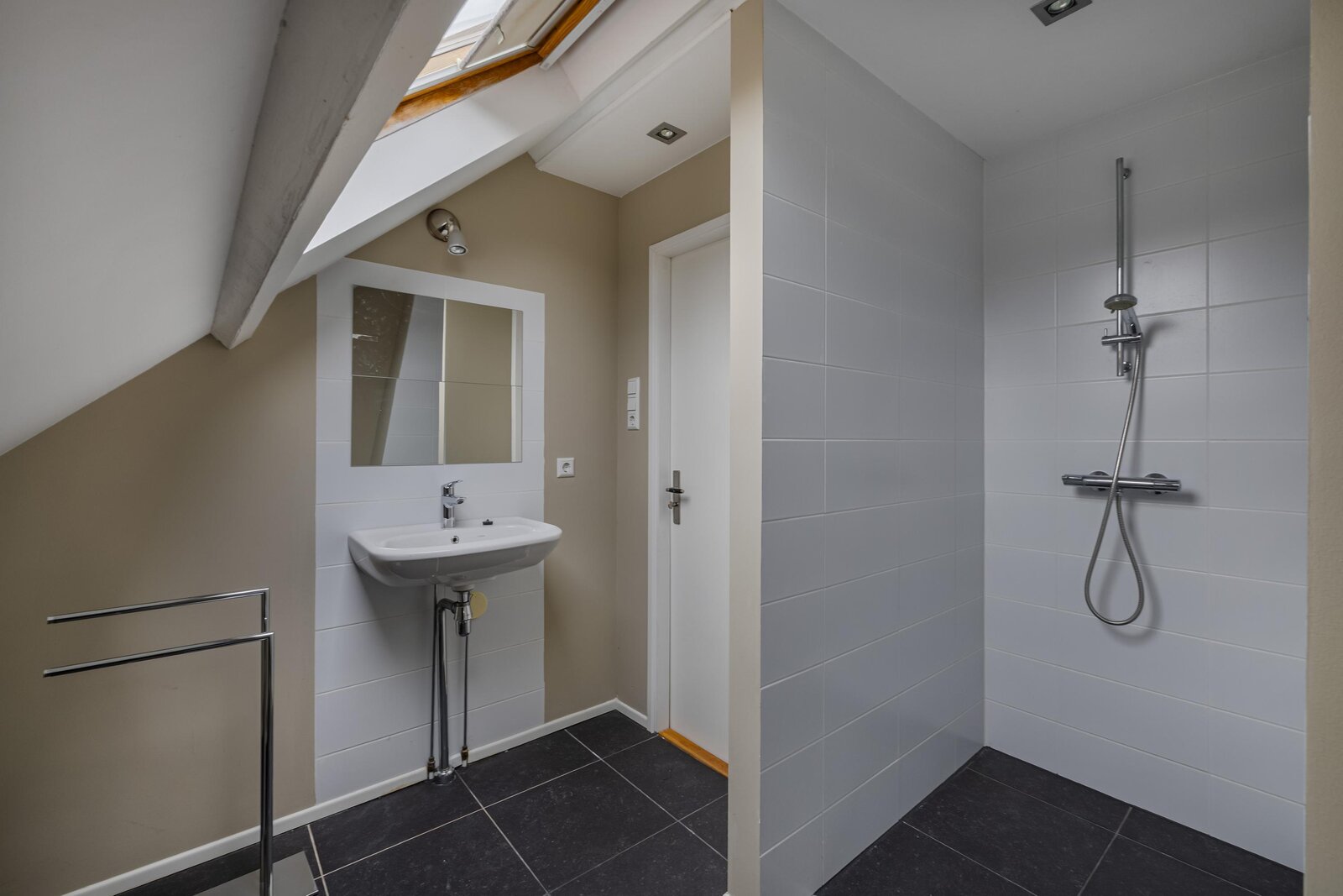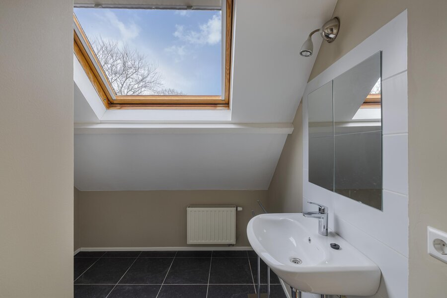 overloop met opstelling van de nieuwe CV ketel uit 2025, 2e badkamer met inloopdouche, wastafel en dakraam, ruime slaapkamer met dakraam.