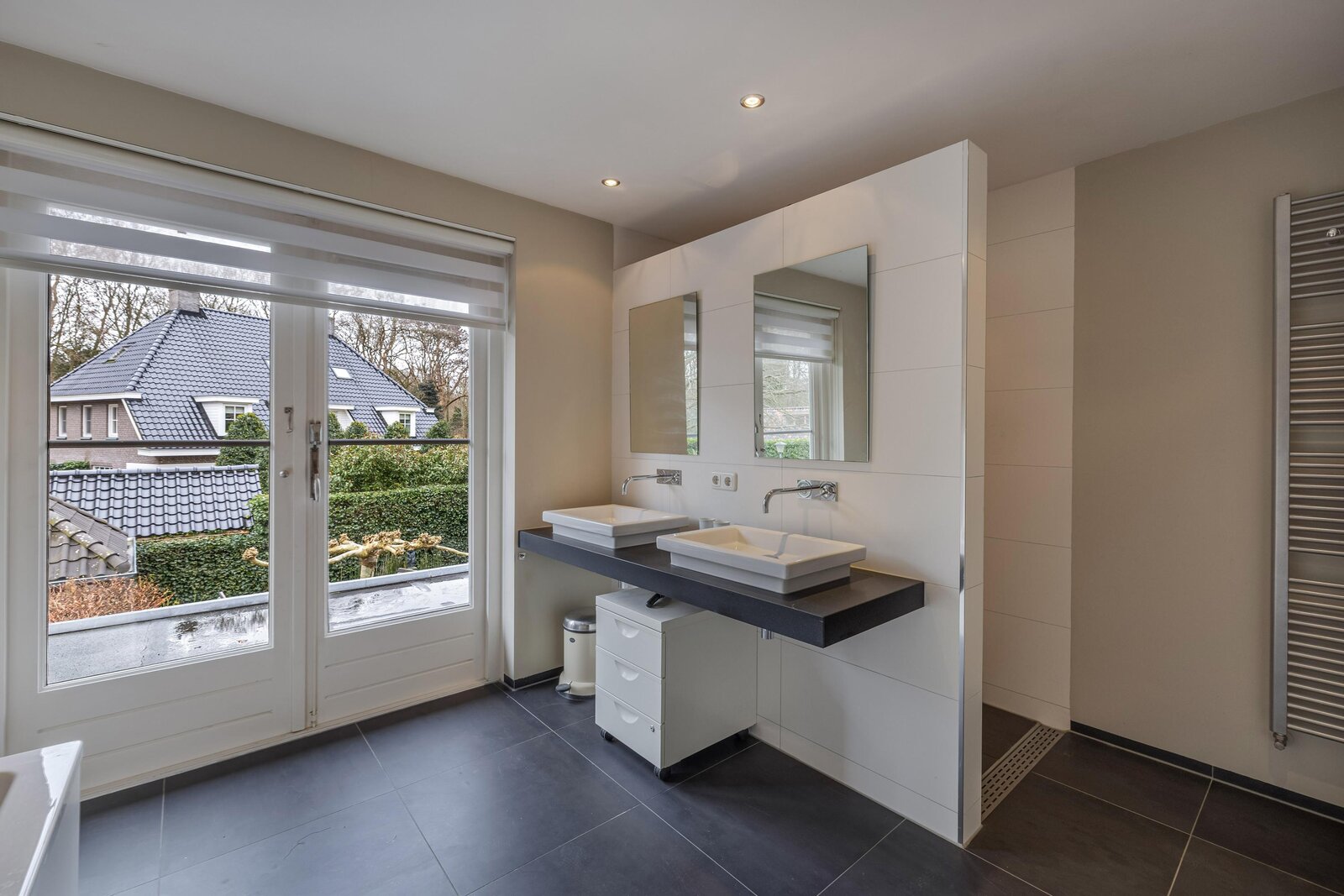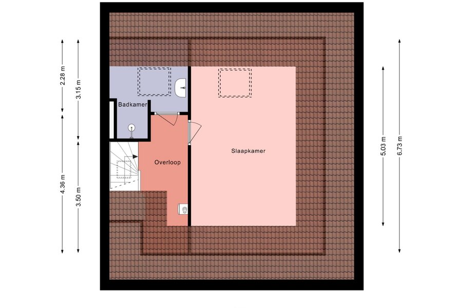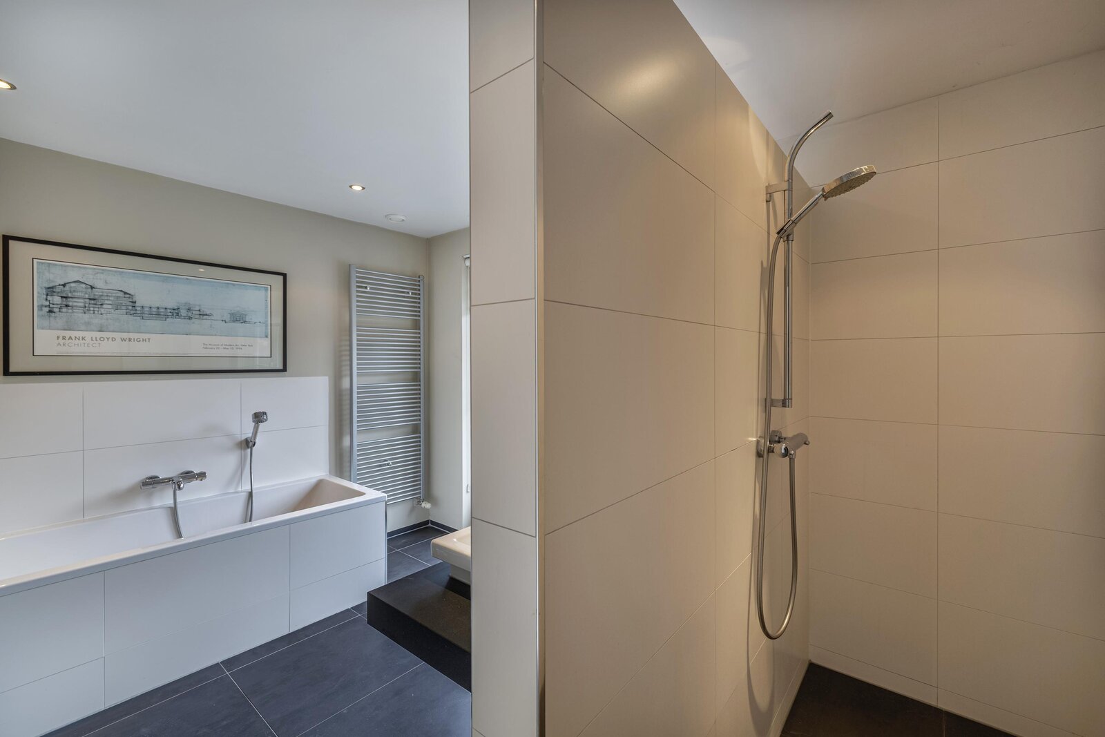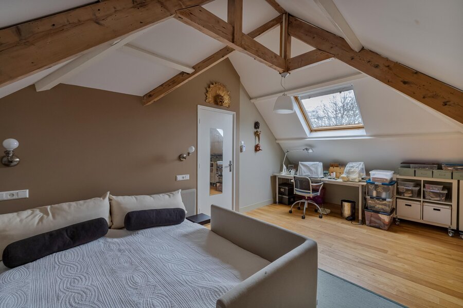 overloop met opstelling van de nieuwe CV ketel uit 2025, 2e badkamer met inloopdouche, wastafel en dakraam, ruime slaapkamer met dakraam.
