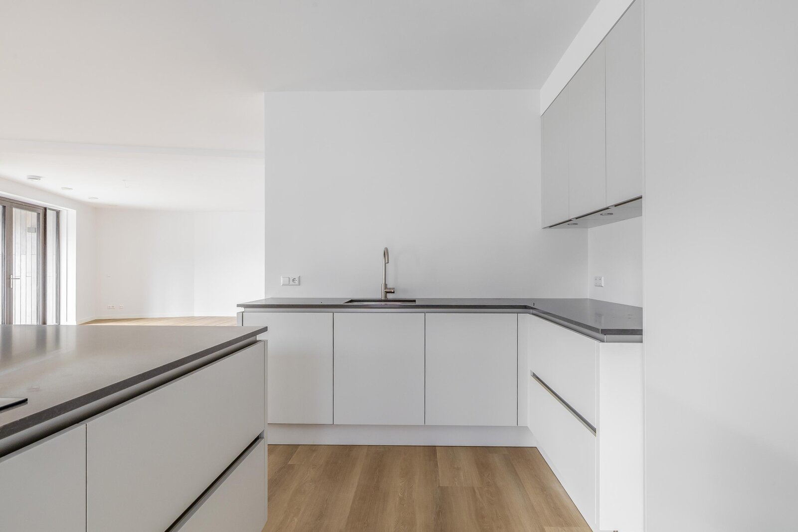 The open-plan kitchen is modern and stylish, featuring a large cooking island with integrated hob and extractor, a built-in oven and ample storage and workspace. An ideal setting for cooking, dining and entertaining.