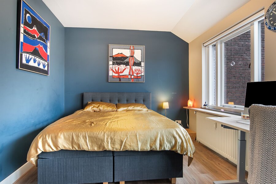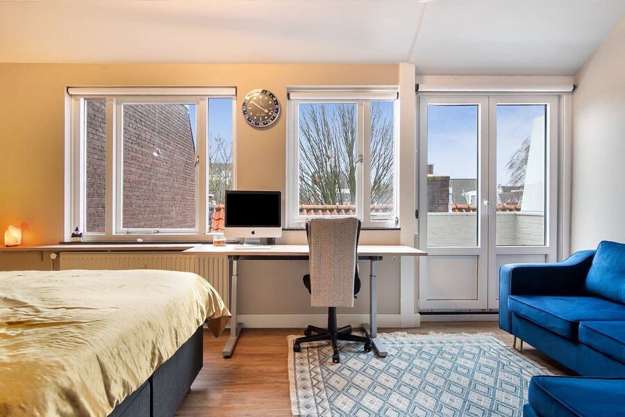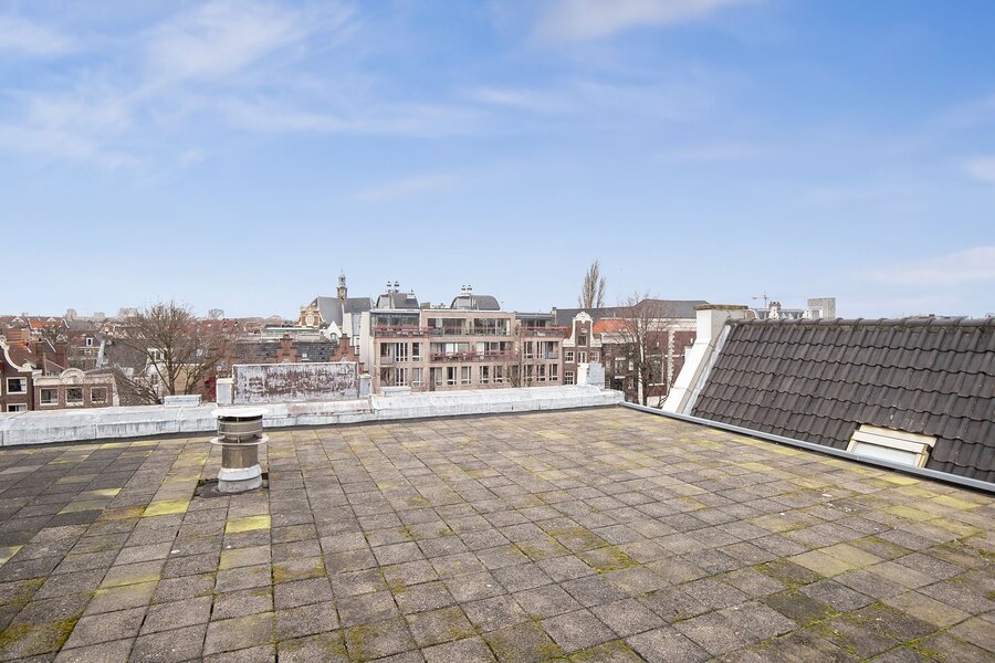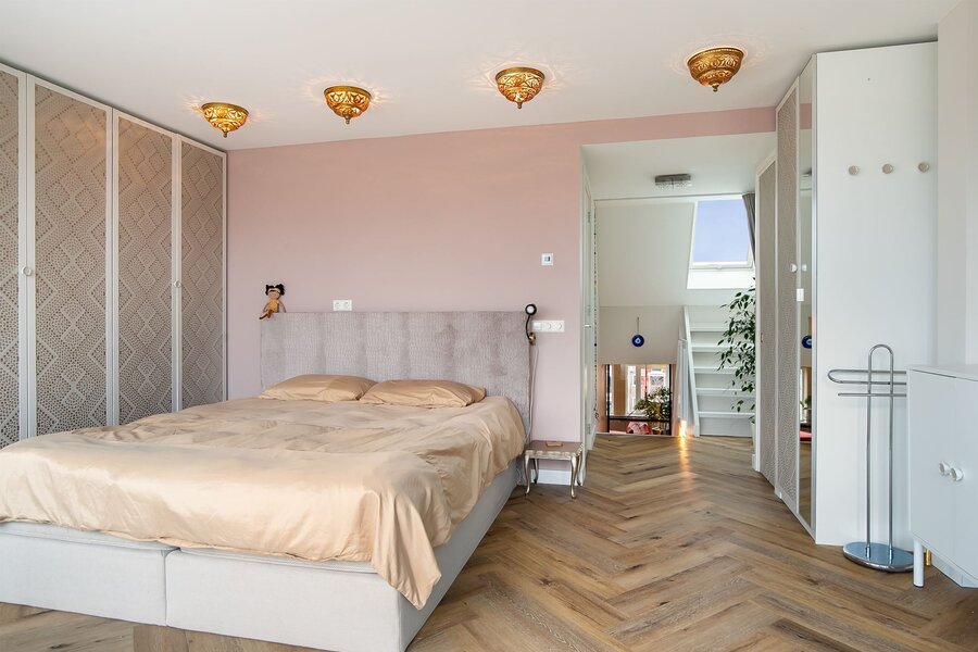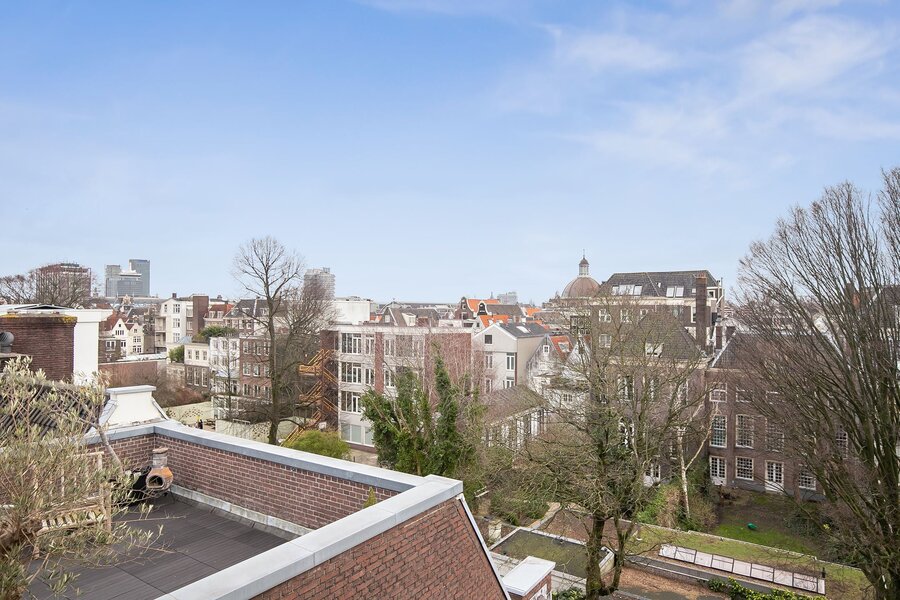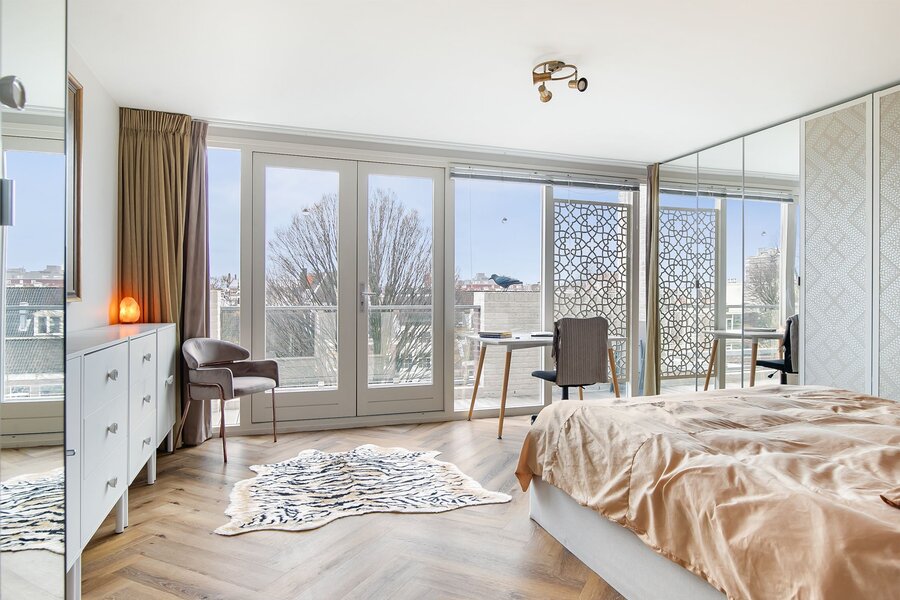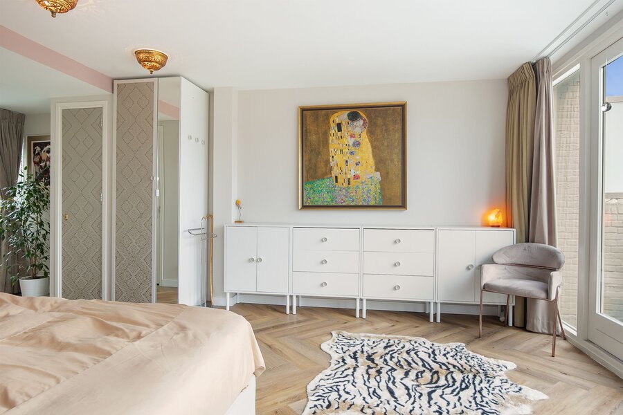 De slaapkamer is royaal opgezet en voorzien van veel natuurlijk daglicht inval met dank aan de vele raampartijen. Ook kun je vanuit hier naar het woningbrede balkon met prachtig uitzicht op onder meer het Paleis op de Dam. Met directe toegang tot een terras en een ensuite badkamer die uitnodigt tot ontspanning.