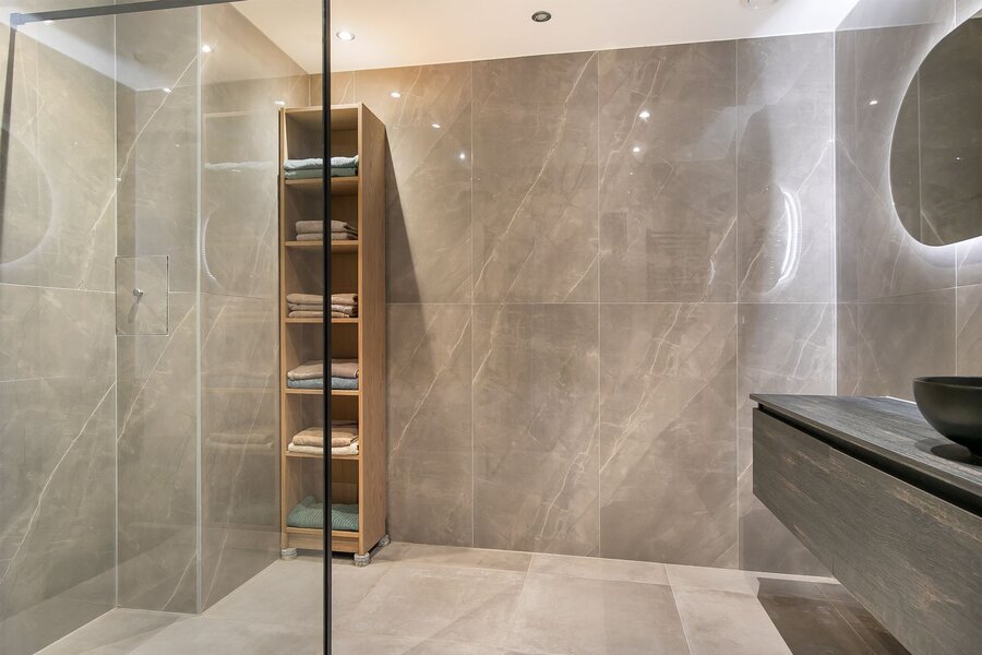 Deze badkamer is afgewerkt met lichte, marmerlook vloer- en wandtegels. Tevens is de badkamer voorzien van een wastafelmeubel, radiator en glazen douchecabine.