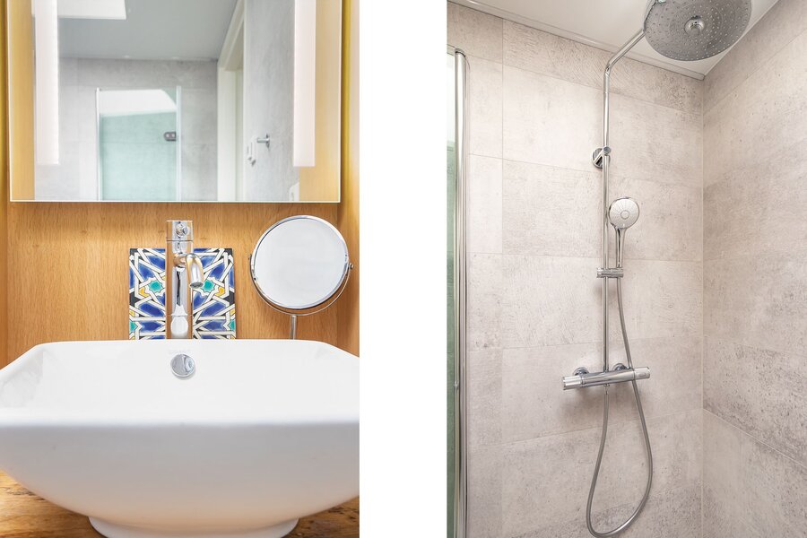Een extra laag van comfort vind je op de eerste verdieping, met nog een slaapkamer die baadt in het licht en een eigen badkamer heeft. Deze badkamer is afgewerkt met grijze vloer- en wandtegels. Ook is de badkamer voorzien van een zwevend toilet, wastafelmeubel en een douche.