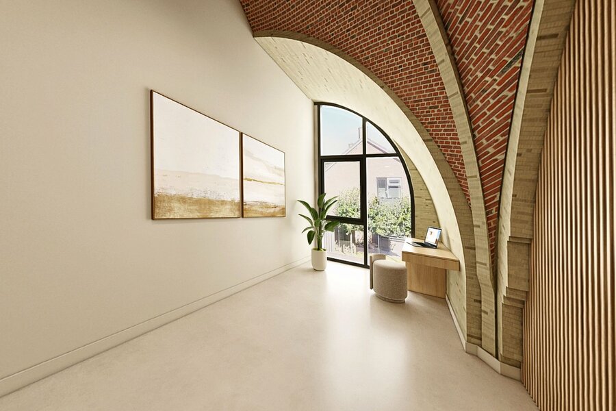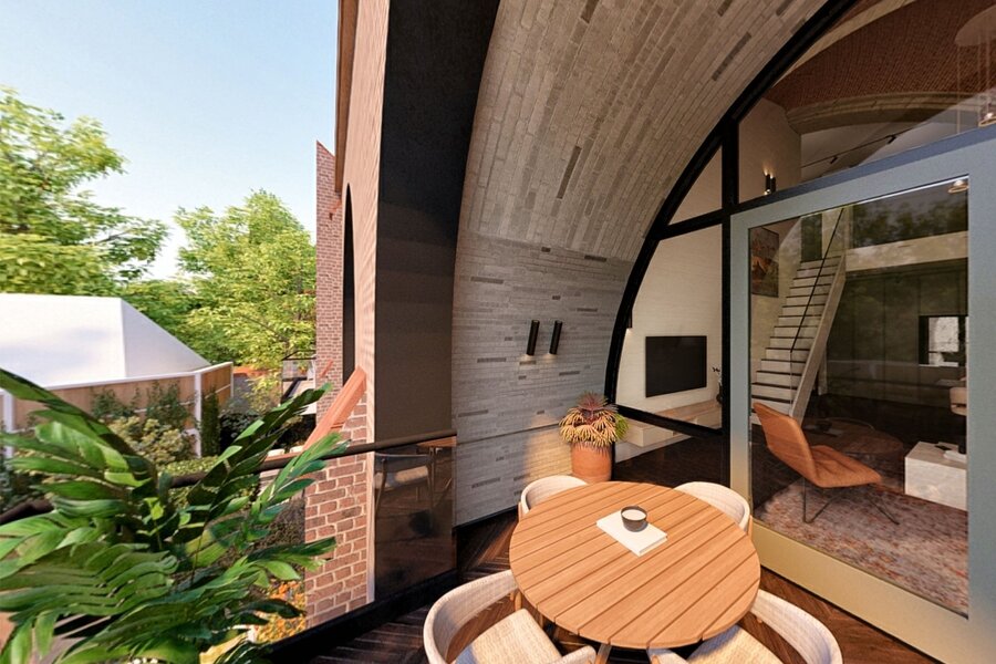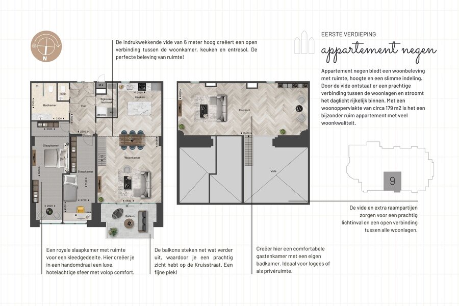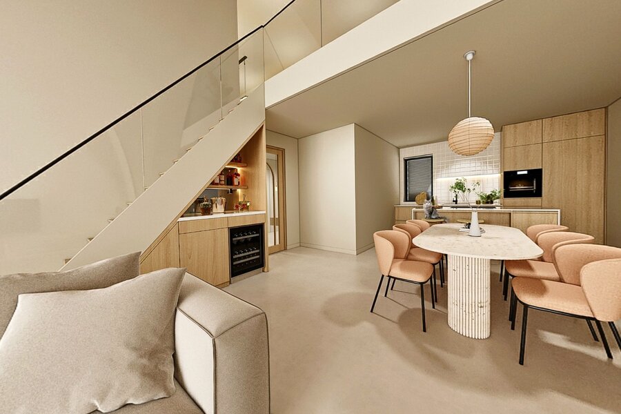 Appartement negen combineert ruimte, licht en een slimme indeling met een indrukwekkende vide van ruim 6 meter hoog. De open verbinding tussen de woonlagen, grote raampartijen en het balkon maken dit appartement tot een lichte, uitnodigende woonplek – met volop gebruiksmogelijkheden.