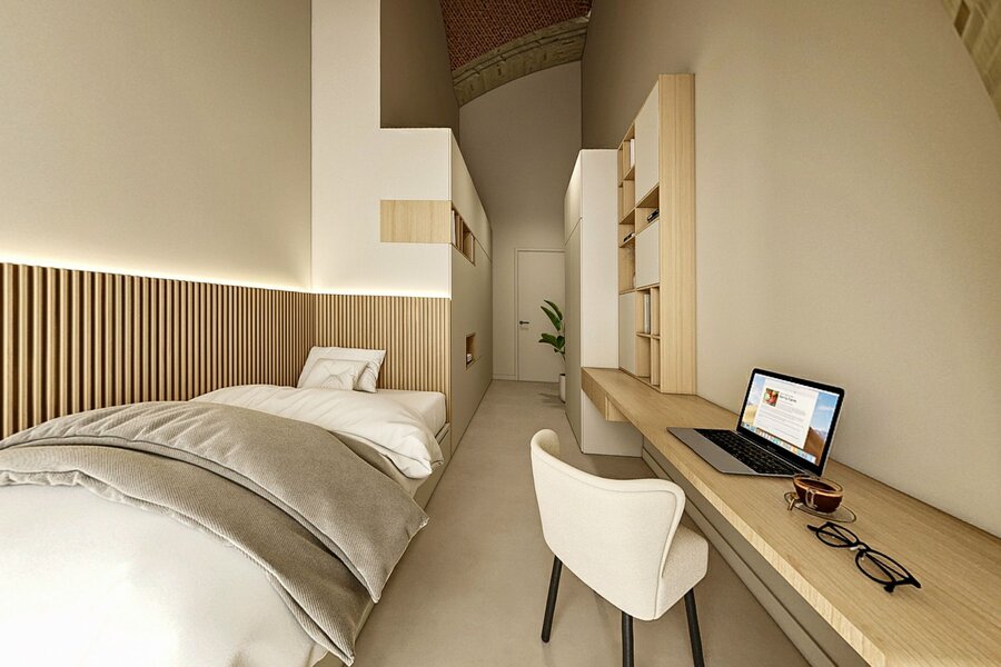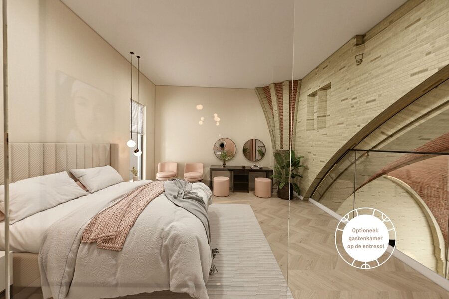 De vide zorgt voor hoogte en verbinding. De entresol kijkt uit over de woonruimte en het balkon, wat bijdraagt aan het gevoel van openheid. Deze extra verdieping is uitstekend geschikt voor een tweede zithoek, werkgedeelte of logeerkamer. De doorkijk van boven versterkt de ruimtelijkheid in huis.