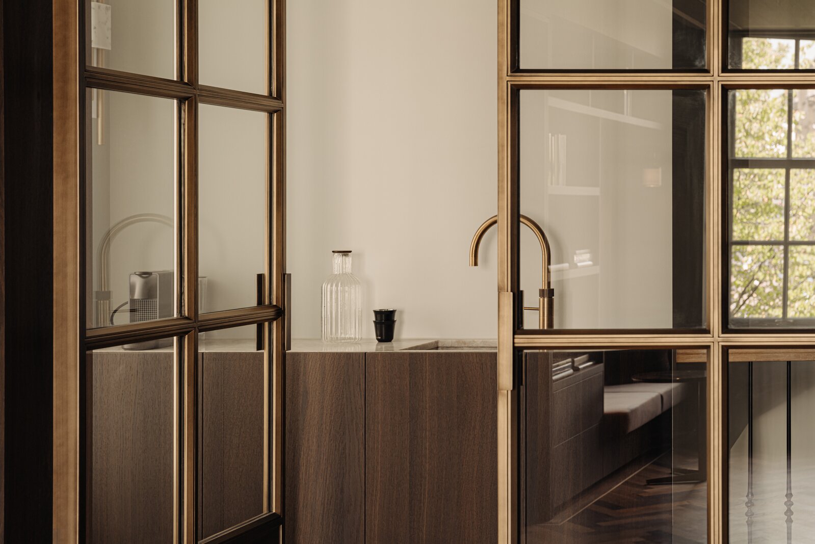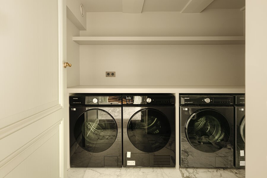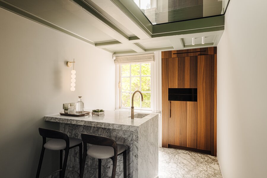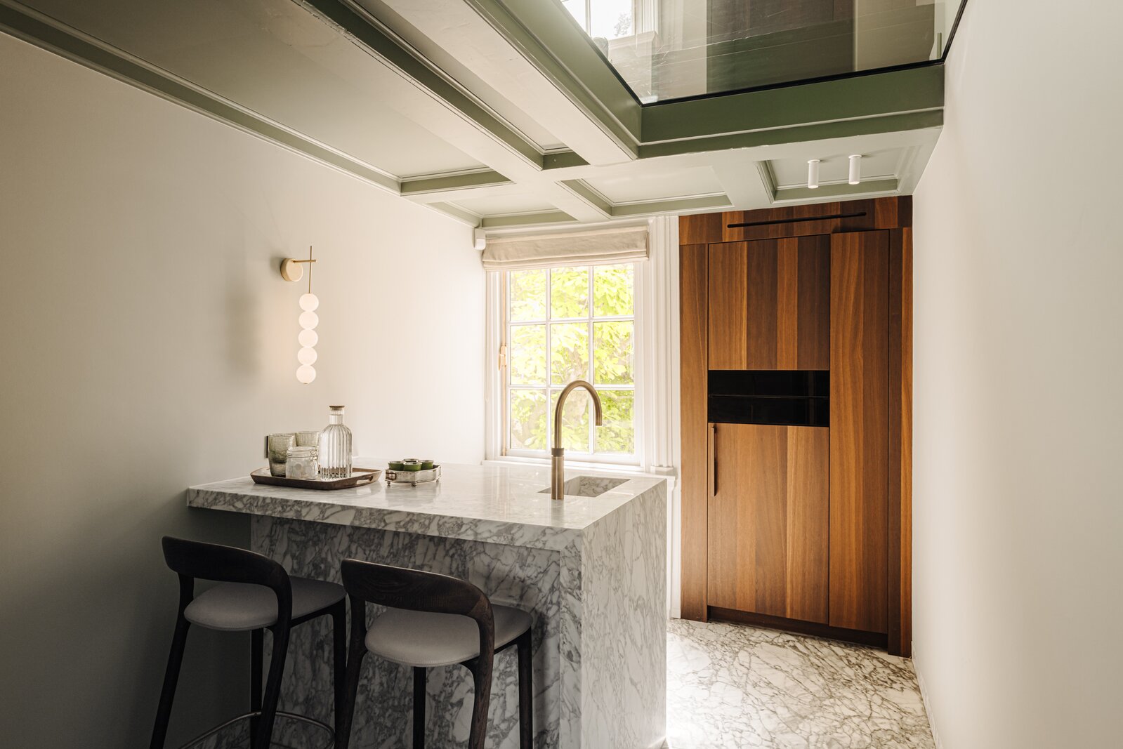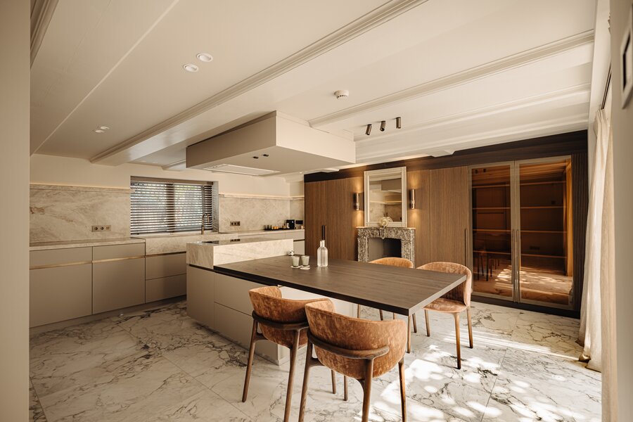 Via de aparte entree aan de Spiegelstraat leidt een klassieke marmeren hal naar alle vertrekken. De ruime woonkeuken met veel lichttoetreding is voorzien van diverse luxe inbouwapparatuur en een marmeren werkblad. Vanuit de keuken zijn zowel de wijnkelder als de prachtig aangelegde achtertuin bereikbaar via openslaande deuren. Daarnaast bevinden zich op deze verdieping een royale waskamer, een technische ruimte en een gasten wc.