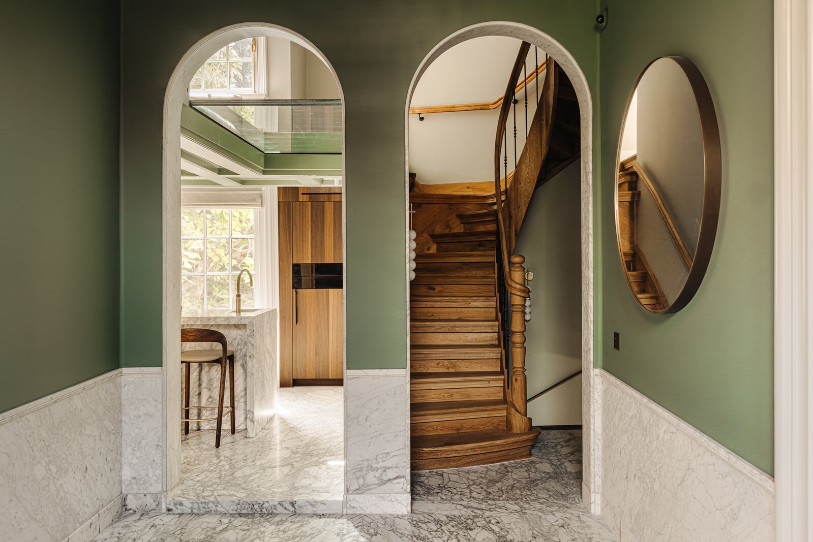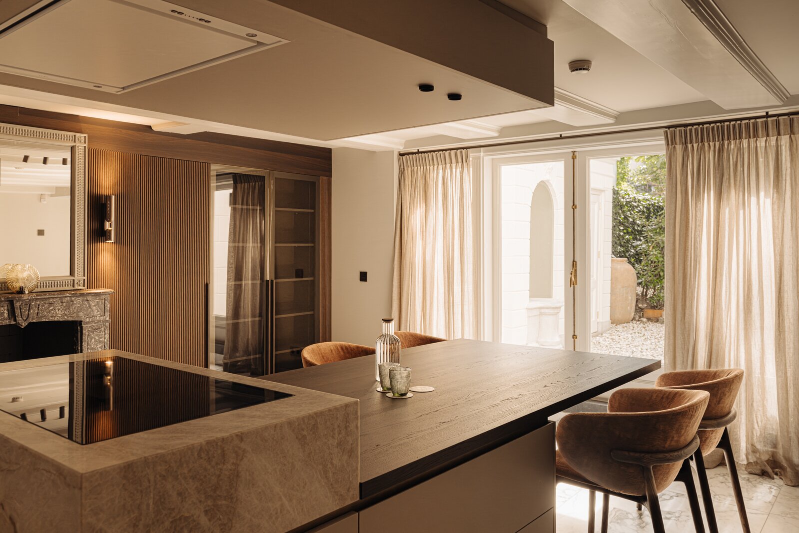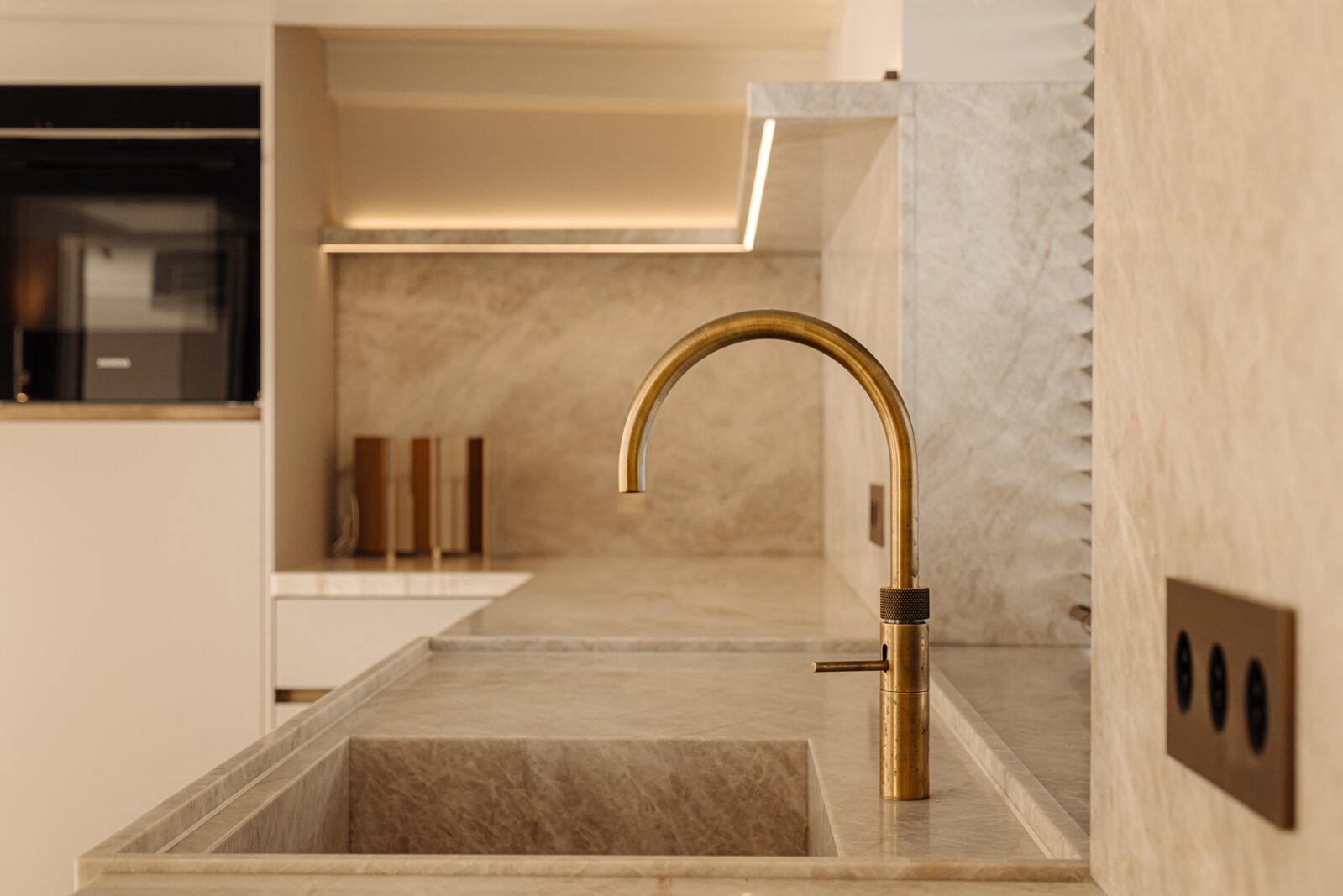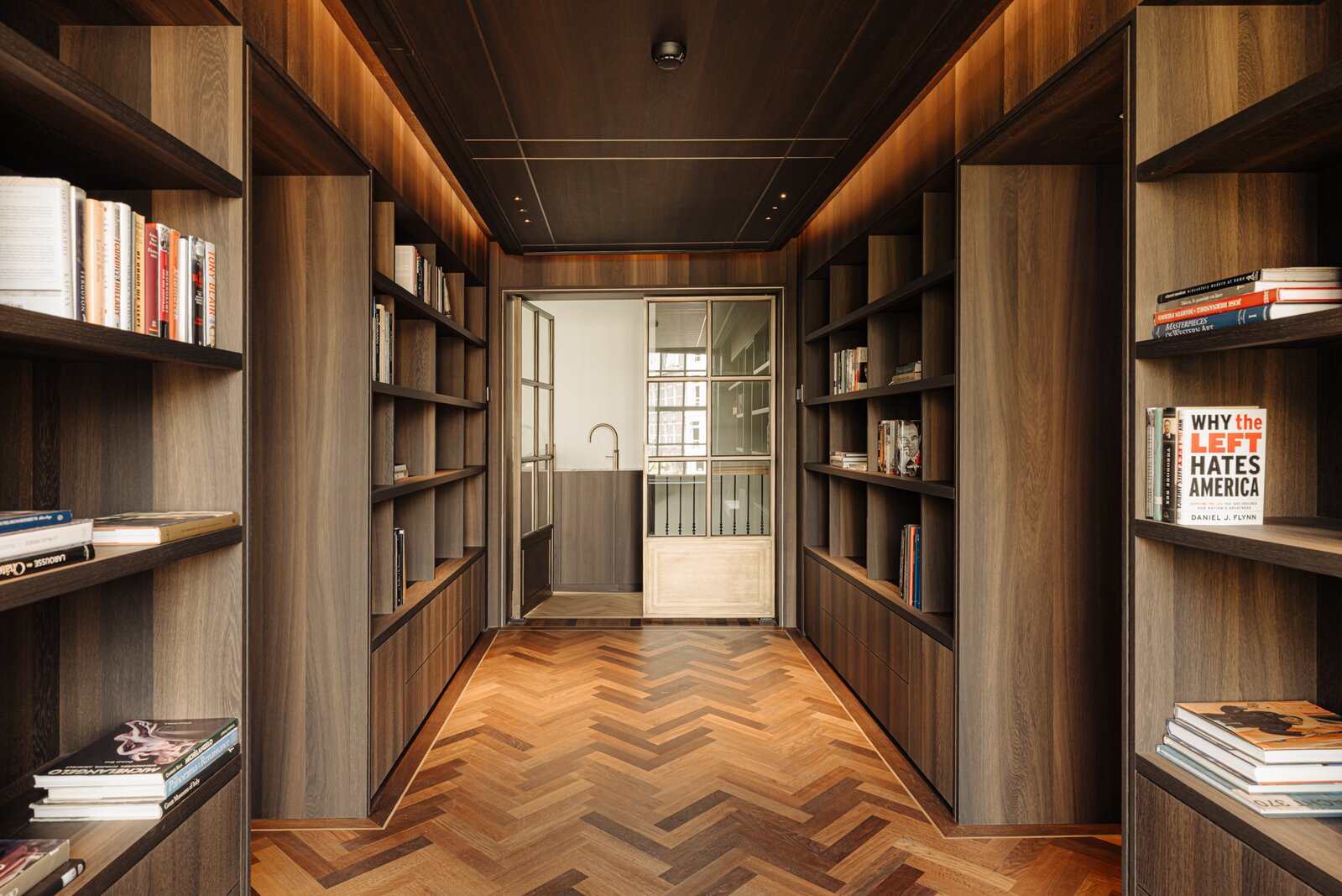 Via de aparte entree aan de Spiegelstraat leidt een klassieke marmeren hal naar alle vertrekken. De ruime woonkeuken met veel lichttoetreding is voorzien van diverse luxe inbouwapparatuur en een marmeren werkblad. Vanuit de keuken zijn zowel de wijnkelder als de prachtig aangelegde achtertuin bereikbaar via openslaande deuren. Daarnaast bevinden zich op deze verdieping een royale waskamer, een technische ruimte en een gasten wc.