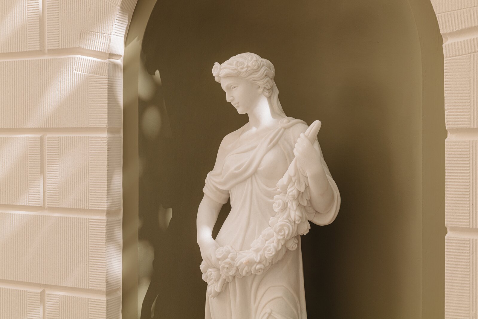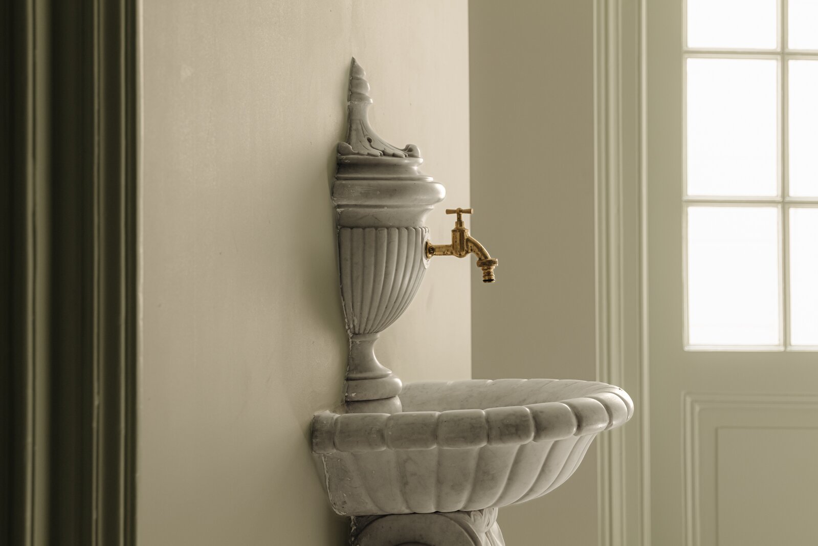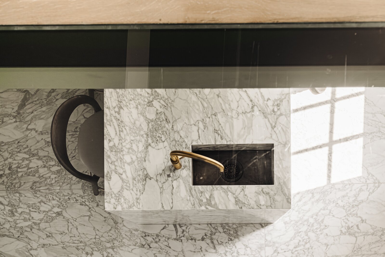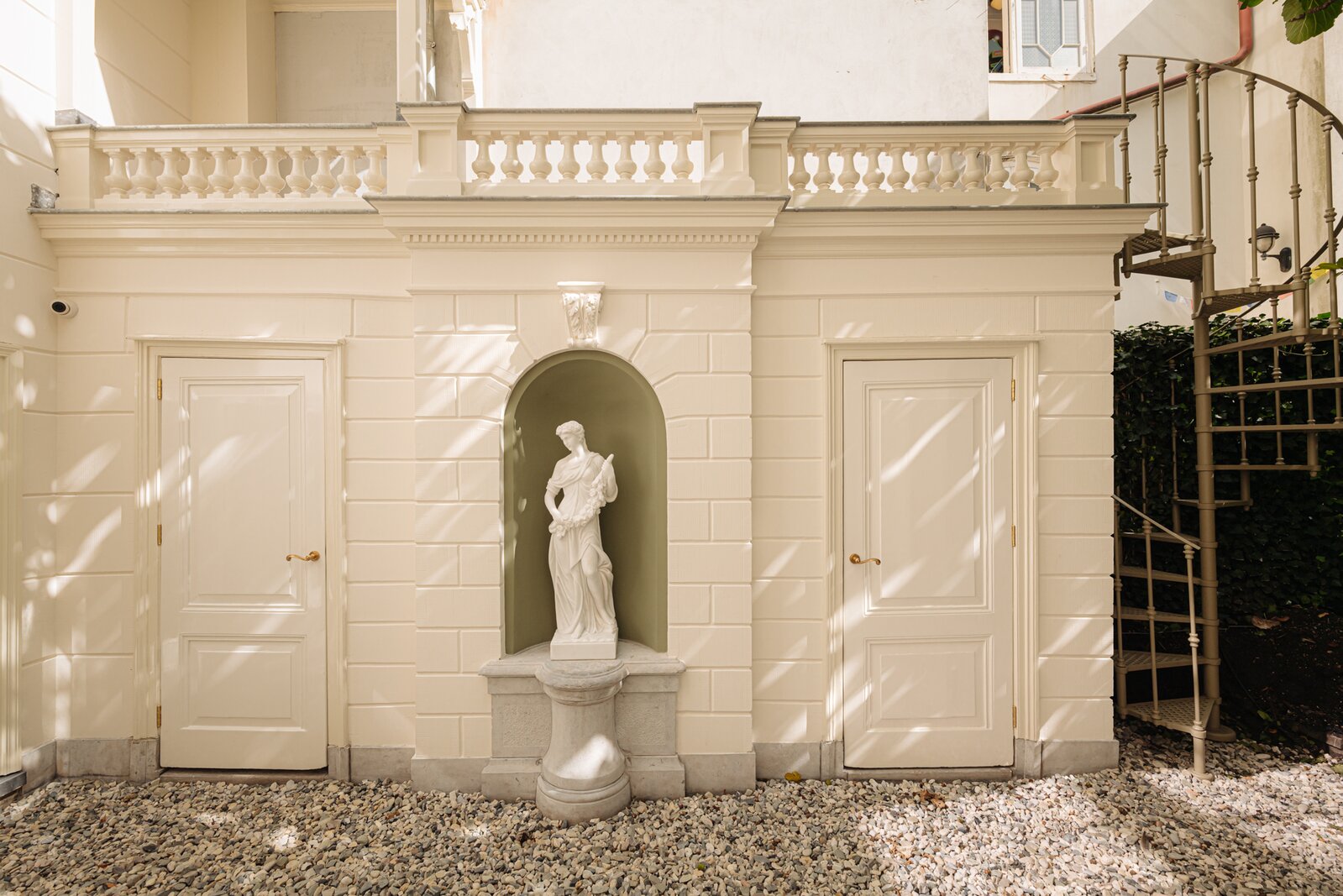 Via de aparte entree aan de Spiegelstraat leidt een klassieke marmeren hal naar alle vertrekken. De ruime woonkeuken met veel lichttoetreding is voorzien van diverse luxe inbouwapparatuur en een marmeren werkblad. Vanuit de keuken zijn zowel de wijnkelder als de prachtig aangelegde achtertuin bereikbaar via openslaande deuren. Daarnaast bevinden zich op deze verdieping een royale waskamer, een technische ruimte en een gasten wc.