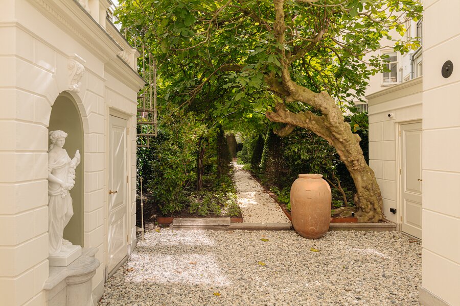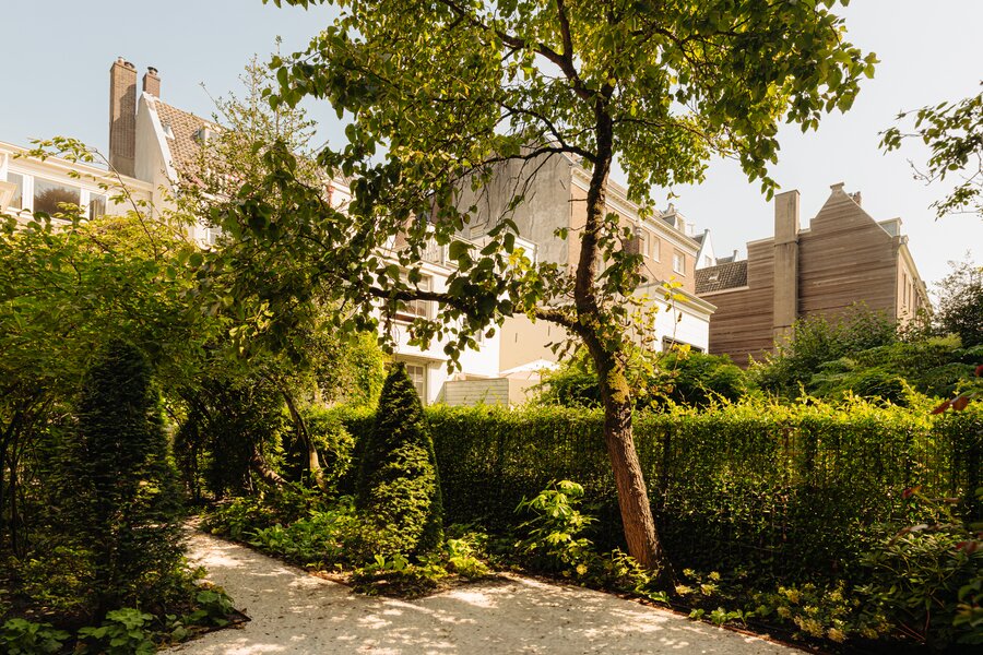 De charmante, diepe tuin van ca 246m² is rijk aan bomen en planten en vormt een rustige, idyllische buitenruimte midden in de stad.