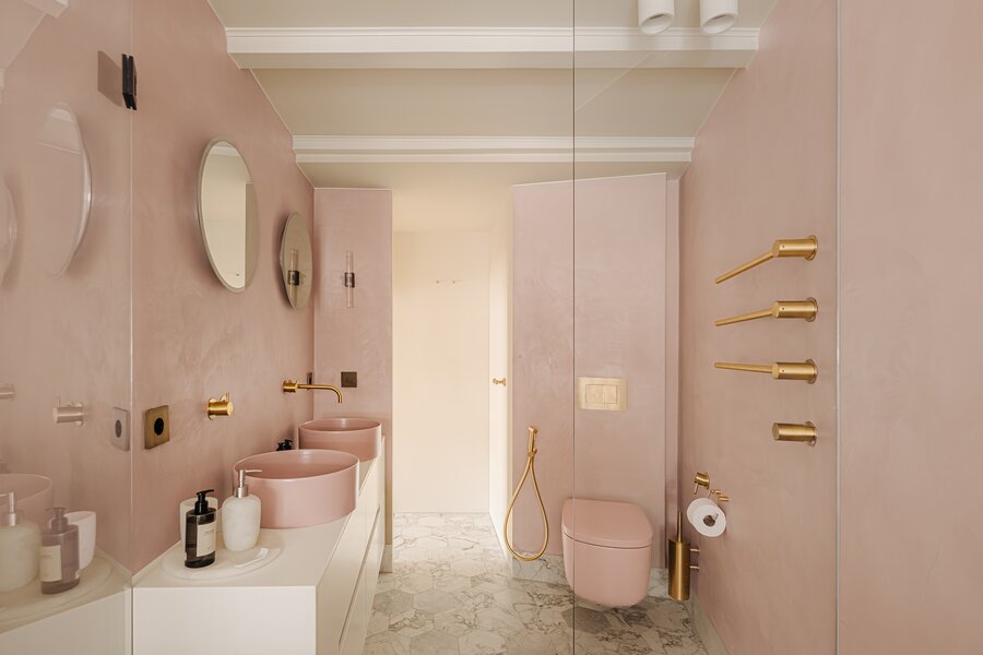 Op de eerste verdieping bevinden zich twee ruime master slaapkamers en een stijlvol ingerichte hal met marmeren vloer en ingebouwde kasten. Iedere slaapkamer heeft een eigen en-suite badkamer met inloopdouche, dubbele wastafel met meubel en separate wc.