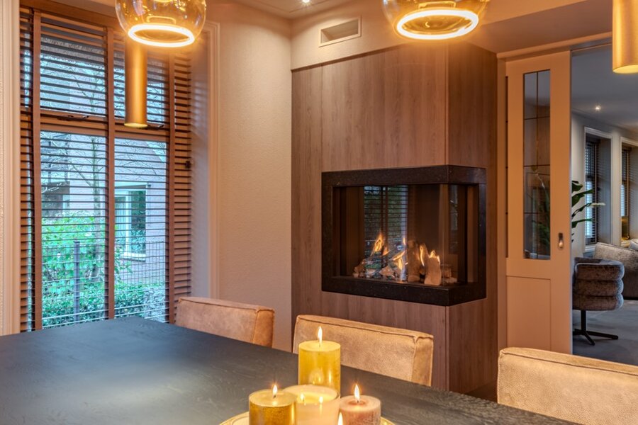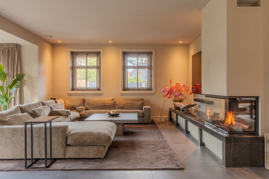 -Royale woonkamer met veel lichtinval en open haard