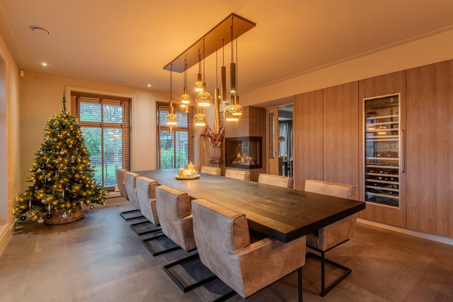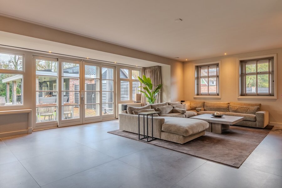 De woonkamer is een royale, lichte ruimte met grote raampartijen die zorgen voor een prachtige natuurlijke lichtinval. De zithoek is sfeervol ingericht rond de open haard, met een comfortabele loungebank. Daarnaast zijn er twee extra zitjes en een intieme ronde tafel, ideaal voor gezellige diners of extra zitgelegenheid. Subtiele raambekleding en warme kleuren versterken de uitnodigende sfeer. Vanuit elke hoek geniet u van een schitterend uitzicht op de tuin, en via de openslaande deuren loopt u moeiteloos het terras op, waardoor binnen en buiten naadloos in elkaar overlopen.