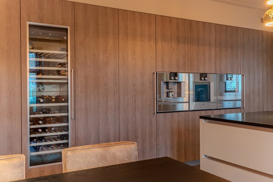 Via de in de muur weggewerkte schuifdeuren bereikt u de leefkeuken, het hart van de villa. Deze luxe riante leefkeuken kan volledig worden afgesloten van de living, waardoor u zowel samen kunt zijn als de ruimte apart kunt benutten. De keuken beschikt over een lange eettafel voor tien personen, een kastenwand met klimaatkast en hoogwaardige Gaggenau-apparatuur, waaronder een kookeiland, inbouwovens en koffiemachine. Een gashaard zorgt voor extra sfeer en warmte. Dankzij de iets verhoogde ligging van de villa heeft u vanuit de keuken een levendig uitzicht over de omgeving.