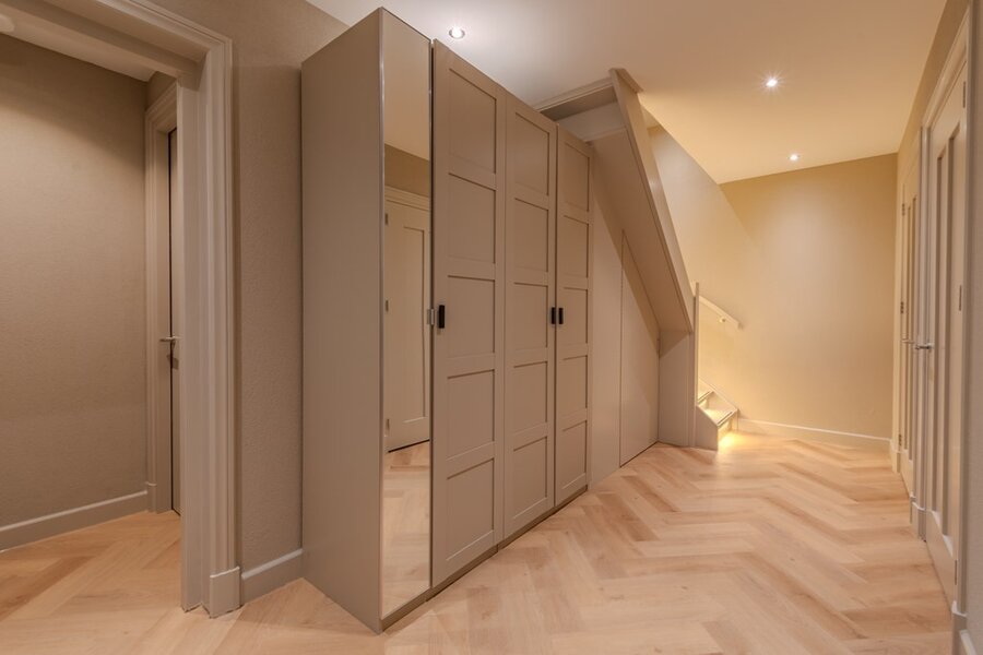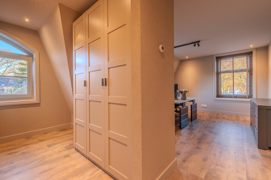 Op de eerste verdieping bevindt zich de hoofdslaapkamer, met een prachtig uitzicht over de tuin. Ook is hier een eigen inloopkast. Aangrenzend is de badkamer, luxe en sereen ingericht met een ligbad, dubbele wastafel en stoomdouche, die een ware wellness-ervaring biedt. Daarnaast zijn er twee grote kamers, flexibel te gebruiken als kantoor, studie of extra slaapkamer. De verdieping is compleet met een royale waskamer, die extra gemak en functionaliteit toevoegt. Overal op deze verdieping zorgen de ruime opzet, overvloedige lichtinval en de indrukwekkende hoogte van de hal voor een open en luchtige sfeer.