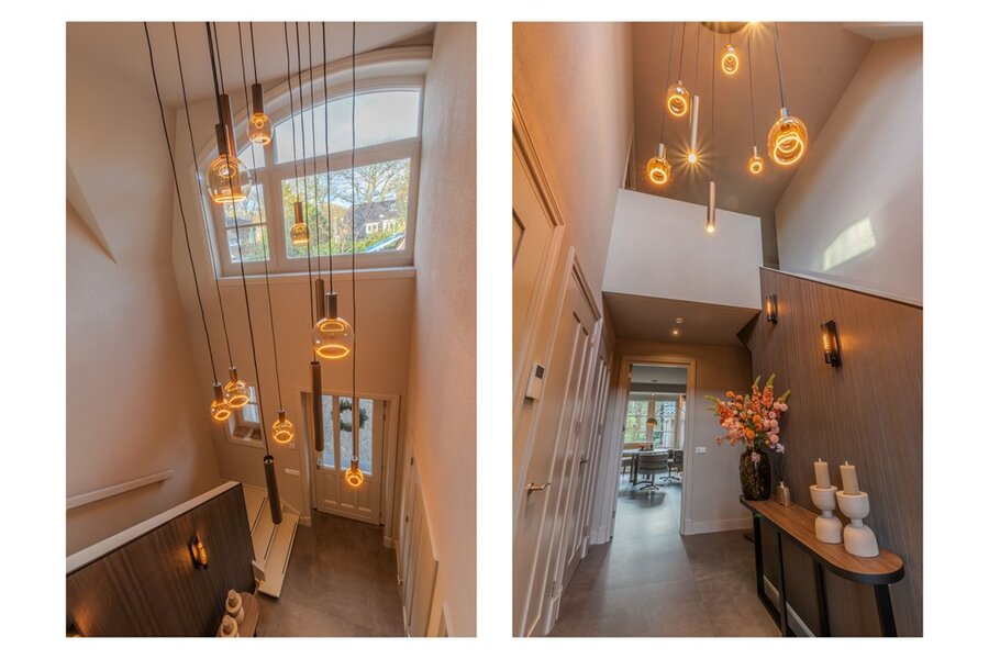 Bij binnenkomst betreedt u een royale, lichte hal die meteen een gevoel van ruimte en grandeur oproept. De hal is voorzien van een toilet, meterkast, garderobekast en een trap naar de benedenverdieping. Dankzij de hoge plafonds, vide, subtiele sfeerverlichting en stijlvolle afwerking voelt deze entree direct warm en gastvrij.