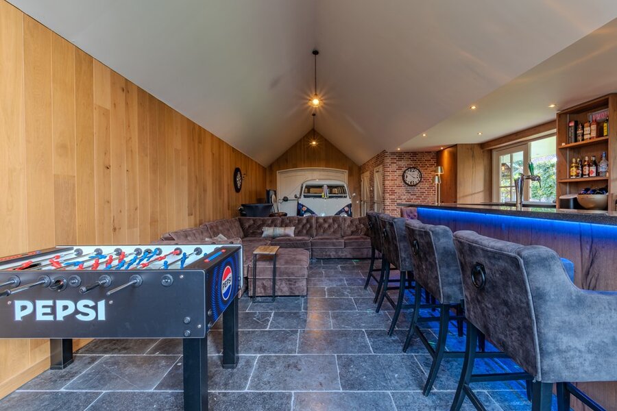 Het tuinhuis is een ware beleving: het beschikt over een volledig ingerichte bar, eigen toiletvoorziening, openslaande deuren voor autostalling en een aparte ruimte voor een werkbank en het opbergen van tuinspullen. Het overdekte terras en de veranda maken het mogelijk het hele jaar door te loungen rond de gashaard, waardoor de woning bijzonder geschikt is voor entertainment en veel ruimte biedt voor iedereen. De diepe achtertuin wordt omringd door hoge bomen, wat een omhullend gevoel van bosrijk wonen versterkt.