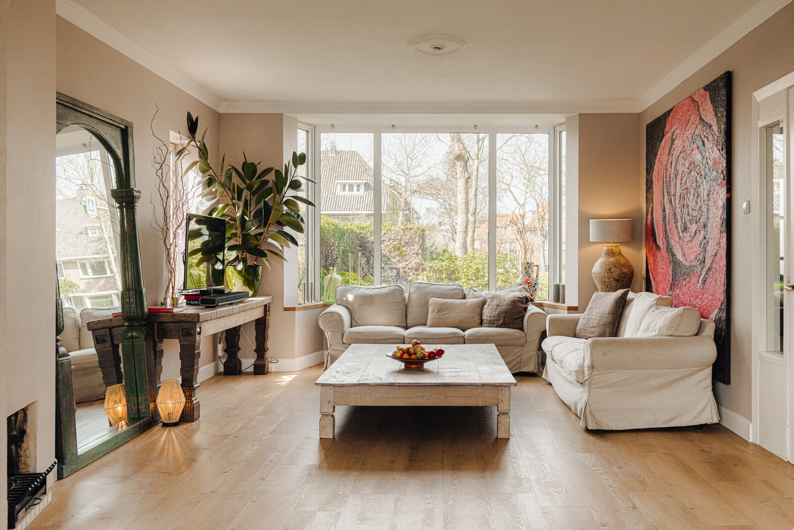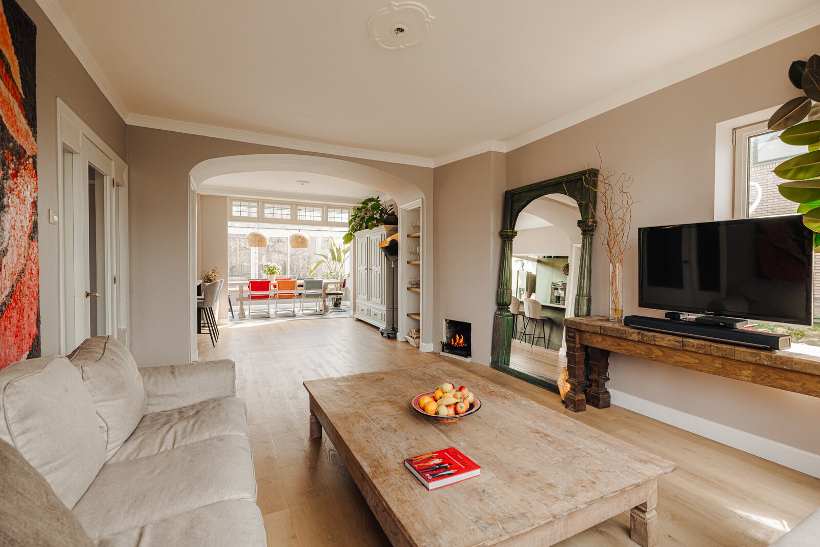 Entree, hal met toilet voorzien van wastafel, meterkast en toegang tot het souterrain. Royale en bijzonder lichte woon-/eetkamer met vaste kasten en sfeervolle open haard.