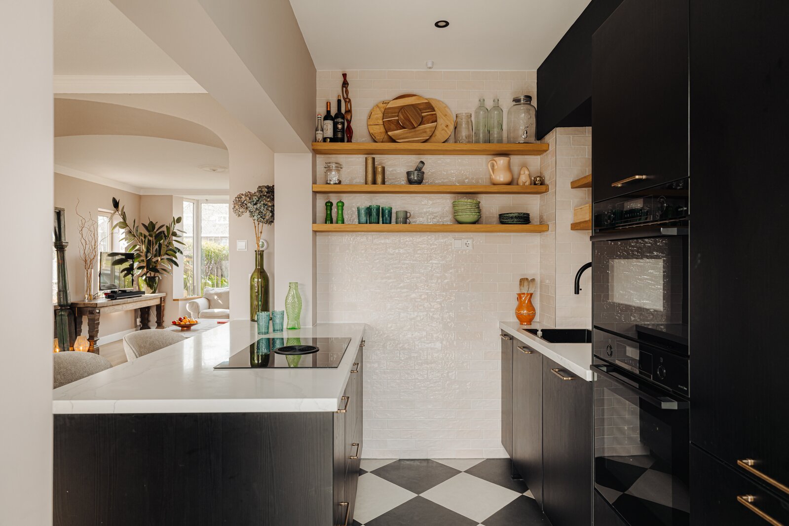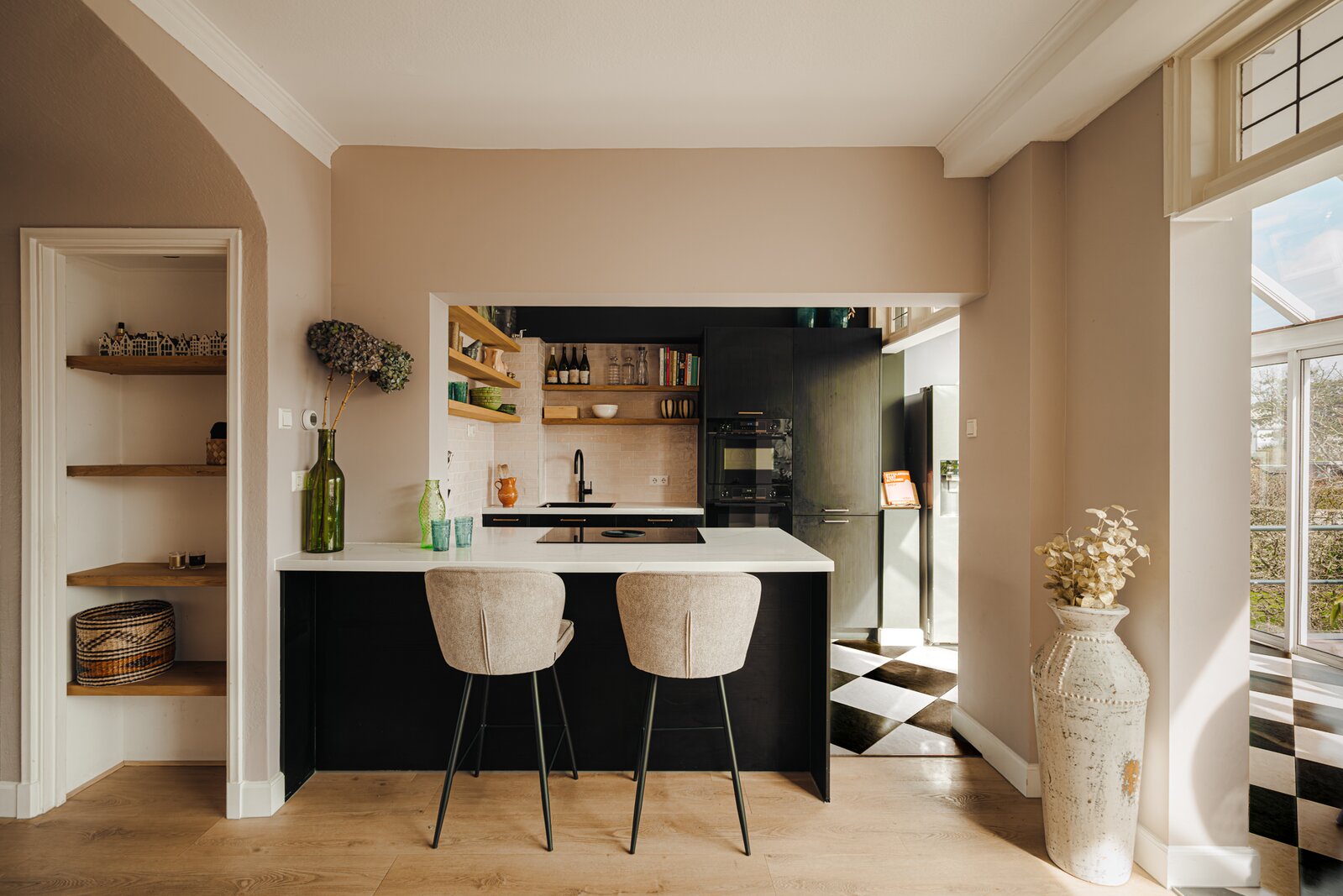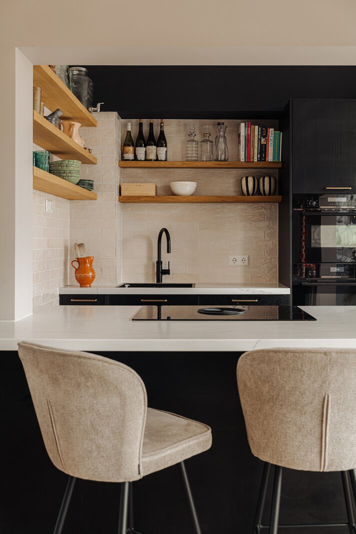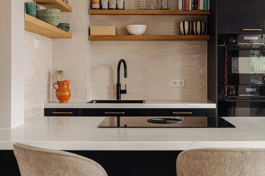 De in 2024 vernieuwde open keuken met kookeiland is van alle gemakken voorzien en uitgerust met hoogwaardige inbouwapparatuur, waaronder een Bora inductiekookplaat, Quooker, Bosch oven en combi magnetron/oven. De keuken is afgewerkt met een fraaie stenen vloer, waarbij karakteristieke elementen behouden zijn gebleven.
