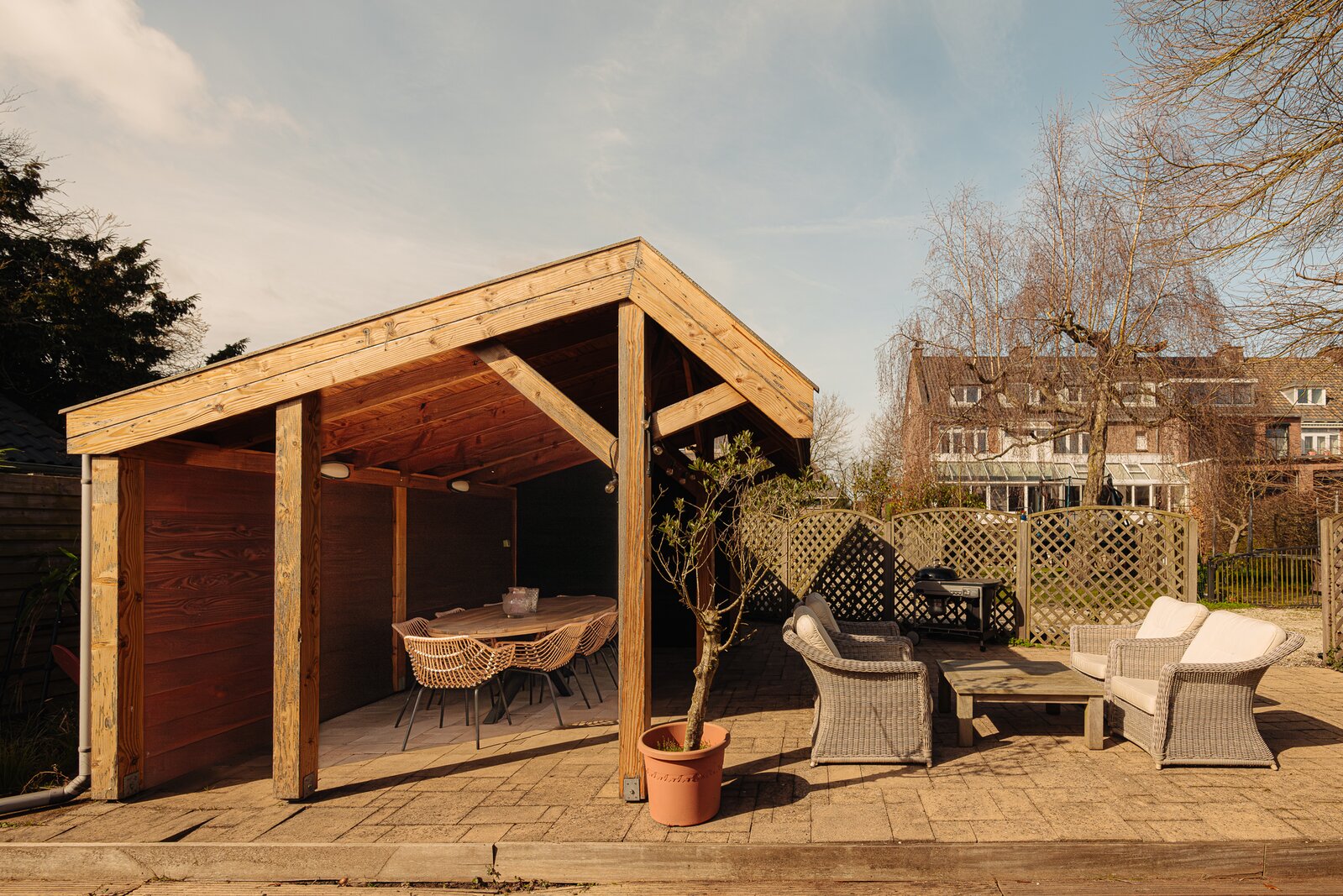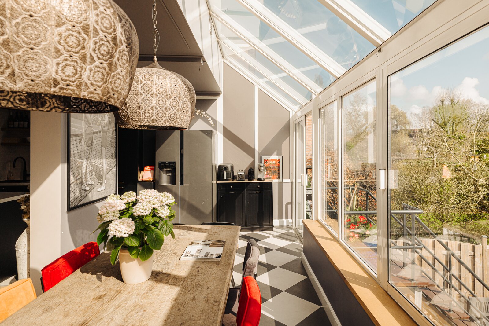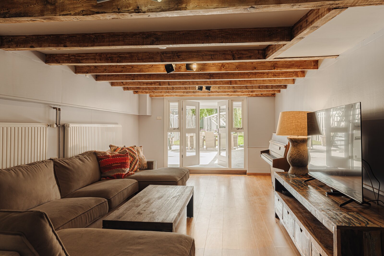 De multifunctionele family room is ideaal als speelkamer, tv-hoek of hobbyruimte en opent via dubbele deuren naar het overdekte terras en de zonnige achtertuin.