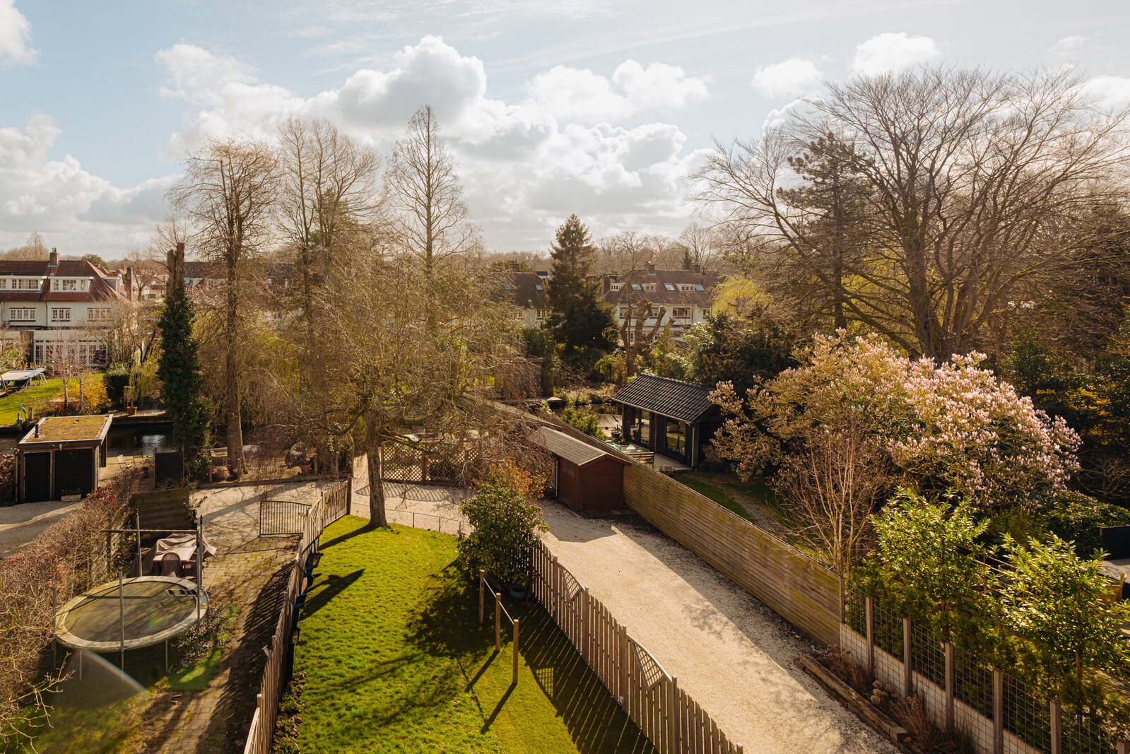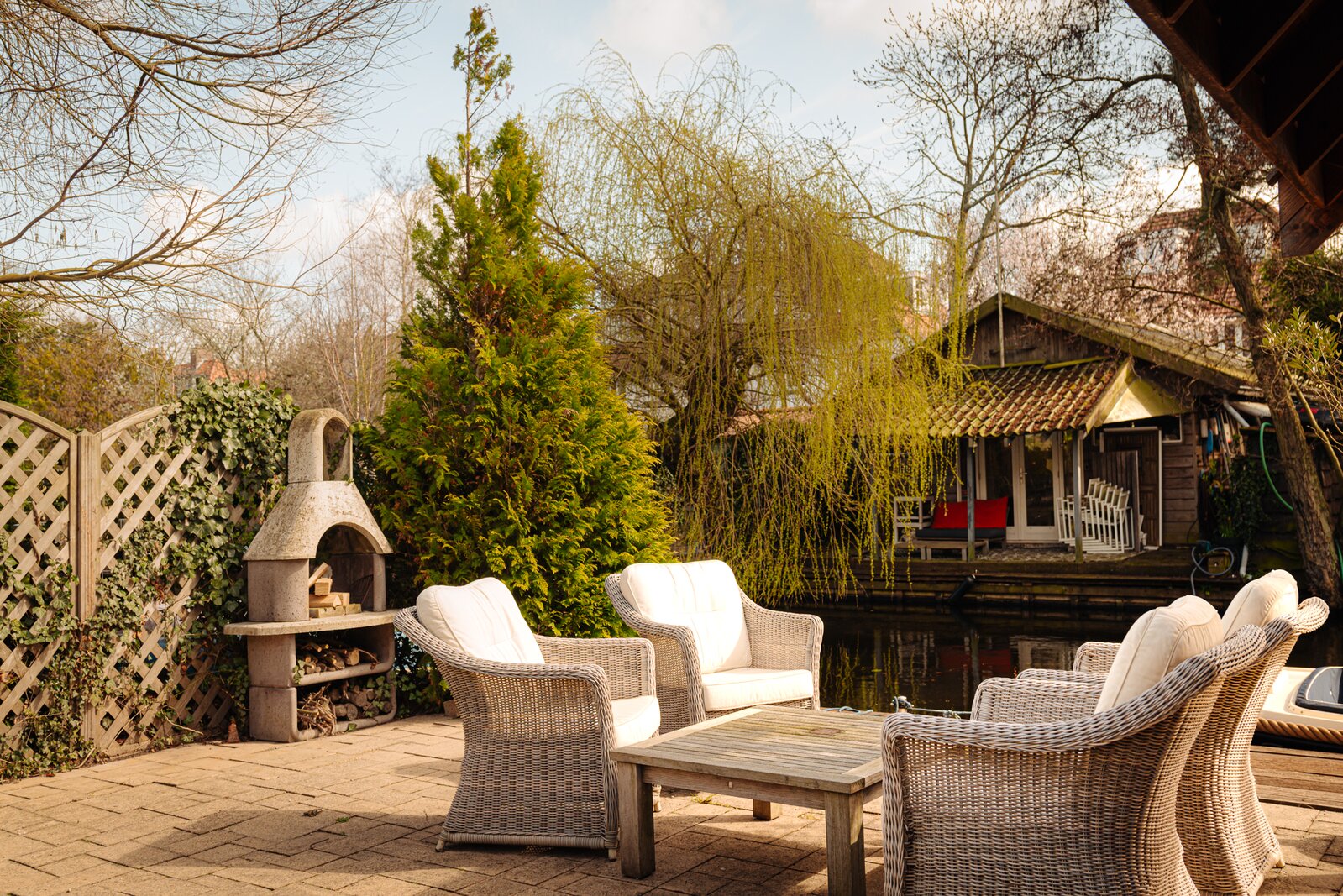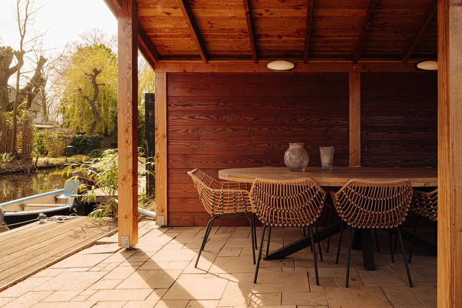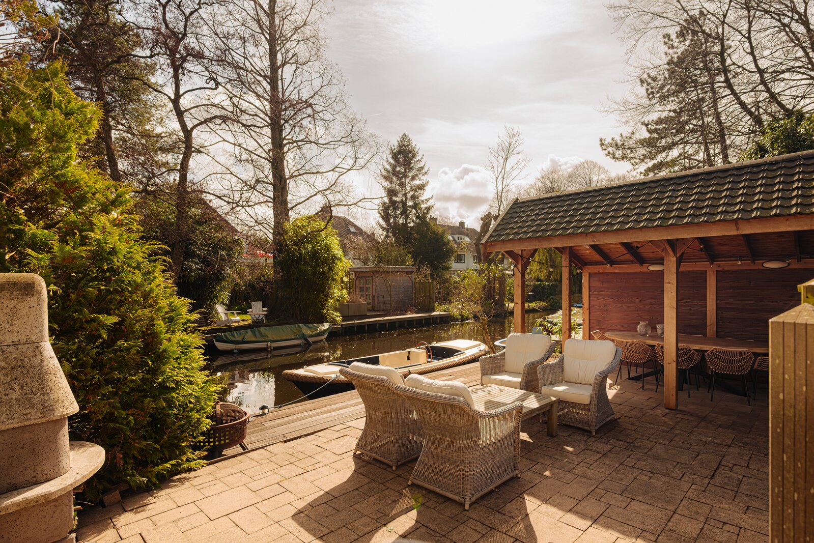 De achtertuin is diep en op het zuidoosten gelegen, met een achterom en een zijpad. Aan het water bevindt zich een steiger met zonneterras met overdekt zitgedeelte. Daarnaast is er een schuurtje en een overkapping voor fietsen, evenals een buitenhaard. Aan de zijkant is de tuin afgesloten door een hoog openslaand hek dat toegang biedt tot het zijpad.