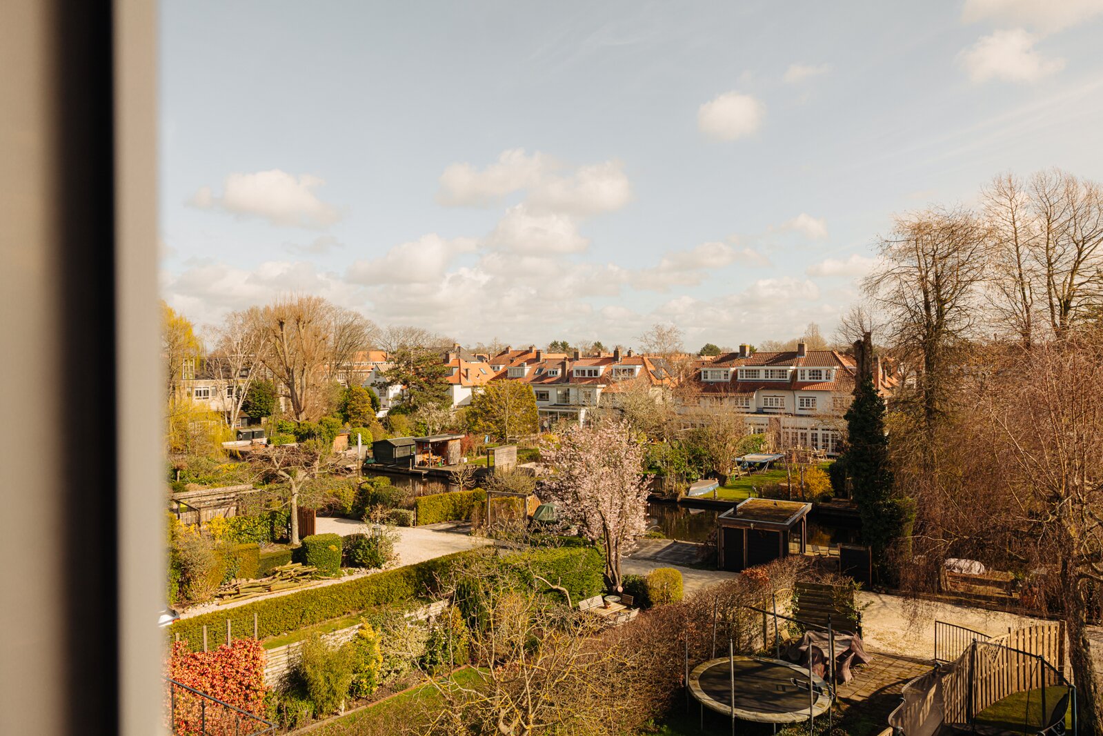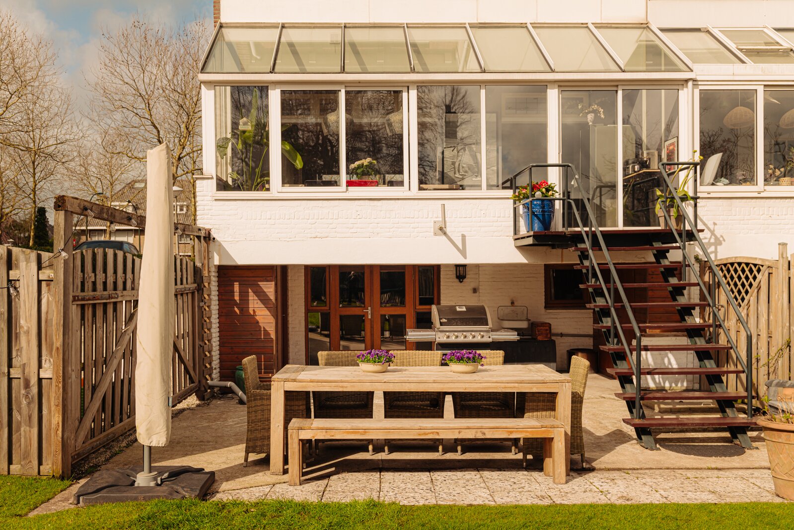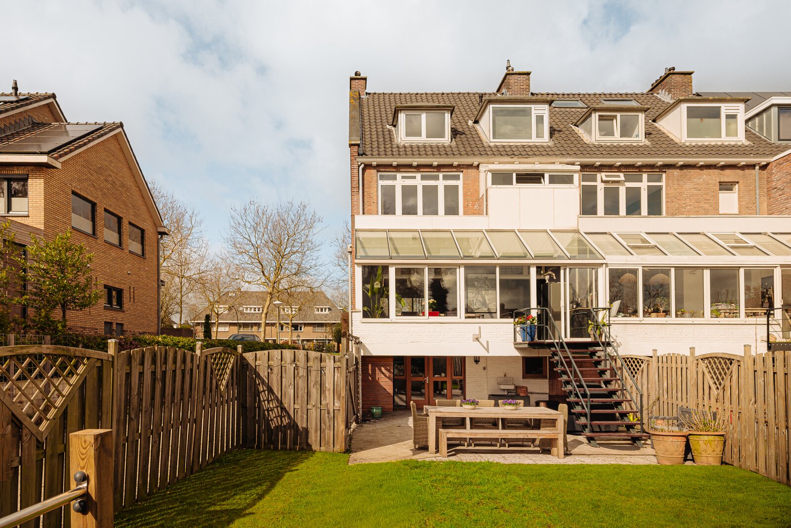 De achtertuin is diep en op het zuidoosten gelegen, met een achterom en een zijpad. Aan het water bevindt zich een steiger met zonneterras met overdekt zitgedeelte. Daarnaast is er een schuurtje en een overkapping voor fietsen, evenals een buitenhaard. Aan de zijkant is de tuin afgesloten door een hoog openslaand hek dat toegang biedt tot het zijpad.