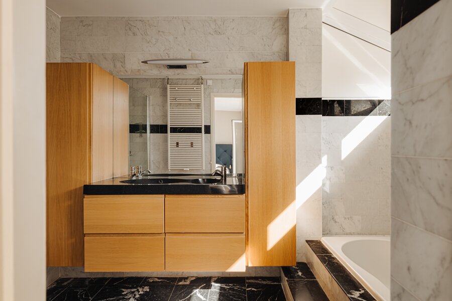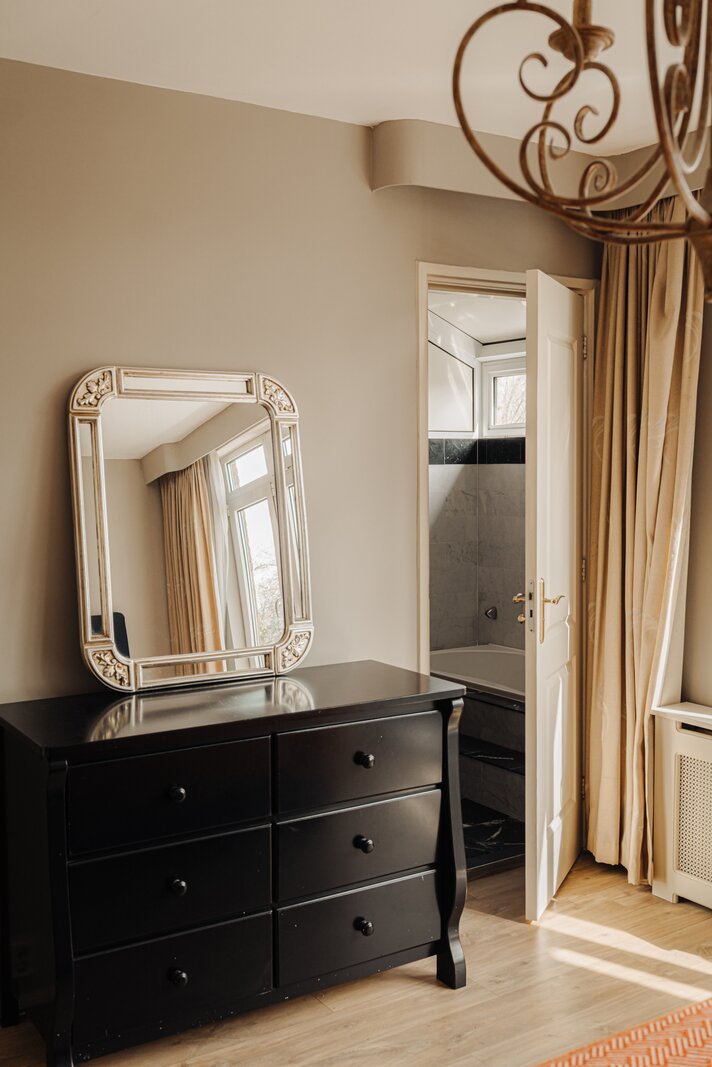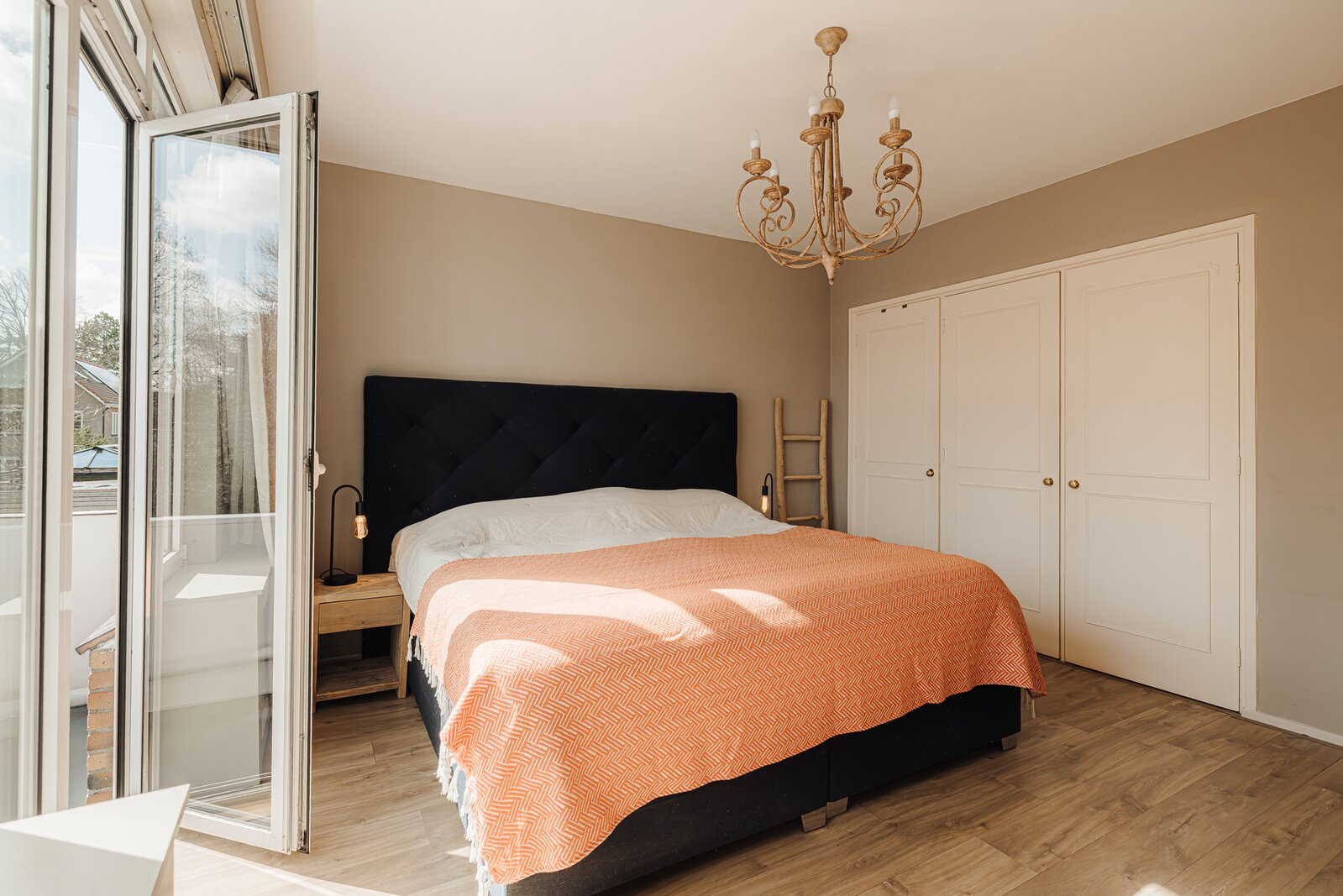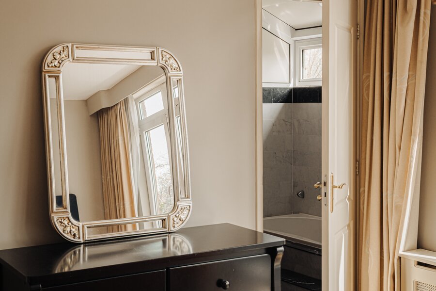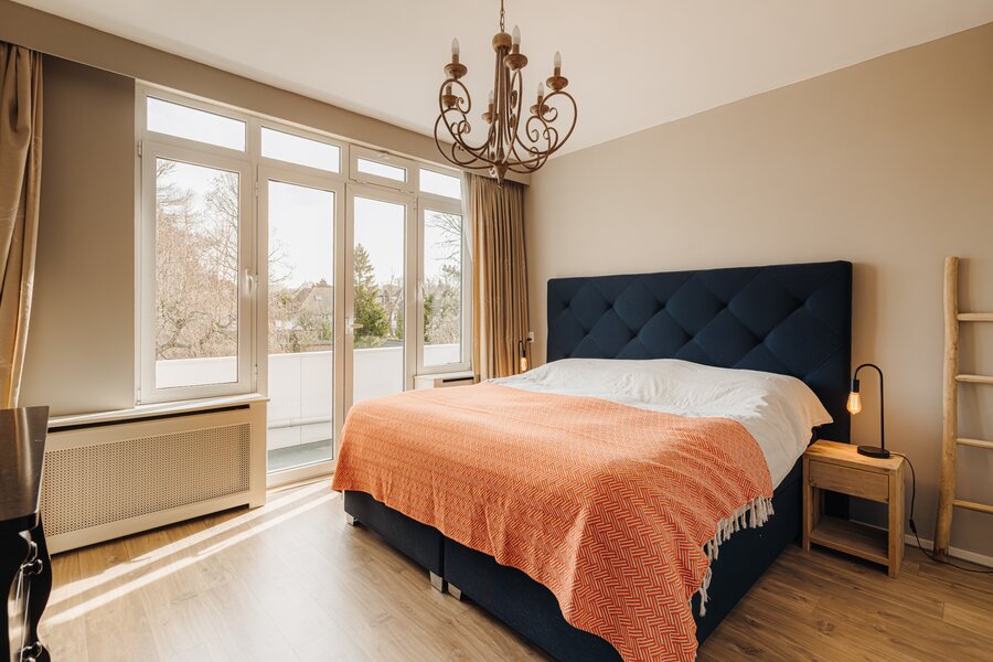 Aan de achterzijde bevindt zich een grote slaapkamer met een balkon en een en suite badkamer. De kamer is uitgerust met een vaste kastenwand en het balkon kijkt uit over de diepe achtertuin en het water. Dankzij de grote raampartijen is er veel lichtinval. De badkamer is compleet ingericht met een ligbad, douche, toilet, een badkamermeubel met dubbele wastafel en twee handdoekradiatoren.