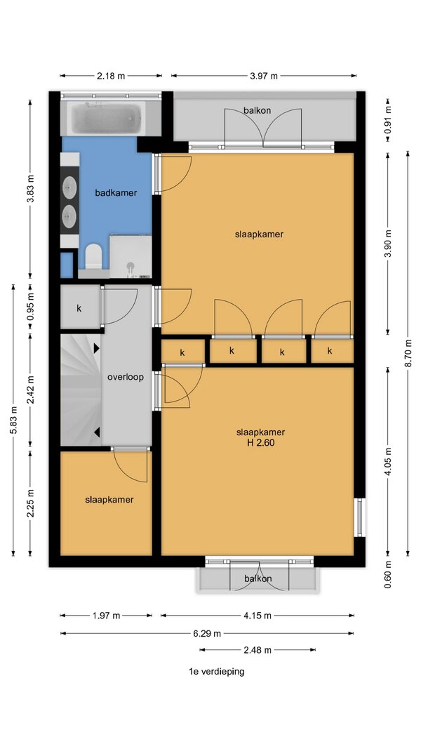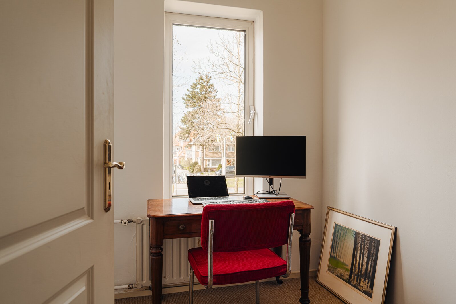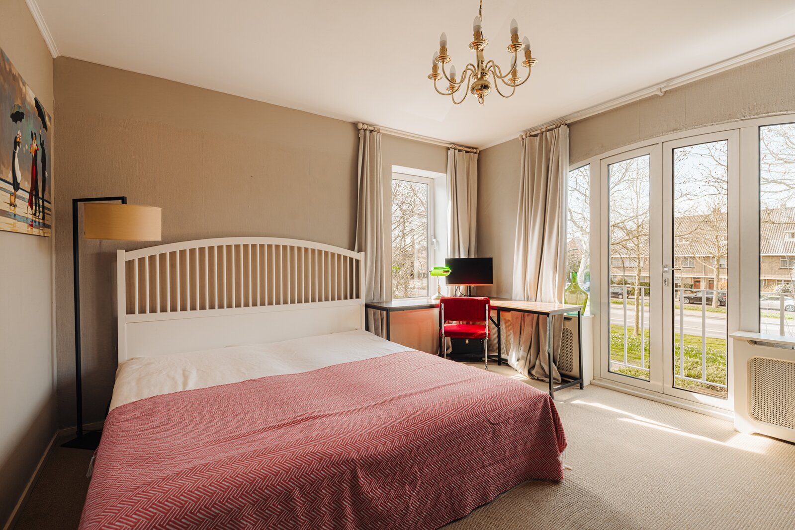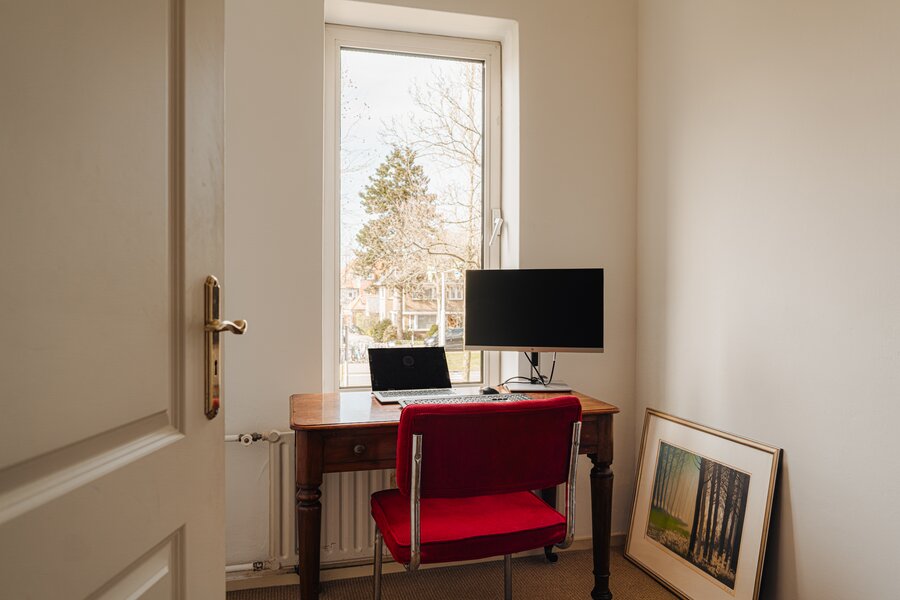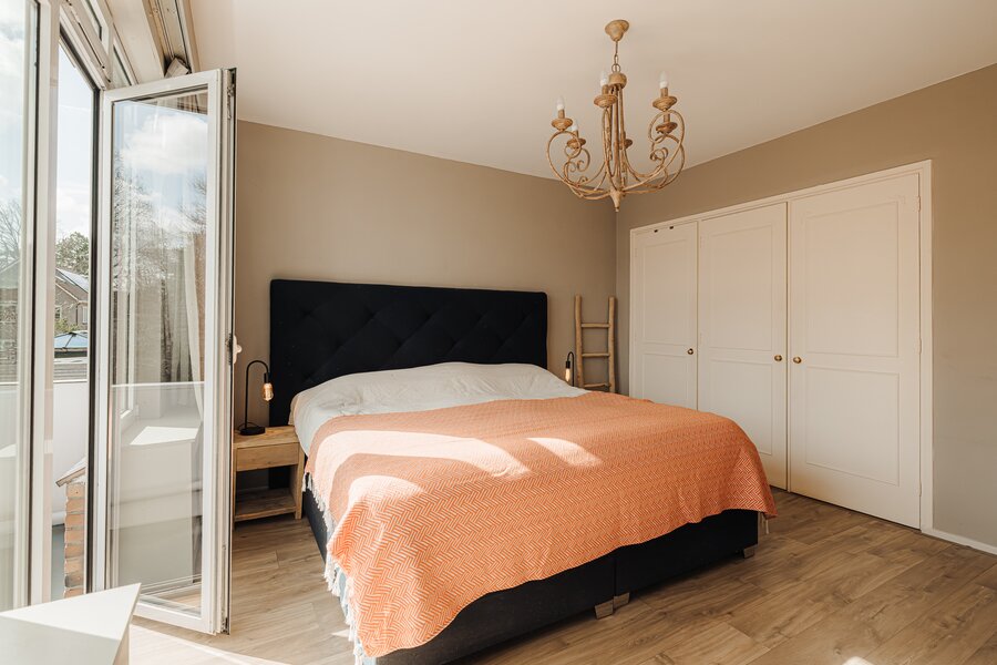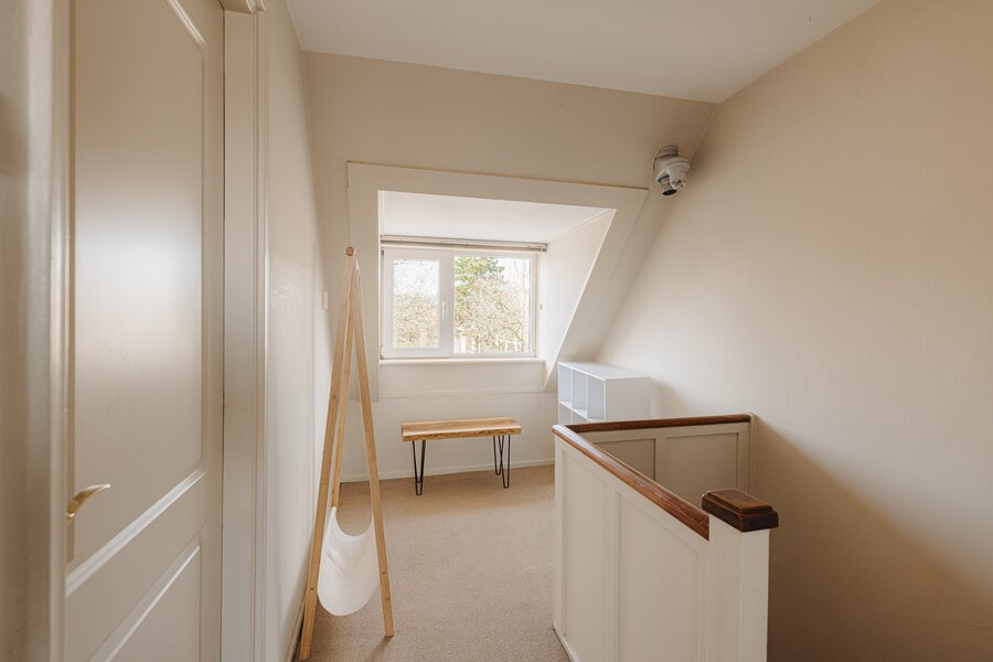 Op de eerste verdieping bevinden zich drie slaapkamers en de badkamer. De overloop is voorzien van een praktische vaste kast. Aan de voorzijde ligt een ruime slaapkamer met een Frans balkon en openslaande deuren. Deze kamer beschikt over een vaste kast en kunststof kozijnen met dubbel glas, en biedt een prettig uitzicht op de voortuin. Daarnaast is er aan de voorzijde een kleinere slaapkamer, momenteel in gebruik als kantoor.