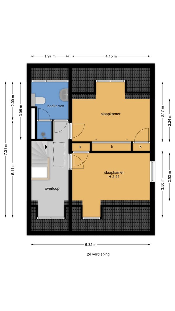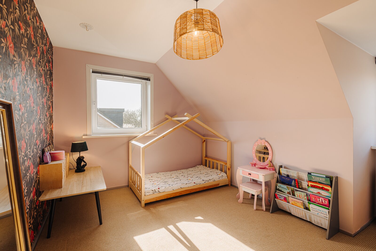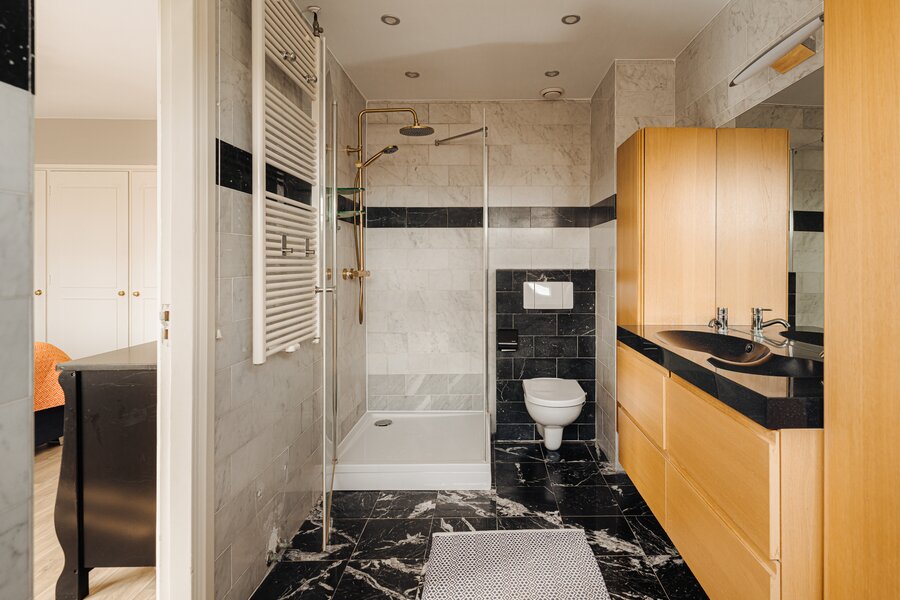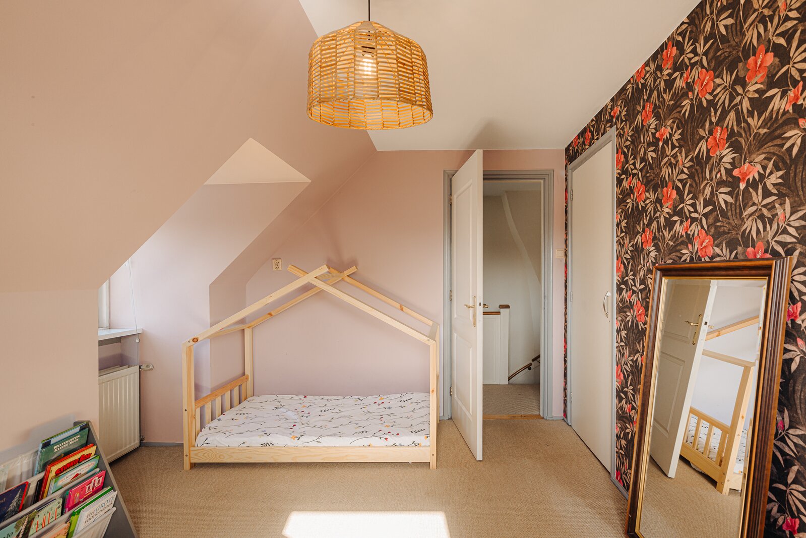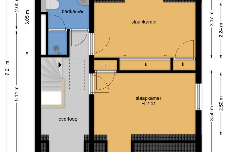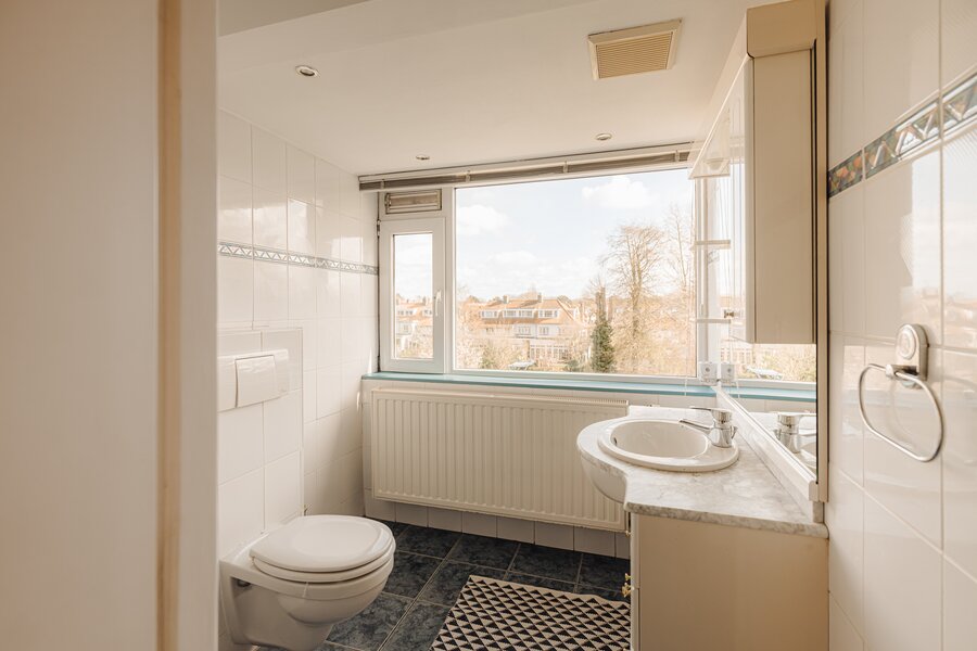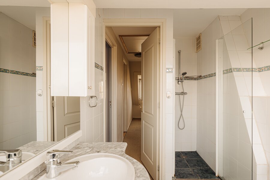 De badkamer is uitgerust met een toilet, douche en een wastafelmeubel met wasbak. Het grote raam zorgt voor prettig daglicht en biedt uitzicht op de achtertuin. Tot slot is er via een vlizotrap toegang tot de geïsoleerde vliering, die veel extra bergruimte biedt.