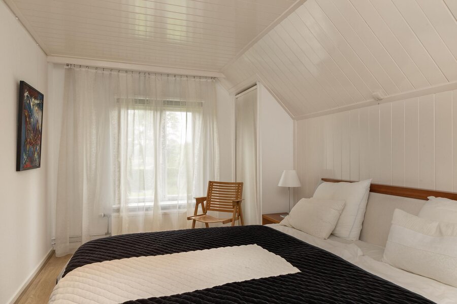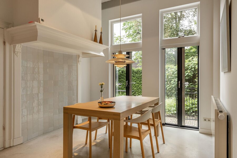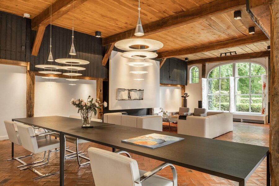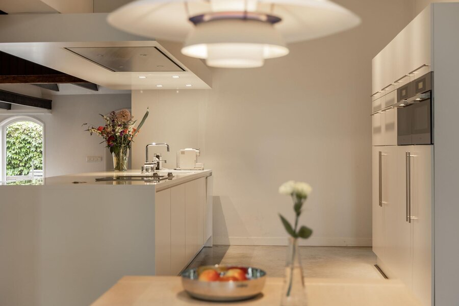 De oorspronkelijke deel is verbouwd tot een verbazingwekkend mooie leefruimte met aangrenzende open keuken. De ruimte is als “meer dan royaal” te betitelen, maar door de uitgekiende indeling voelt de ruimte aan als een warme jas! In de woonkamer ligt nog de oorspronkelijke vloer, de niendeuren zijn voorzien van glas, waardoor binnenshuis van een fenomenaal uitzicht genoten kan worden. De oude gebinten zijn prachtig verwerkt in het moderne interieur, de moderne gashaard is een prachtige eyecatcher en voorziet in de wintermaanden voor behaaglijke warmte en sfeer. De ruimte biedt diverse mogelijkheden om te relaxen of te tafelen. De frontaal geplaatste inbouwkeuken met een modern witte hoogglans uitvoering is het centrum van het eetgedeelte waar meer dan genoeg ruimte is voor een XL eettafel. Dit deel is voorzien van een betongietvloer met vloerverwarming.