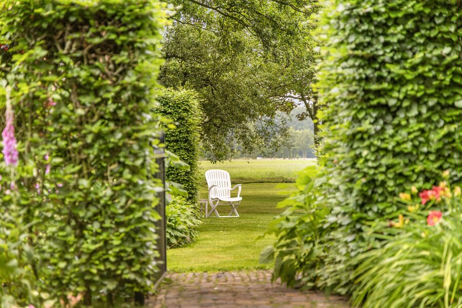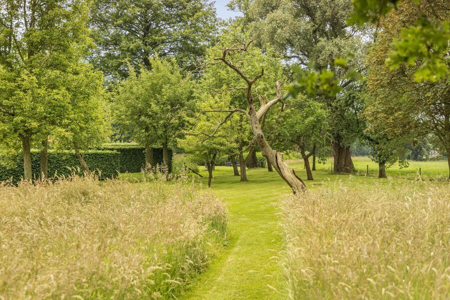 Vanuit de Hasseltweg worden bezoekers via de eiken omzoomde oprijlaan begeleid naar dit prachtige woonerf. Hier is voldoende ruimte om meerdere auto’s te stallen. De woning is omgeven door een groene oase van diverse hagen en afscheidingen geheel aangelegd naar een ontwerp van de internationaal vermaarde tuinarchitect Piet Oudolf. Hij heeft van de breed naar achter uitwaaierende kavel omgetoverd tot een waar paradijs. Er zijn meerdere zitjes, allemaal afgescheiden van elkaar met eigen privacy en karakter. Op elk moment van de dag is het hier meer dan optimaal genieten. De tuin wordt doorbroken door een slootje waardoor er een mooie natuurlijke tweedeling is ontstaan; rond de woning prachtig aangelegd, de andere zijde van de sloot een natuurweide met diverse fruitbomen (appel, peer, pruim en een mooie kastanje) en een poel waar verscholen in het hoge gras elk jaar een reeënfamilie de kalfjes groot brengt. Op een afgescheiden gedeelte van het perceel zijn 28 zonnepanelen gesitueerd. De afscheiding aan de achterzijde is geheel natuurlijk gebleven, een enkele solitaire boom of een groenblijvende struik, dit om volop te kunnen genieten van het weidse uitzicht en elke avond een prachtige zonsondergang.