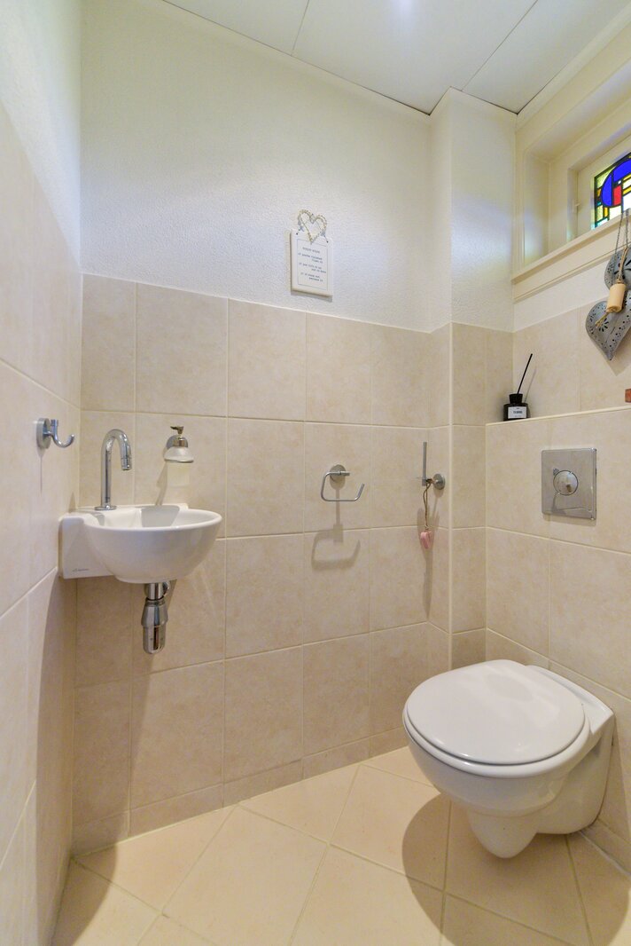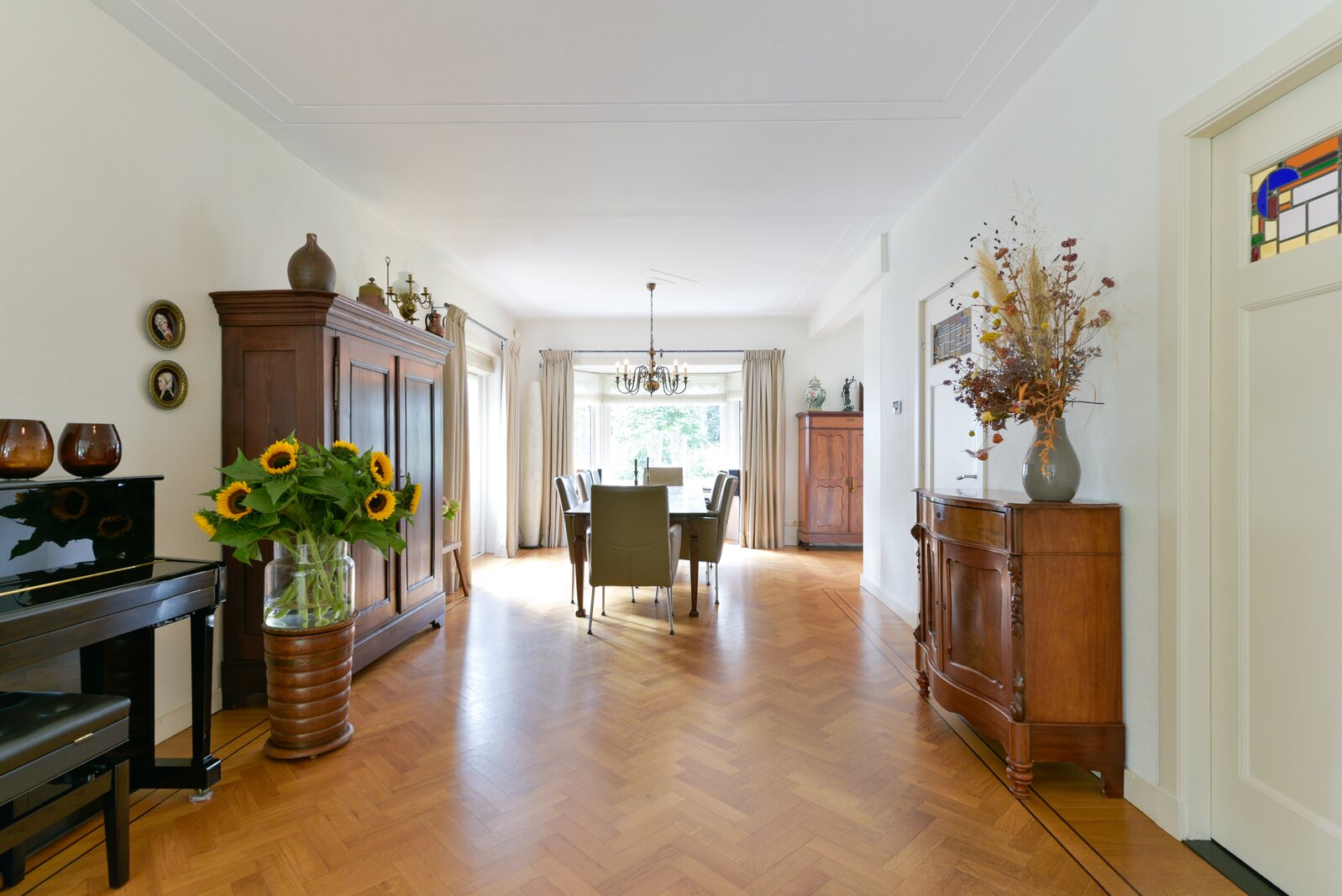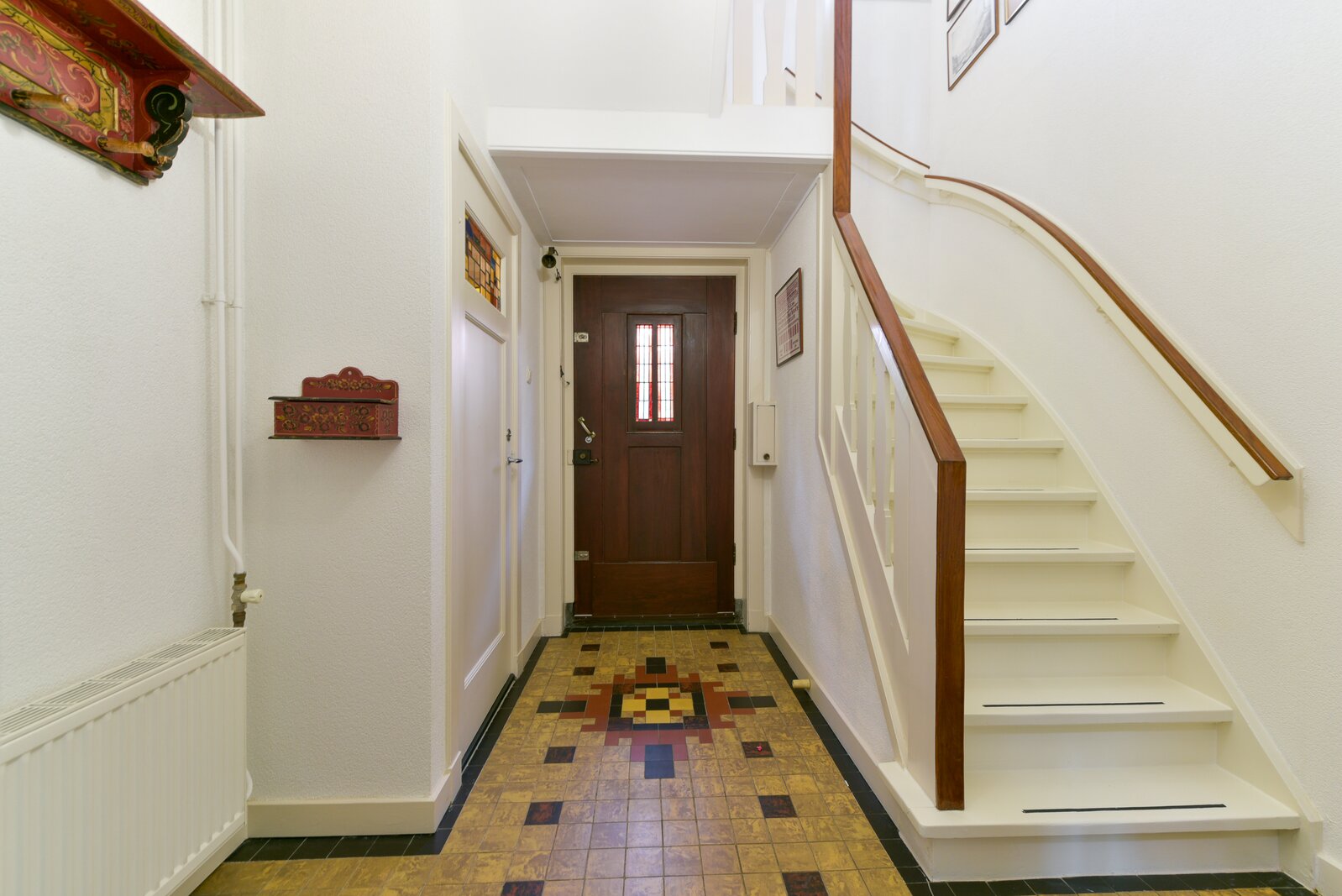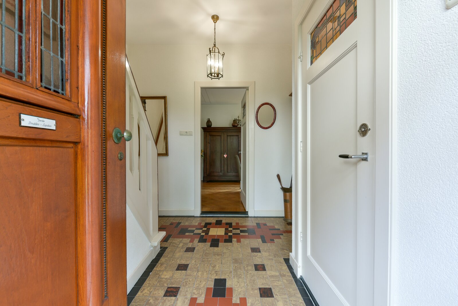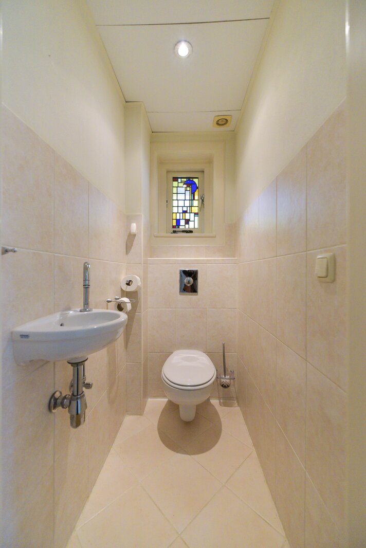 Via de zijkant van de woning betreedt u de karakteristieke hal, voorzien van een prachtig gelegde originele tegelvloer in klassiek motief. Opvallend is de beleving van de lichttoetreding door de kleurrijke glas-in-lood ramen en fraai is de bordestrap die naar de verdiepingen leidt. Vanuit de hal heeft u toegang tot het toilet met fonteintje en de indrukwekkende woonkamer.