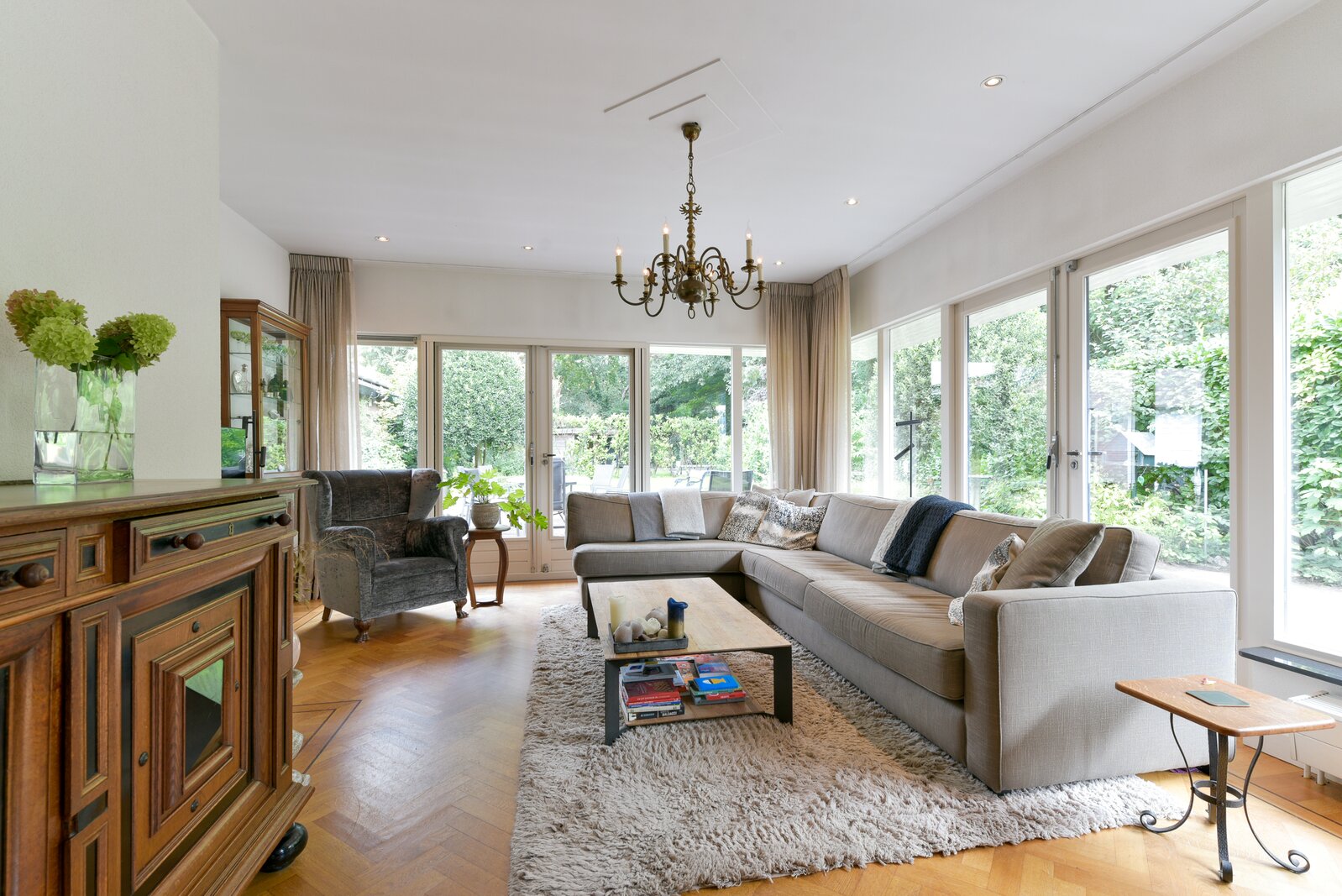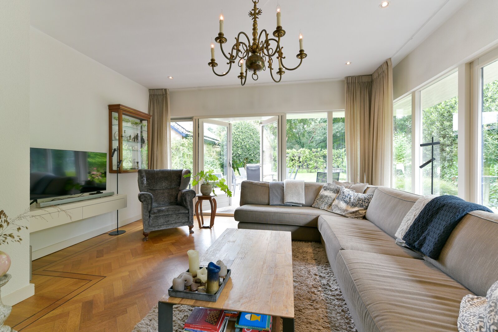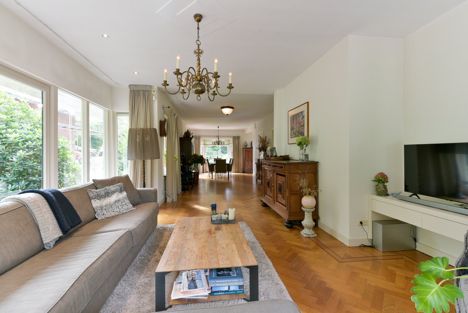 De woonkamer is ruim opgezet en kenmerkt zich door een hoogwaardige visgraat parketvloer met dubbele wengé bies. Er zijn Belgisch hardstenen vensterbanken. Er is een gezellig L-gedeelte aan de voorzijde en aan de achterzijde bevindt zich een sfeervolle, tuingerichte zitkamer met prachtig uitzicht over de tuin.