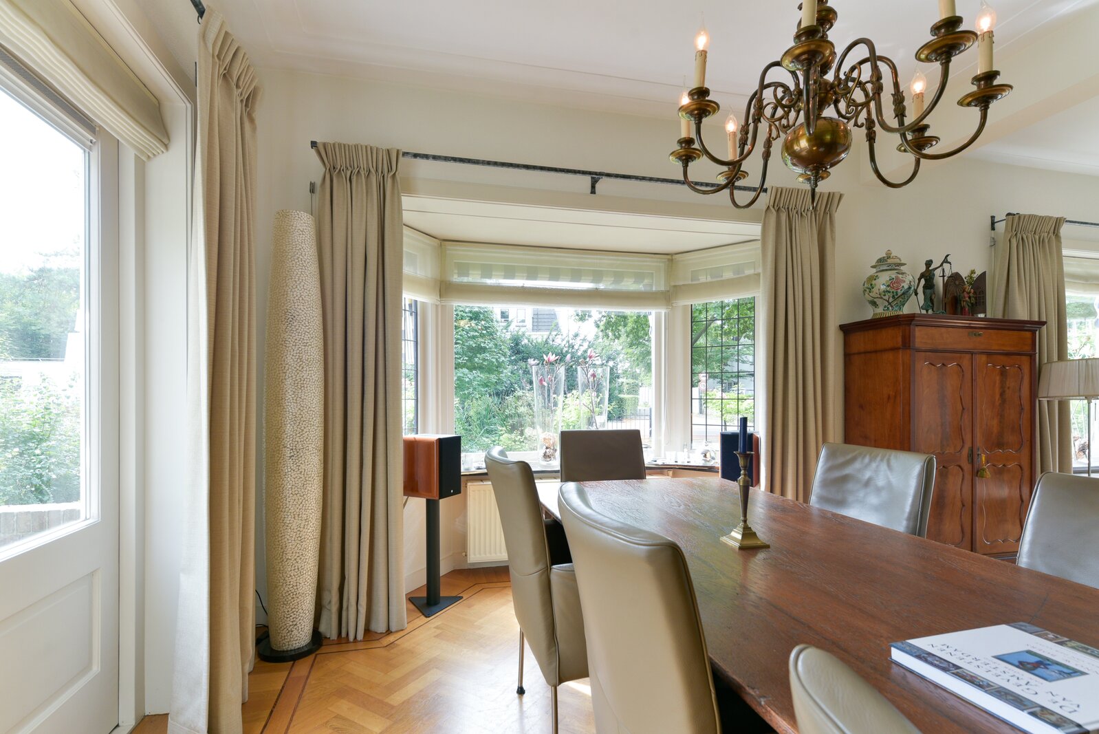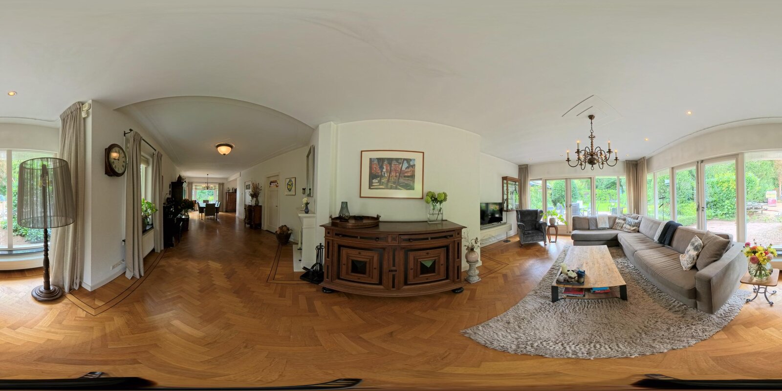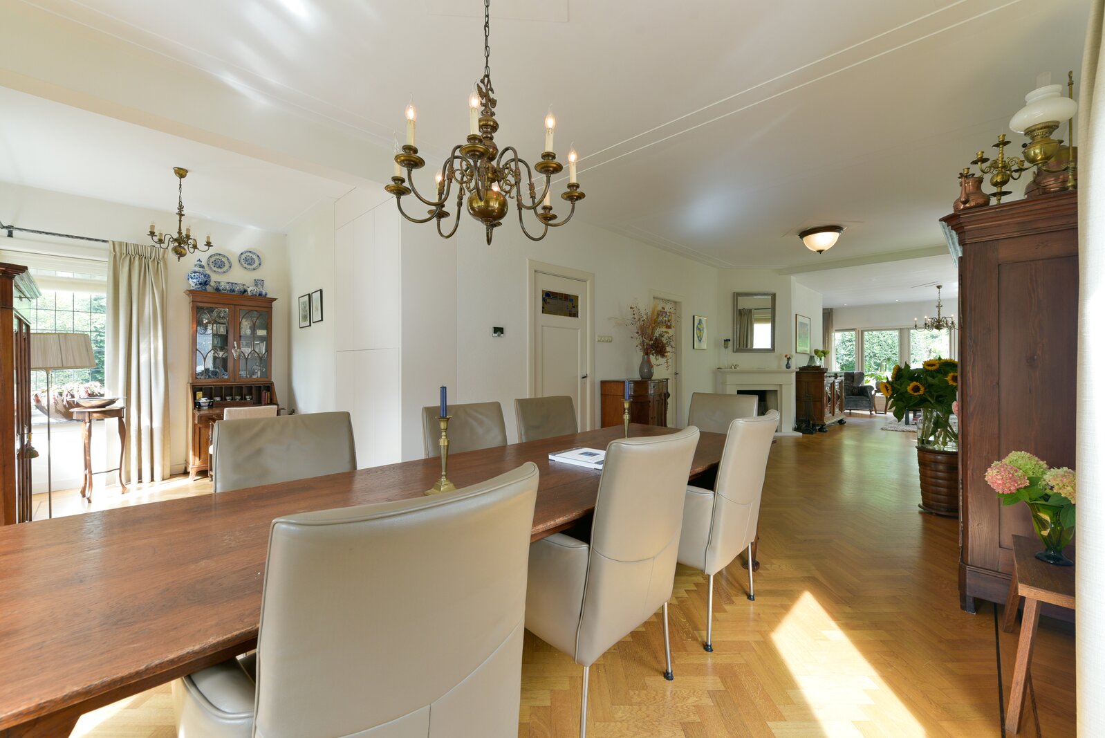 De woonkamer is ruim opgezet en kenmerkt zich door een hoogwaardige visgraat parketvloer met dubbele wengé bies. Er zijn Belgisch hardstenen vensterbanken. Er is een gezellig L-gedeelte aan de voorzijde en aan de achterzijde bevindt zich een sfeervolle, tuingerichte zitkamer met prachtig uitzicht over de tuin.