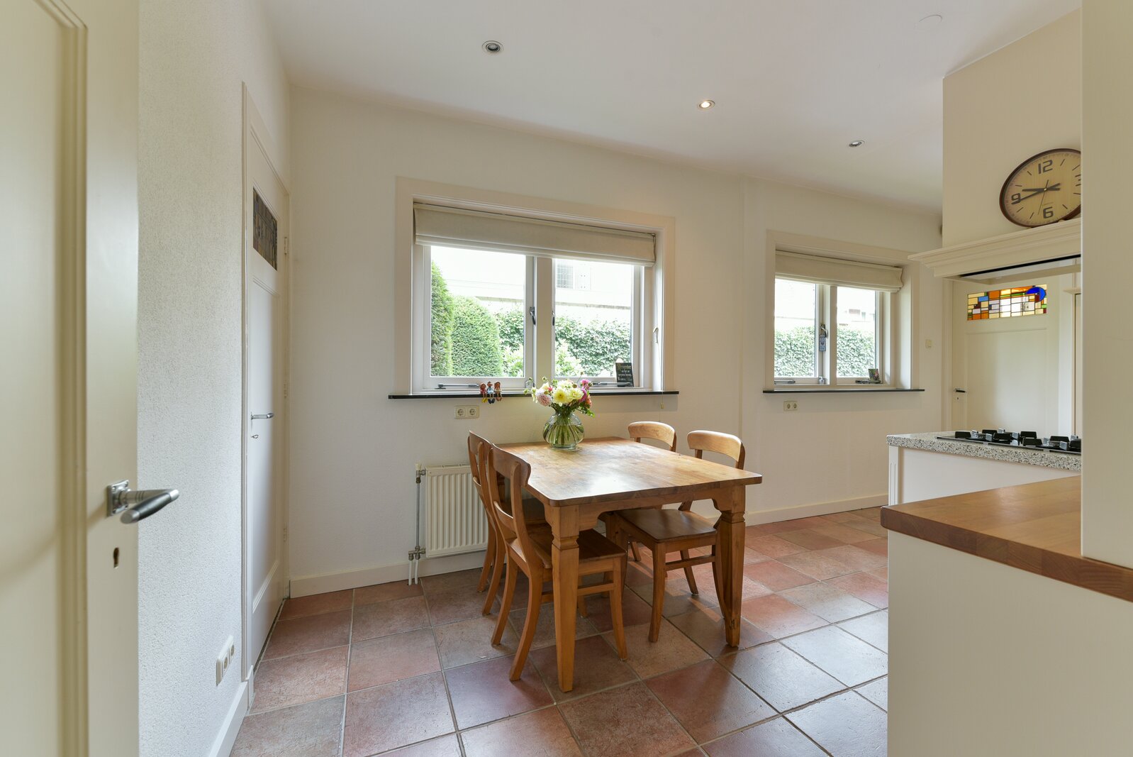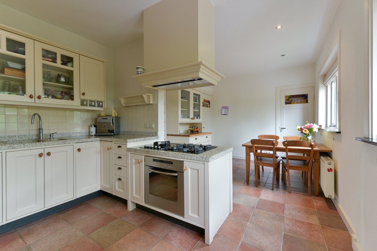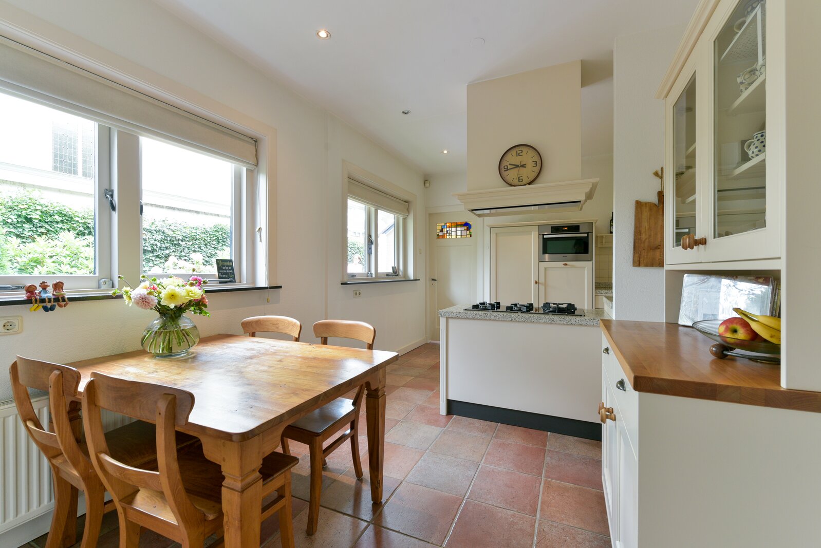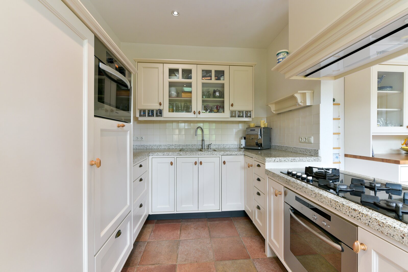 De keuken is handgemaakt aan het begin van deze eeuw en volledig in stijl met het karakter van de woning. De keuken beschikt over de gebruikelijke inbouwapparatuur. De vaatwasser en magnetron zijn ongeveer acht jaar oud en de Quooker is ongeveer 5 jaar oud. Aansluitend vindt u de praktische bijkeuken met aansluitingen voor wasapparatuur en toegang tot de achterzijde van de woning. Vanuit de keuken is tevens de grote kelder bereikbaar: droog, ruim en ideaal als provisieruimte en/of wijnkelder.