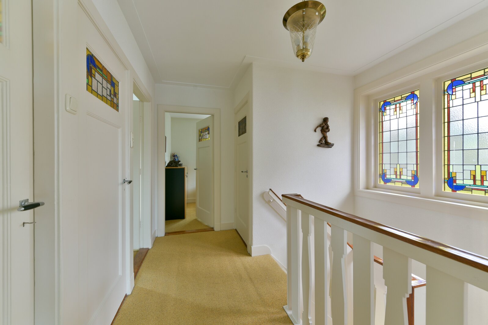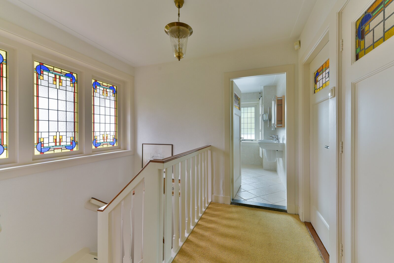 De eerste verdieping is vanuit de eerst omschreven hal te bereiken. Op deze verdieping bevinden zich drie volwaardige slaapkamers, waarvan twee aan de voorzijde en één aan de achterzijde. Opvallend zijn de dubbel uitgevoerde glas-in-loodramen, die zorgen voor sfeer en lichtinval. De badkamer aan de achterzijde is voorzien van een whirlpool ligbad, dubbele wastafel en douchegelegenheid. De badkamer is voorzien van vloerverwarming. Het separate toilet op de overloop beschikt eveneens over een glas-in-loodraam.