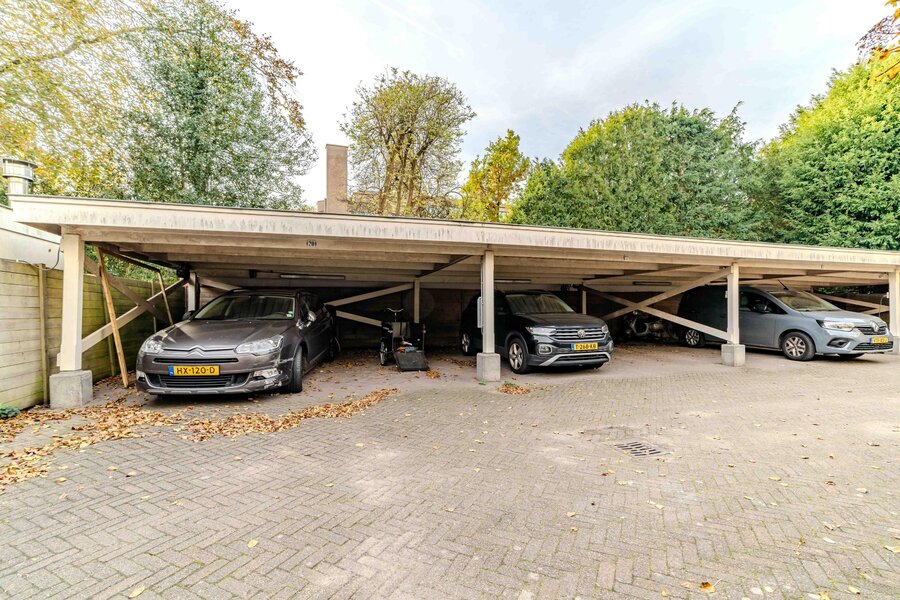 Aan de voorzijde van het complex bevindt zich de toegang tot de parkeervoorziening met carport. De twee bij het appartement behorende parkeerplaatsen zijn bereikbaar via een afgesloten elektrische roldeur. Eenmaal binnen rijdt u door naar de achterzijde van het complex, waar de privéparkeerplaatsen zijn gesitueerd.