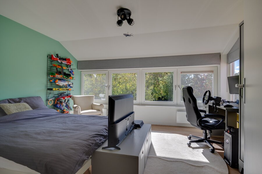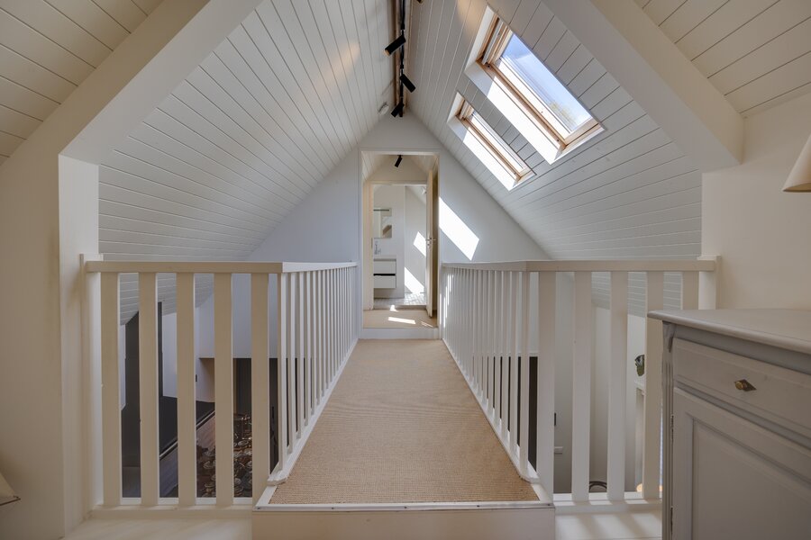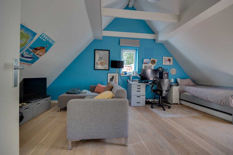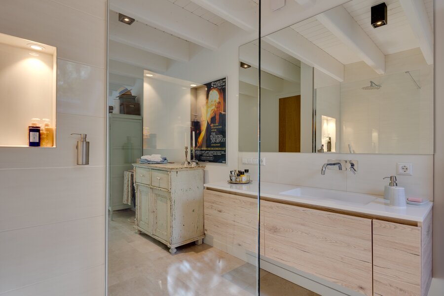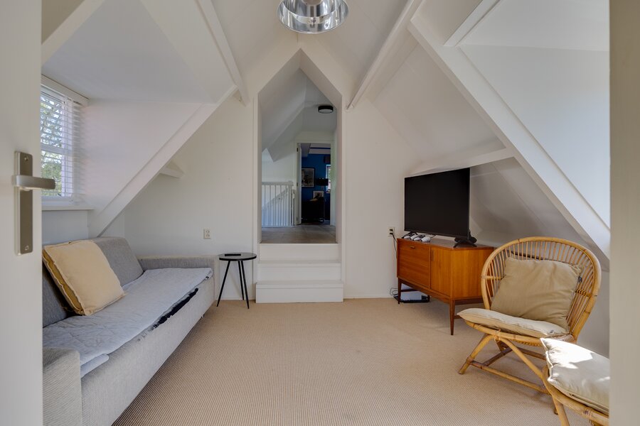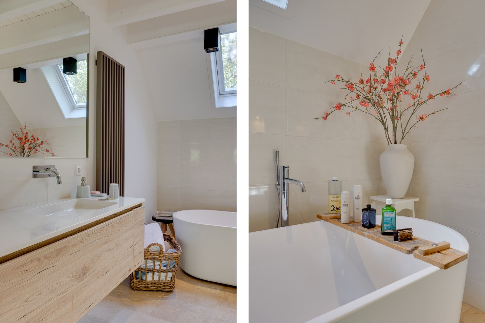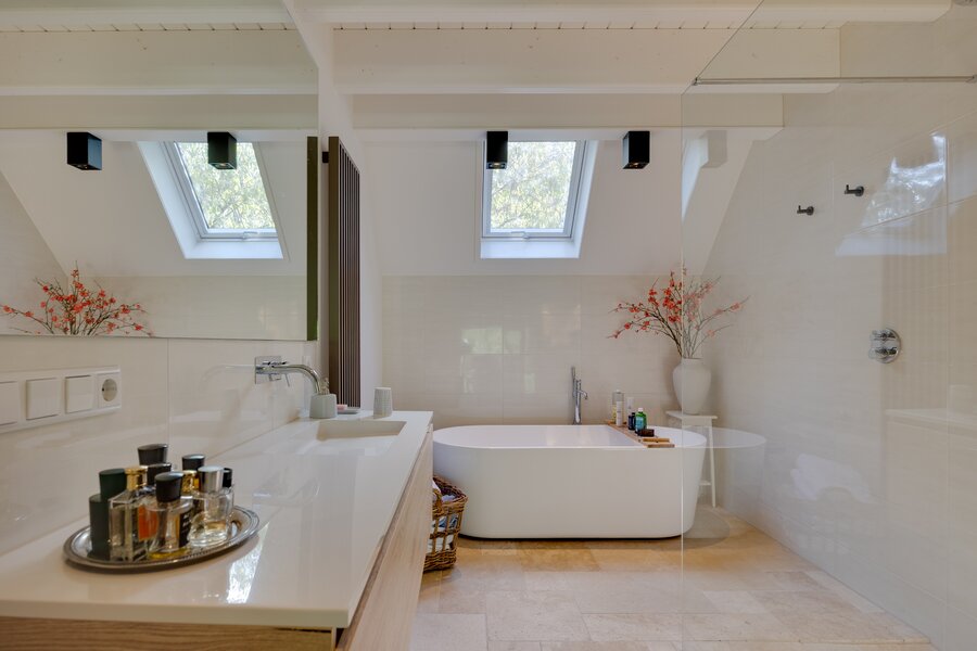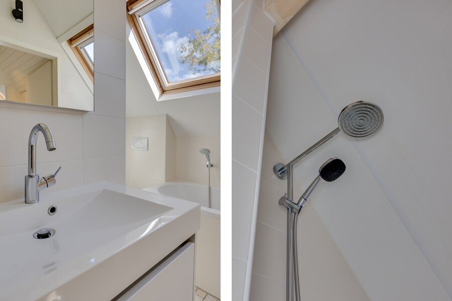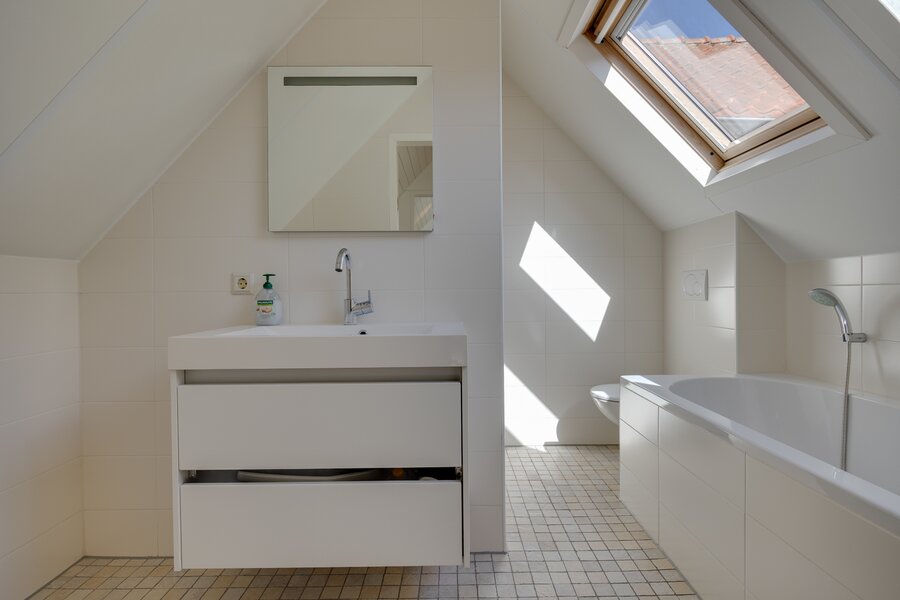 Tot slot treft u een moderne badkamer met een ligbad, ruime inloopdouche, wastafelmeubel, toilet, dakraam en vloerverwarming.