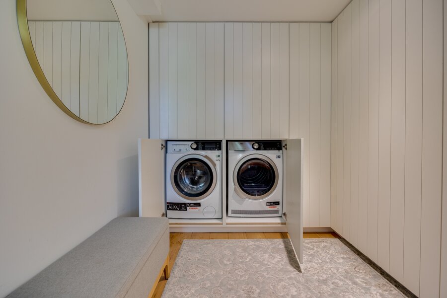 Middels een deur vanuit de keuken komt u in de luxe bijkeuken voorzien van zeer veel bergruimte in vaste kasten en aansluiting voor de wasmachine en droger, meterkast, inpandige berging en deur naar het voorterrein.