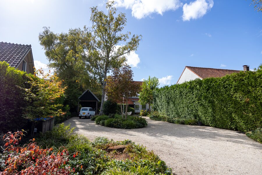 De villa staat op een eveneens tot in de puntjes verzorgd perceel met aan de voorzijde voldoende parkeergelegenheid op eigen terrein en een ruime vrijstaande berging met overkapping en bergvliering. De achtertuin is zeer royaal, beschikt over veel privacy en is fraai aangelegd.