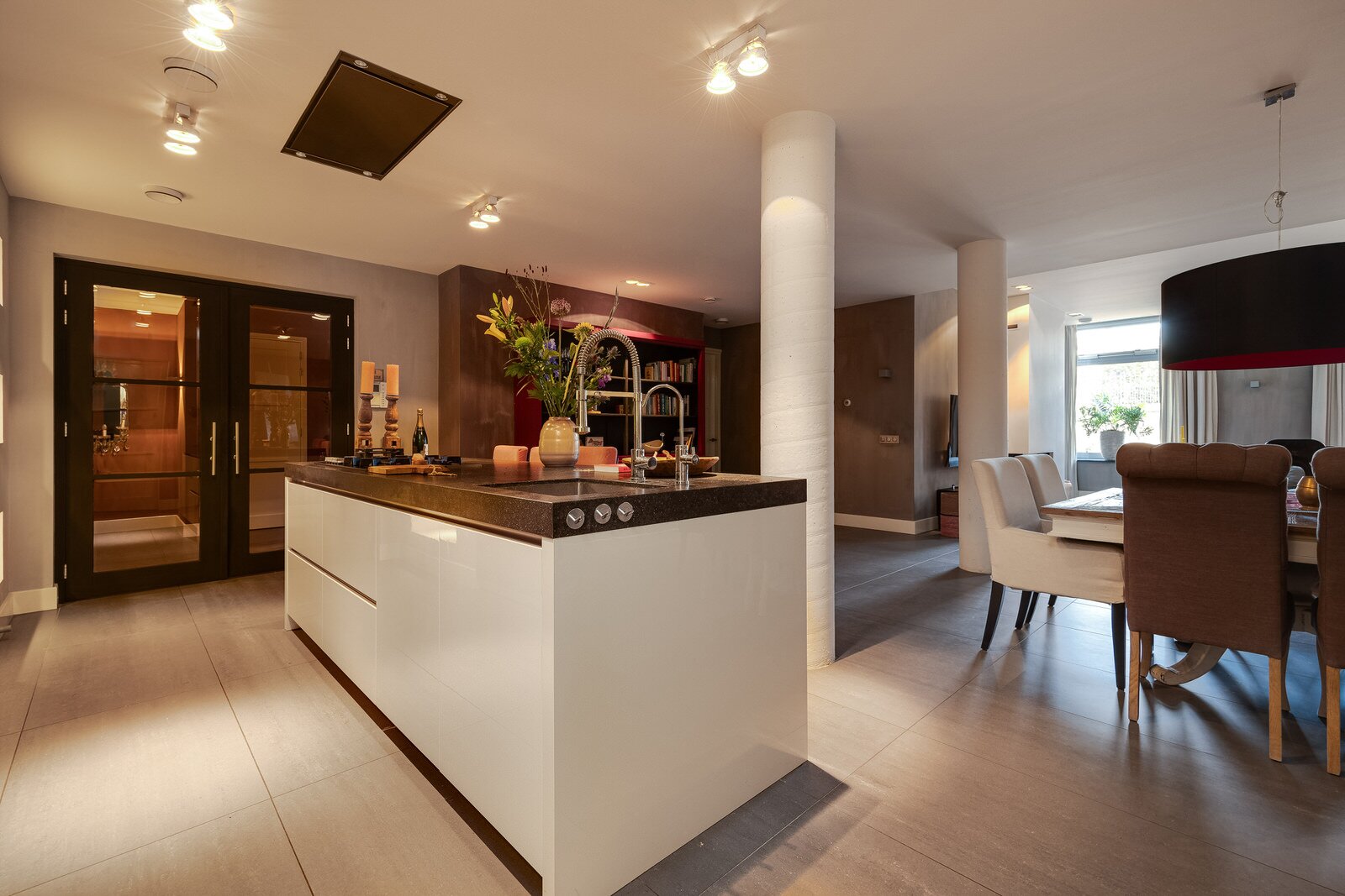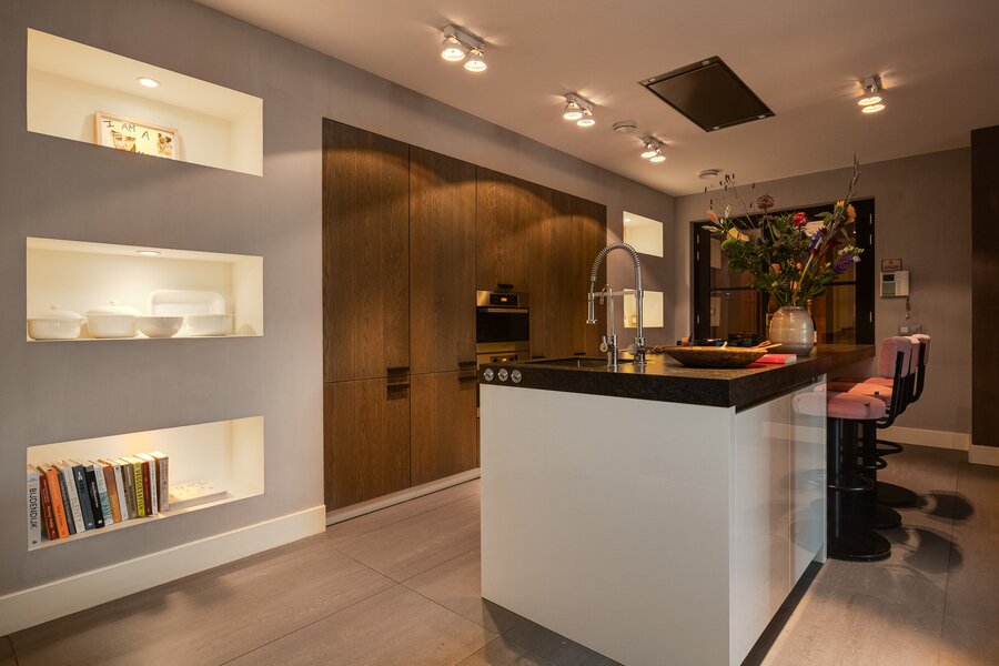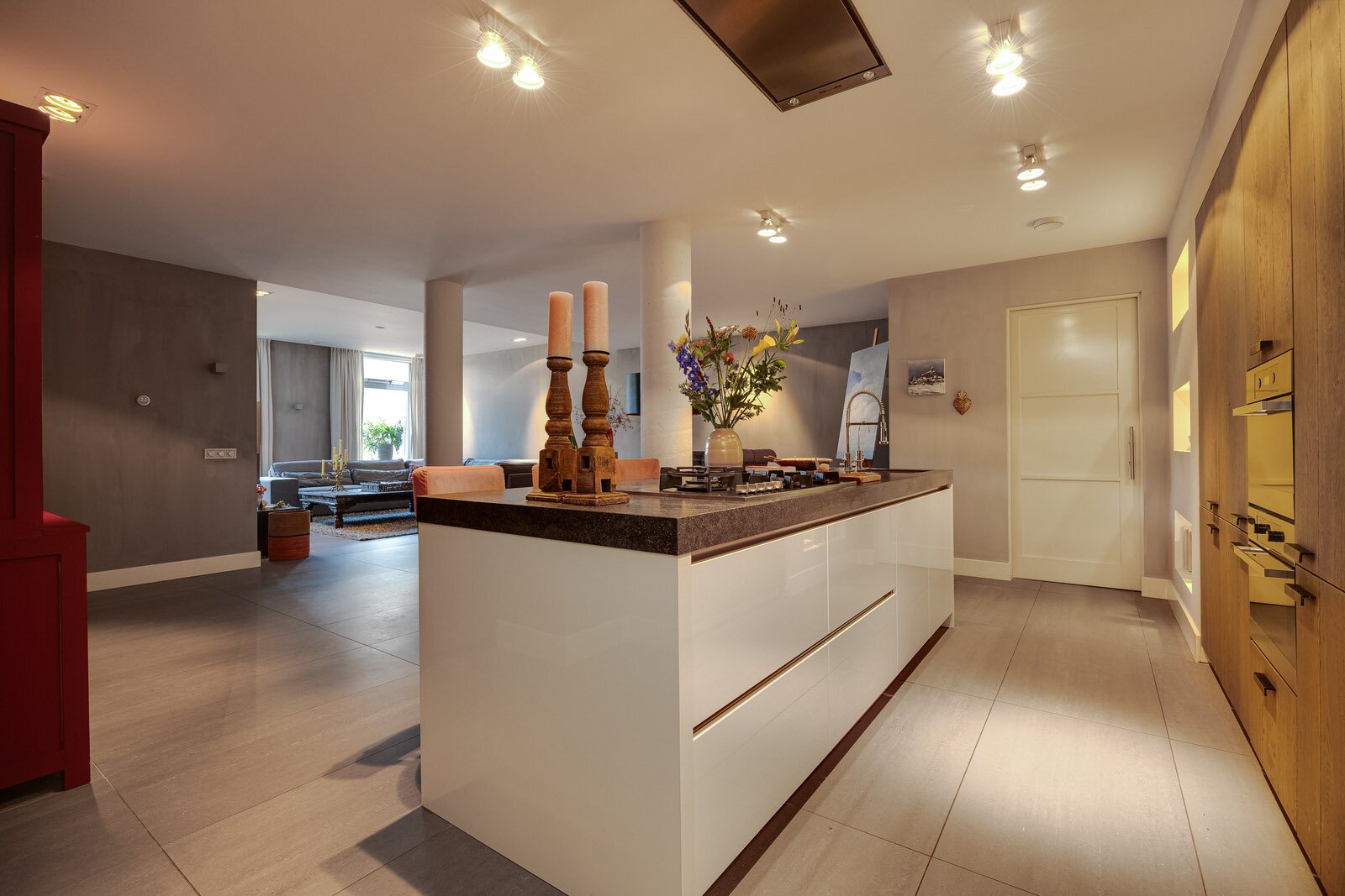 De fraaie moderne keuken is uitgevoerd met o.a. de navolgende inbouwapparatuur: afzuigkap geïntegreerd in het plafond met verlichting, spoelbak met mengkraan, Quooker, vijf pits gasfornuis met wokbrander, hetelucht oven met combi-magnetron, vaatwasser en een koelkast en vriezer. De keuken is opgesplitst in een kookeiland voorzien van strak in hoogglans witte greeploze kasten alsmede een vaste achterwand in hout look. Mooie details zijn o.a. de subtiele baropstelling en de schappen voorzien van verlichting.