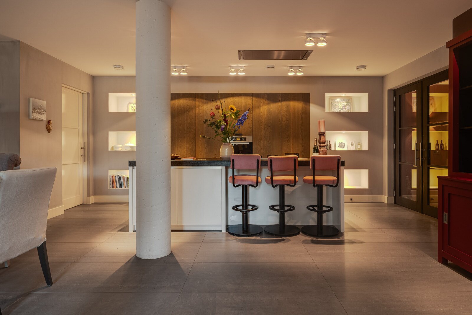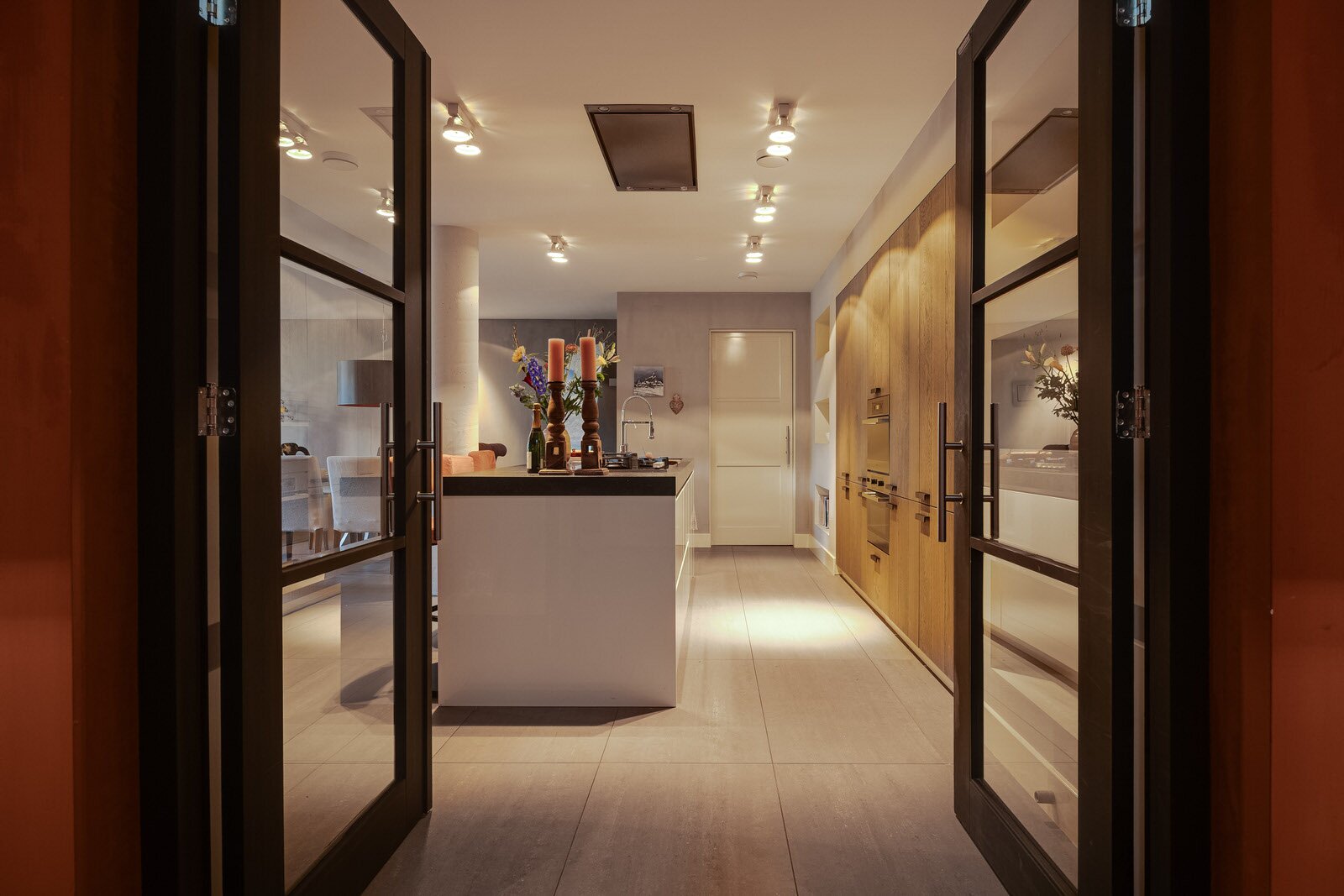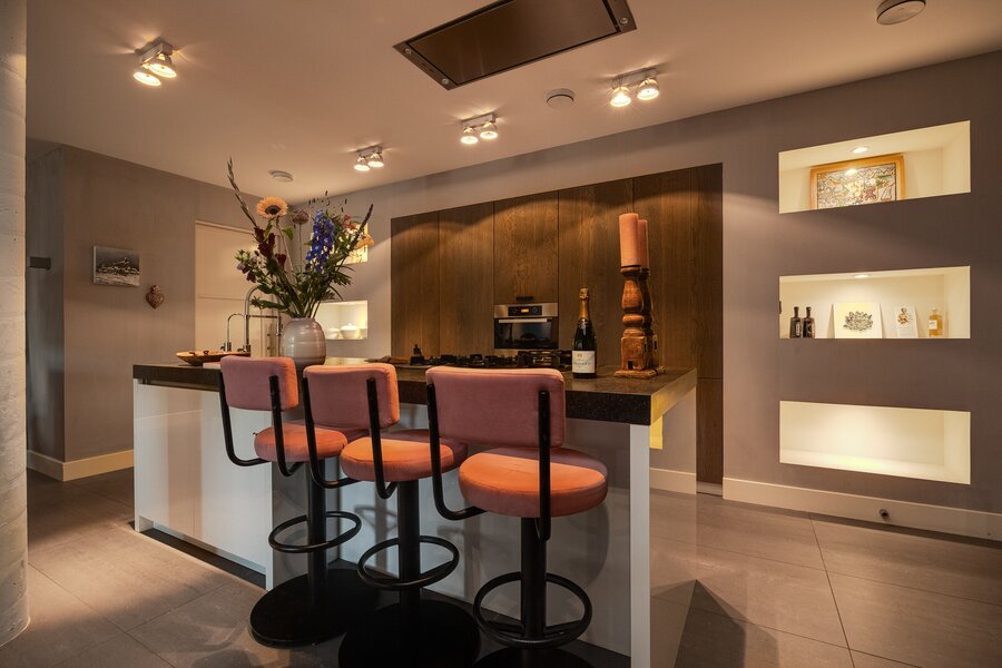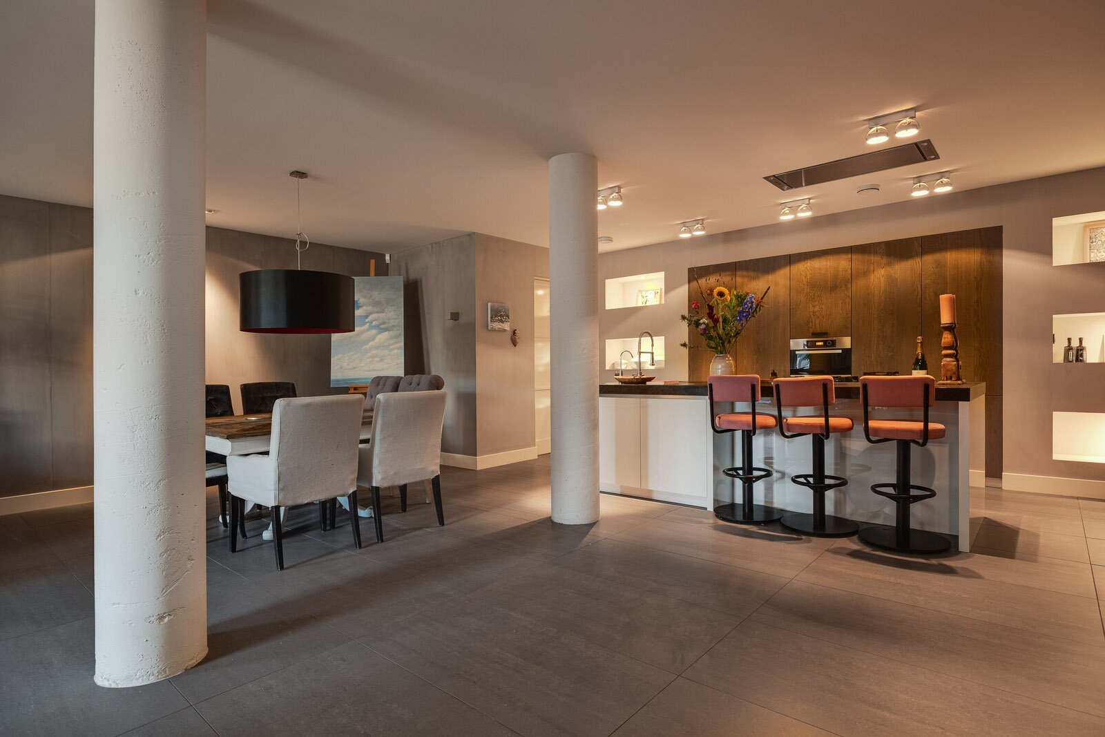 De fraaie moderne keuken is uitgevoerd met o.a. de navolgende inbouwapparatuur: afzuigkap geïntegreerd in het plafond met verlichting, spoelbak met mengkraan, Quooker, vijf pits gasfornuis met wokbrander, hetelucht oven met combi-magnetron, vaatwasser en een koelkast en vriezer. De keuken is opgesplitst in een kookeiland voorzien van strak in hoogglans witte greeploze kasten alsmede een vaste achterwand in hout look. Mooie details zijn o.a. de subtiele baropstelling en de schappen voorzien van verlichting.