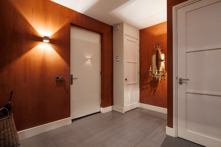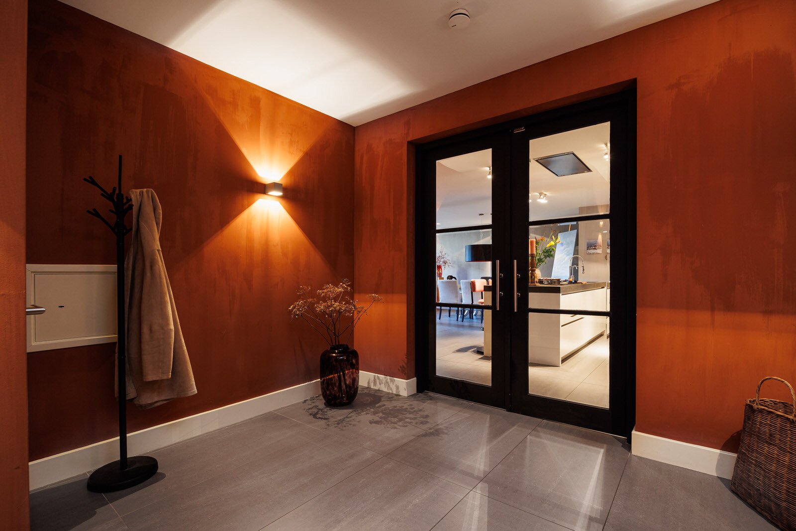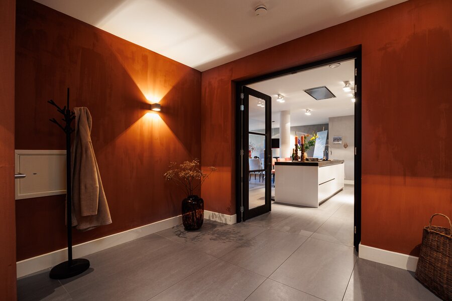 Ruime entree voorzien van strak gestucte wanden en plafonds alsmede een stoere grote tegel op de vloer welke in nagenoeg het gehele appartement is doorgelegd. Ter hoogte van de entree bevindt zich ook het (gasten) toilet met fonteintje. Middels de dubbele openslaande taatsdeuren, voorzien van glas en uitgevoerd in een zwarte look, is de woonkeuken/living bereikbaar.