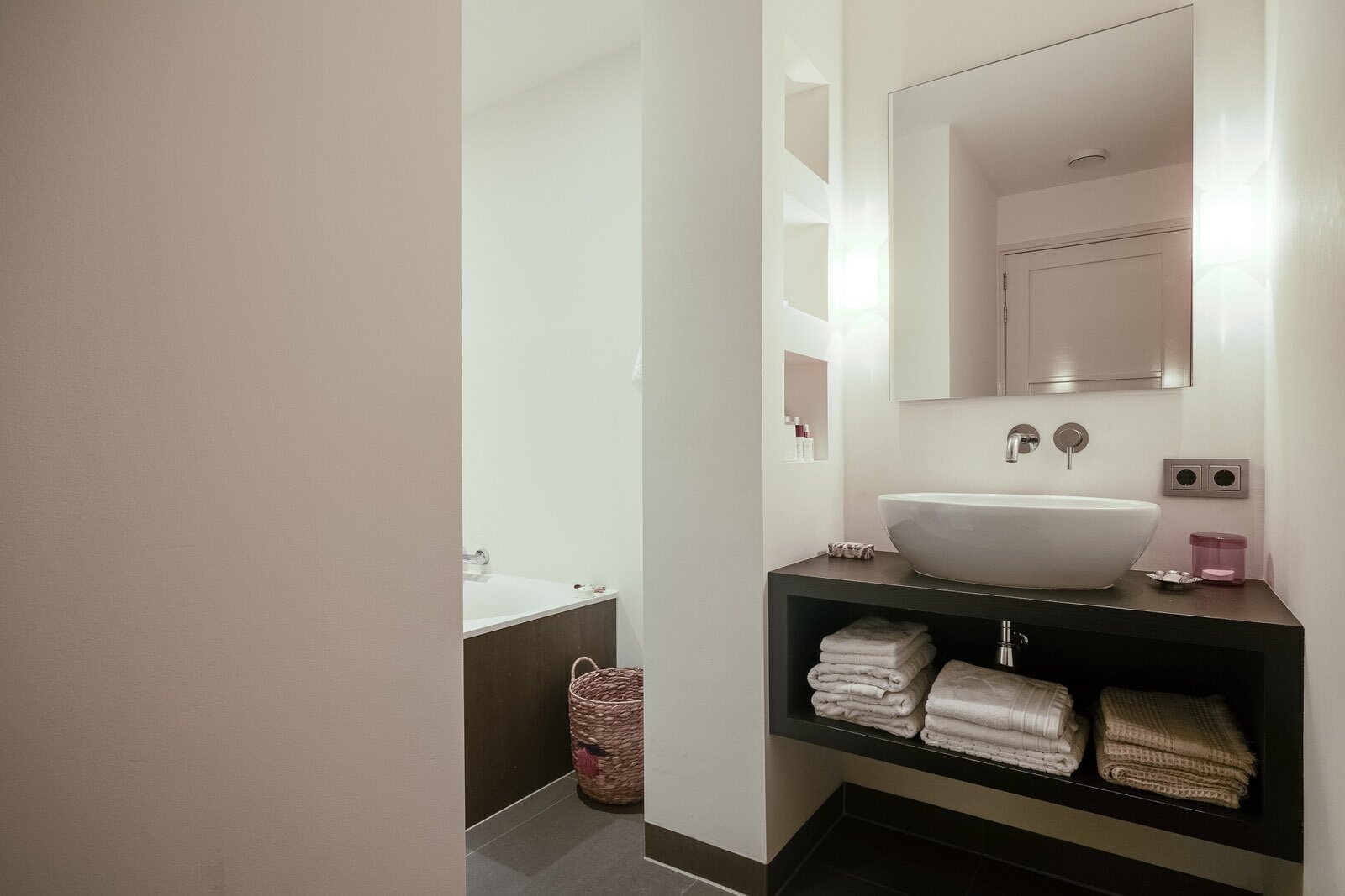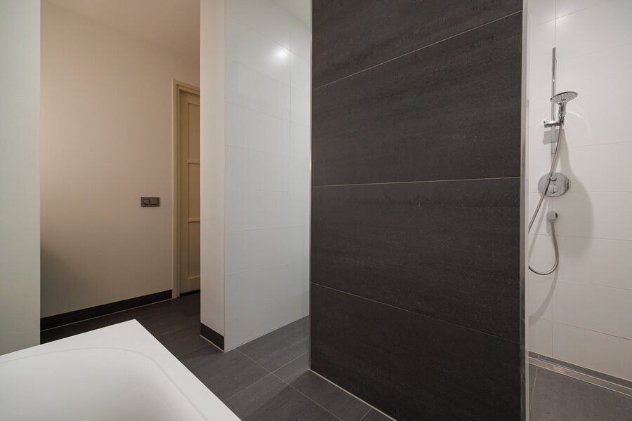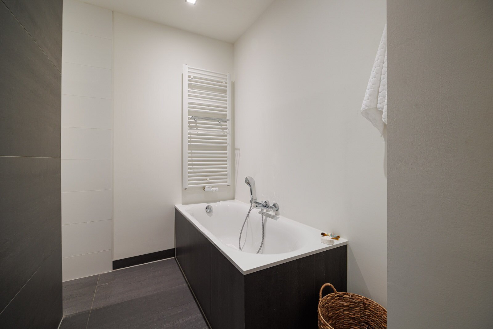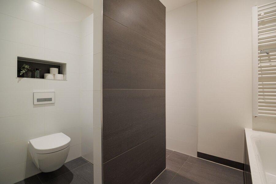 Riant en modern is de badkamer, uitgevoerd met een ligbad, inloopdouche voorzien van rainshower met handdouche, een hangtoilet alsmede een riant meubel met spiegel en een designradiator.