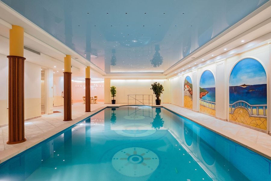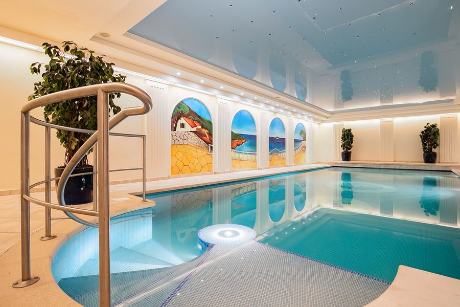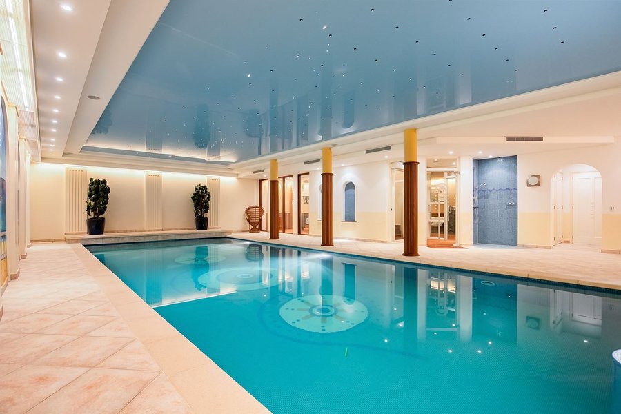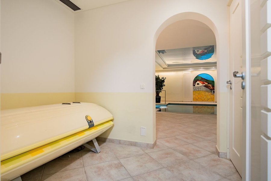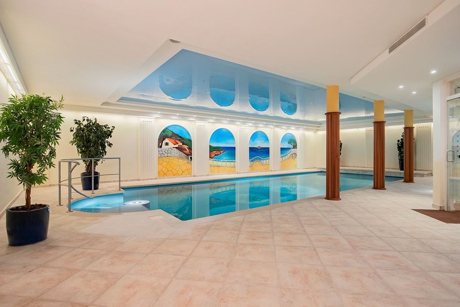 Een tweede deur leidt naar het binnenzwembad met onderwaterverlichting, een sterrenhemel, iconische afbeeldingen rondom, radio- en soundmachine en een elektrisch bedienbaar dek. Kortom: een ideaal ontspanningsoord Rondom het zwembad is ruimte voor diverse zitjes. In deze ruimte is ook een douche aanwezig en een nis voor de eventuele opstelling van een zonnebank. Vanuit het zwembadgedeelte zijn een toilet, een kleedkamer en de machinekamer bereikbaar. In deze machinekamer zijn niet alleen de pompen, filters en andere zwembadvoorzieningen te vinden, maar is ook het hart van het Domotica-systeem opgesteld.