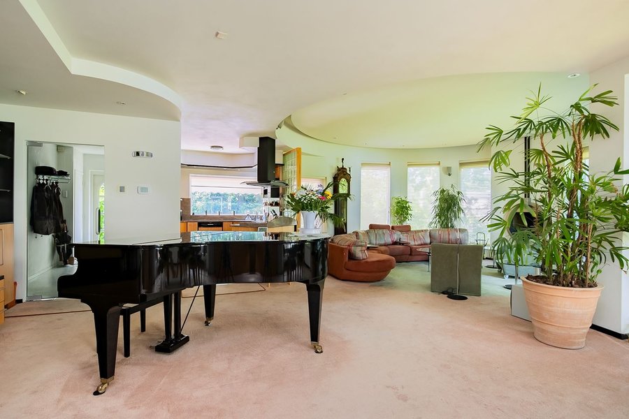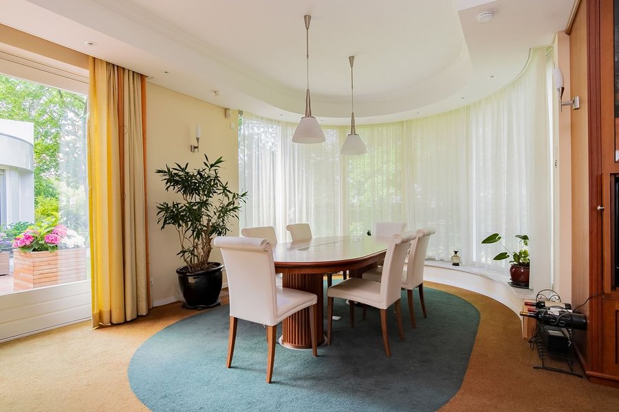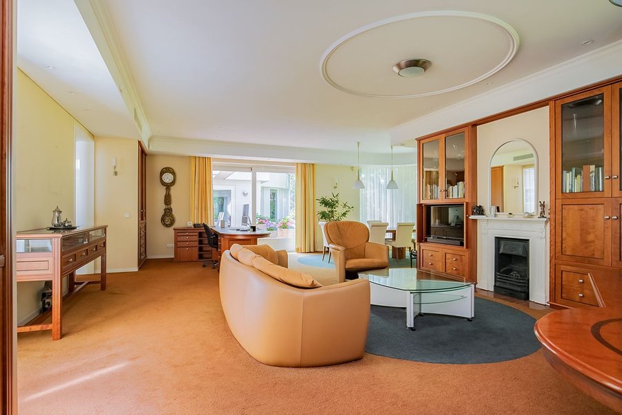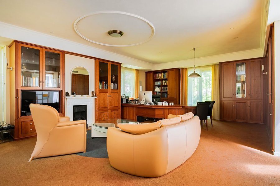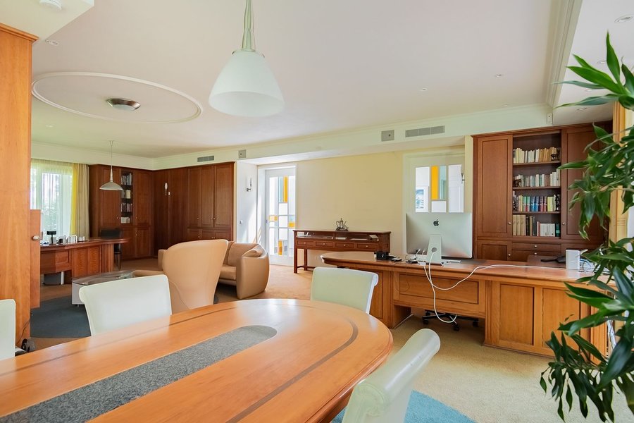Het zeer luxe kantoorgedeelte (op de plattegrond: woonkamer) ligt aan de rechterzijde van deze gang en heeft 2 doorgangen (met deuren die in de muur schuiven) naar de centrale gang en biedt toegang tot het overdekte terras. Deze ruimte is voorzien van exclusief, handgemaakt meubilair van red cederhout evenals de kastenwanden, met o.a. een inbouw koelkast, dito magnetron, wasbak met kraan, enz… De bureaus en de vergadertafel zijn tevens op maat gemaakt en van een uniek ontwerp. Vanuit de ronde erker is er fraai uitzicht op de tuin.