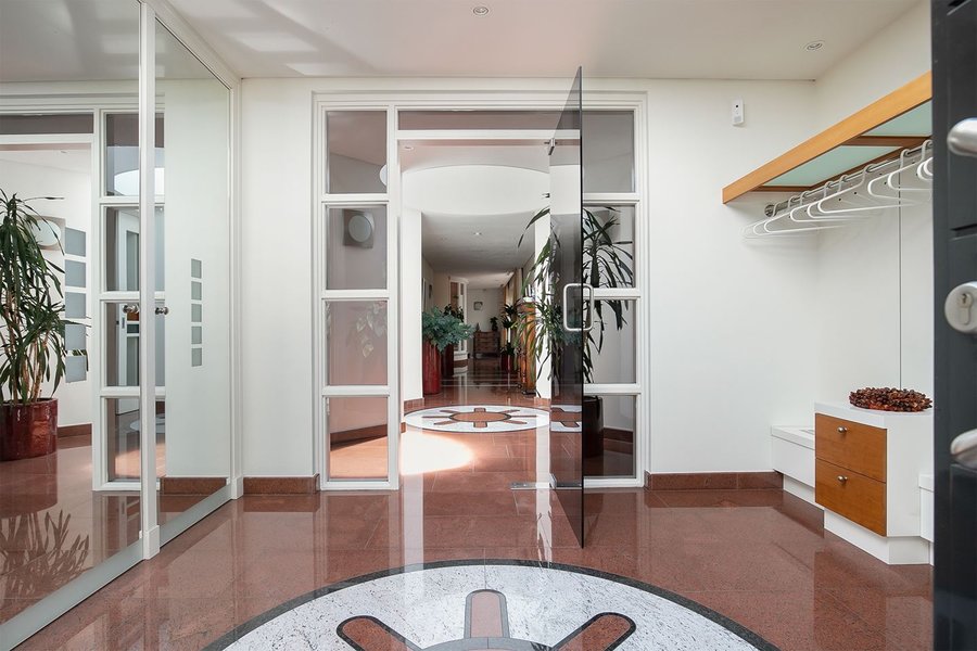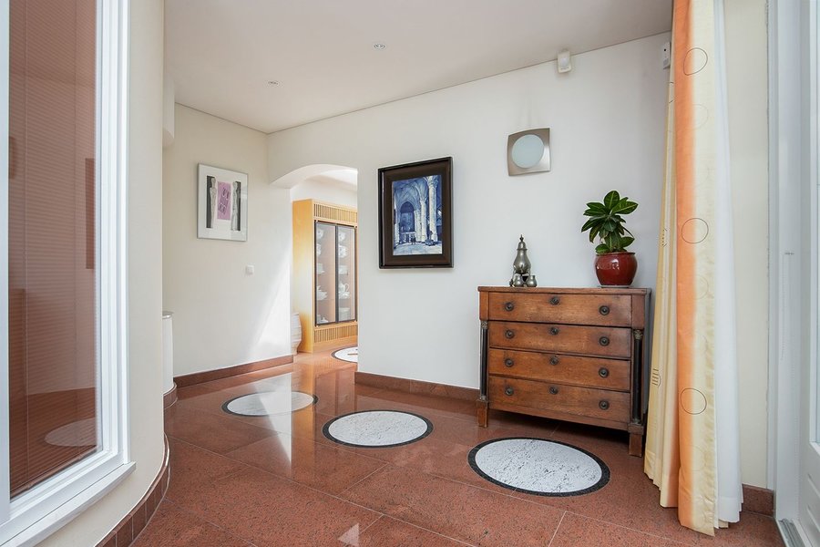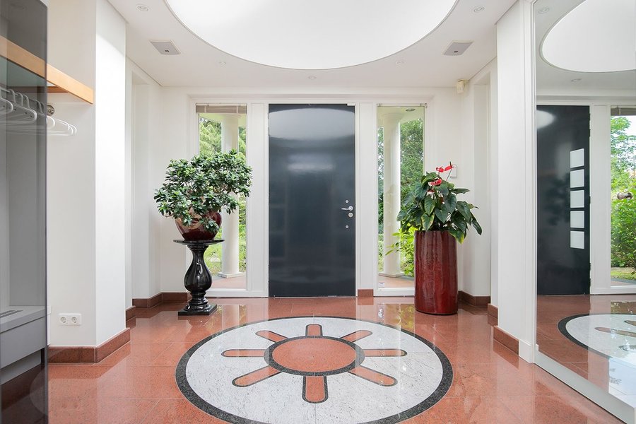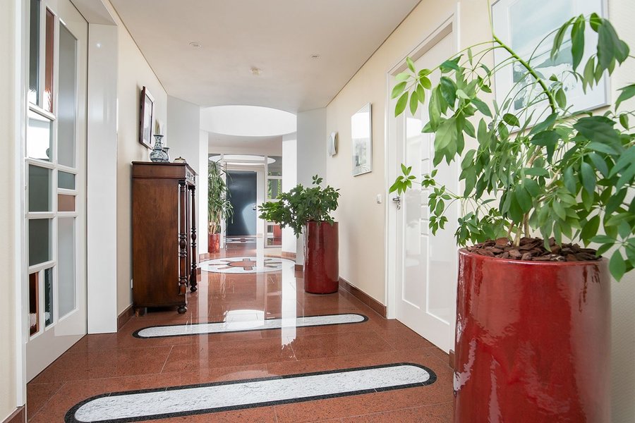 Royale entree/hall met meterkast, garderobe, een grote lichtkoepel en toegang tot een lange brede, centrale gang. Deze gang is de verbinding tussen het slaap/woongedeelte en het zeer luxueuze kantoorgedeelte. De centrale gang is voorzien van Indian Red graniet met fraaie inleg met een voorname en warme uitstraling.