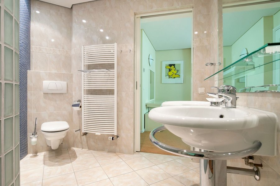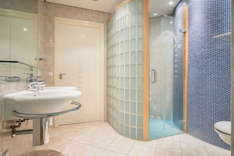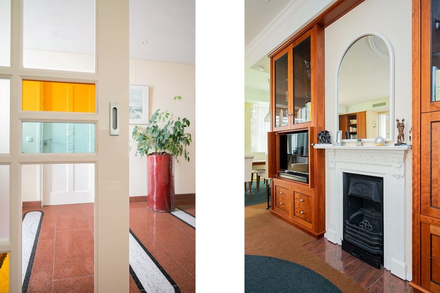 Fraaie tegelvloeren (o.a. Indian Red graniet) en wand- en plafondafwerkingen.