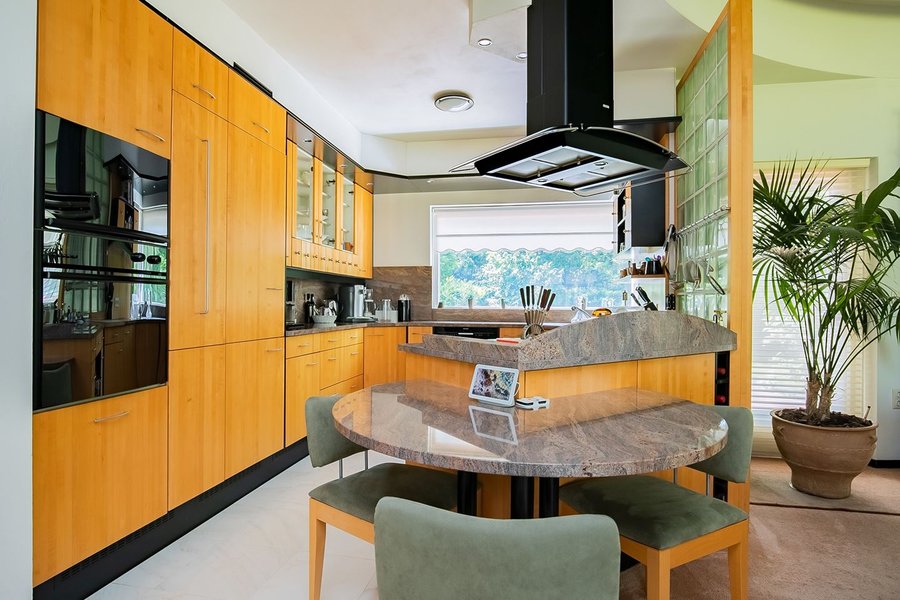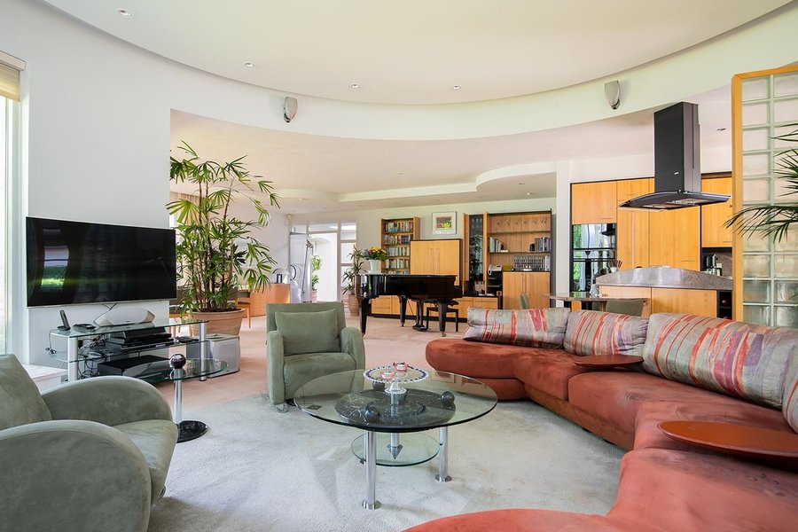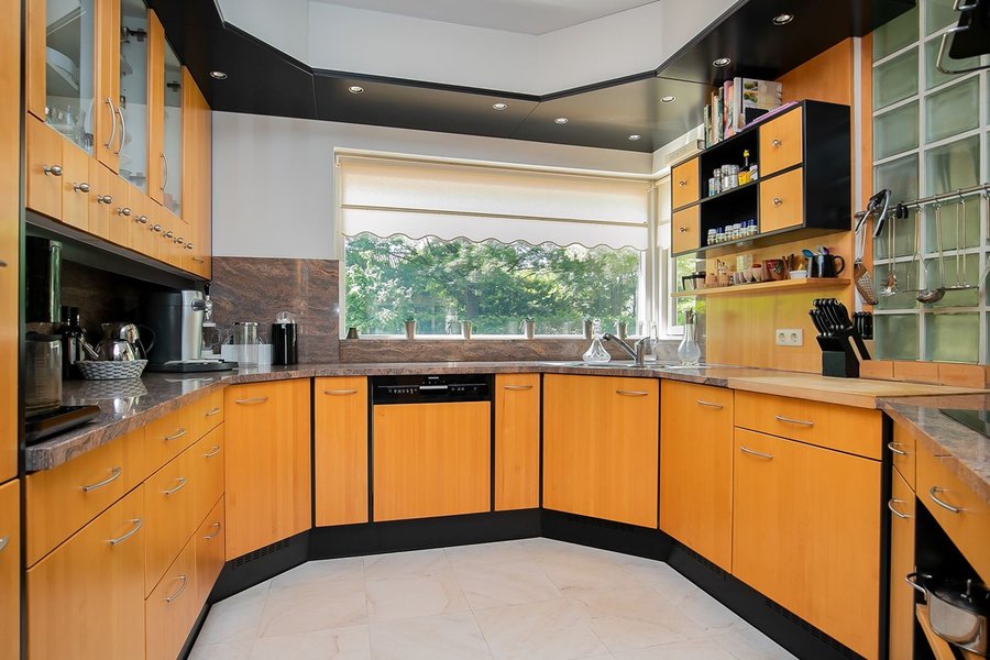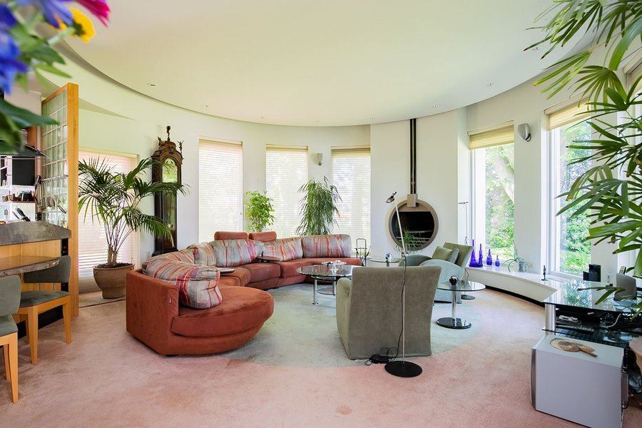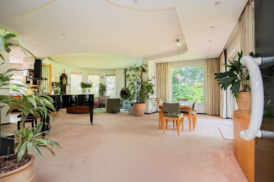 De woonkamer met open keuken en de eetkamer zijn ruim en licht. De woonkamer beschikt over een design haard en een ronde erker. De goed geoutilleerde keuken biedt een fraai uitzicht over de tuin. Vanuit de woonkamer is er zicht op de tuin, de vijver en het overdekte terras.