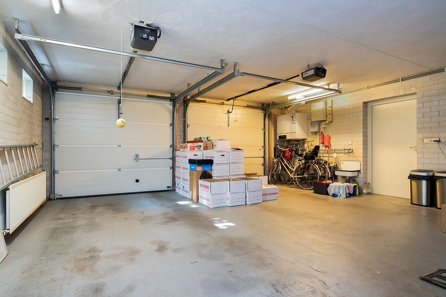 Vanuit de woonkamer is een hal bereikbaar (tweede entree) met garderobe, die toegang biedt tot de enorme dubbele, inpandige garage, geschikt voor 2 auto’s. Verder biedt de woonkamer toegang tot het overdekte terras.